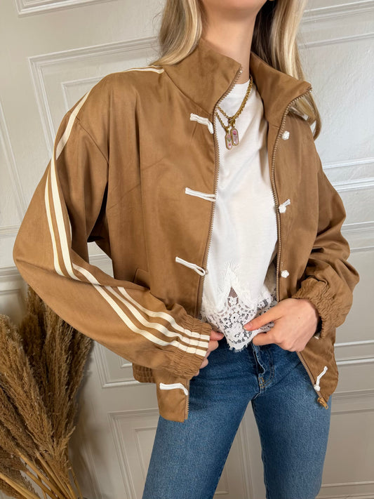 Giacca alamari suede - TensioneInGiacca in suede modello a collo alto. Dettaglio di bande laterali....
