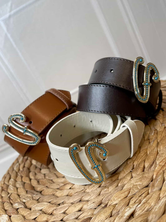 Cintura “V” strass - Vicolo Cintura in pelle con fibbia oro con logo “V” e strass azzurriLunghezza...