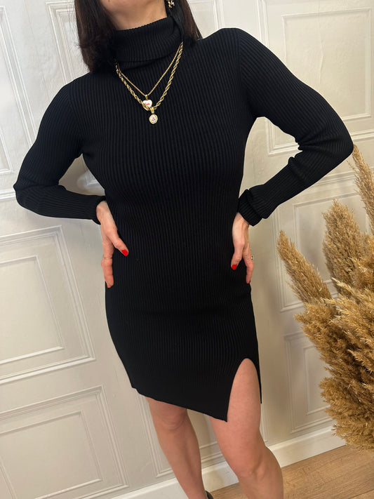 Abito dolcevita con spacco - Kontatto DescrizioneAbito in maglia a costine con spacco. Modello girocollo leggermente aderente...