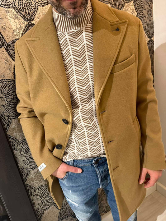 Cappotto cammello - BernaDescrizioneCappotto colore cammello monopetto chiusura con bottoni. Collo a lancia.Vestibilità regolare.COMPOSIZIONE: 100% poliestere