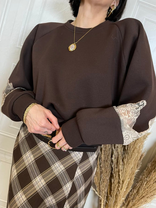 Felpa inserto pizzo - VicoloFelpa tinta unita. Modello felpato e a girocollo, manica lunga baloon...