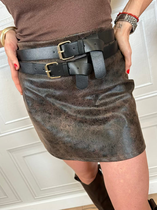 Longuette ecopelle doppia cintura - HaveoneLonguette in ecopelle effetto crosta in colore moro.Modello svasato sul fondo con...
