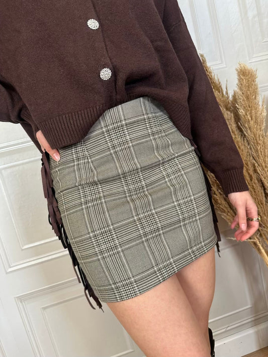 Minigonna check frange - Kikisix Gonna fantasia check sui toni del moro, nero, cammello. Modello con zip...