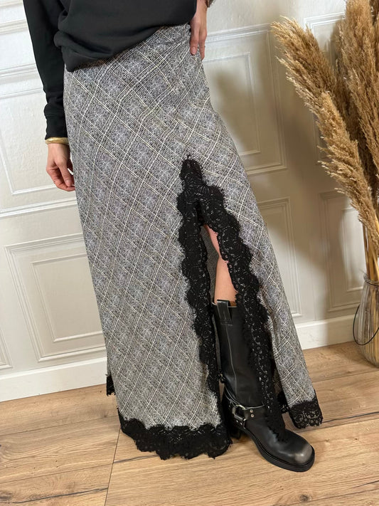 Gonna lunga spacco pizzo - HaveoneGonna lunga a fantasia check sui toni del nero, bianco. Dettaglio di...
