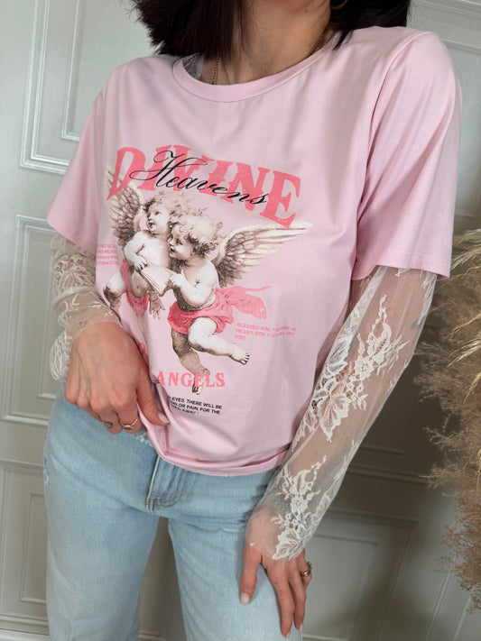T-shirt angioletti - SusyMix T-shirt girocollo in cotone con stampa e manica in pizzo.Taglia unica, modello regolare.Lunghezza...