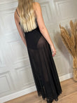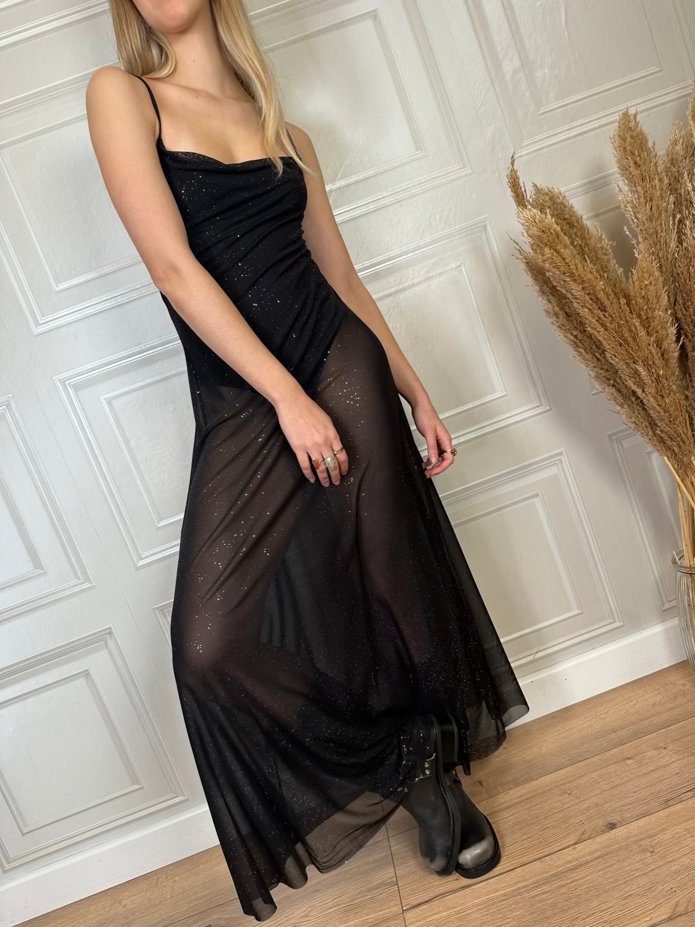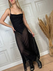 Abito lungo elasticizzato in tulle glitterato. Modello con body integrato, scollo a cascata e spalline sottili.