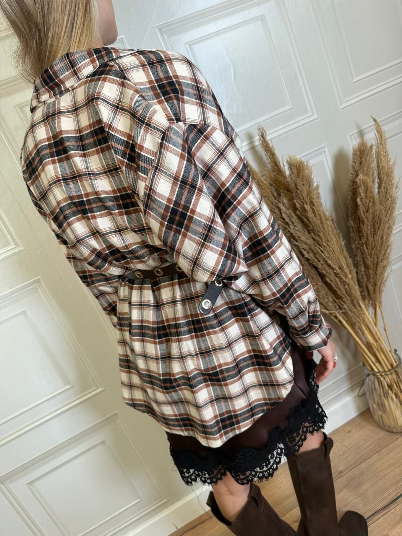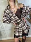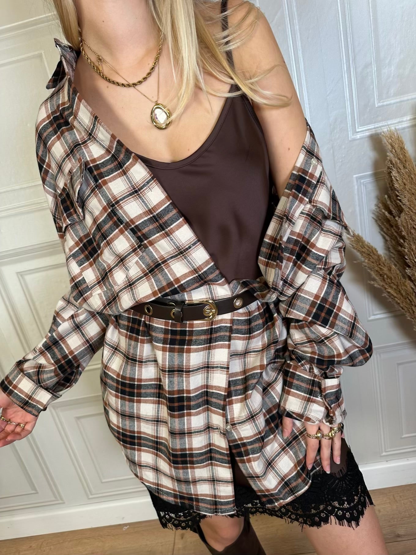 Abito chemisier in fantasia Check in flanella sui toni del mattone nero e burro. Comprensivo di altro abito in satin moro con fondo in pizzo nero. Chiusura con bottoncini frontali. Cintura con occhielli compresa. Tasche con patta frontali.