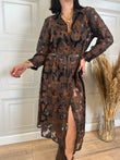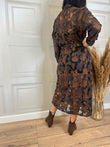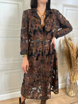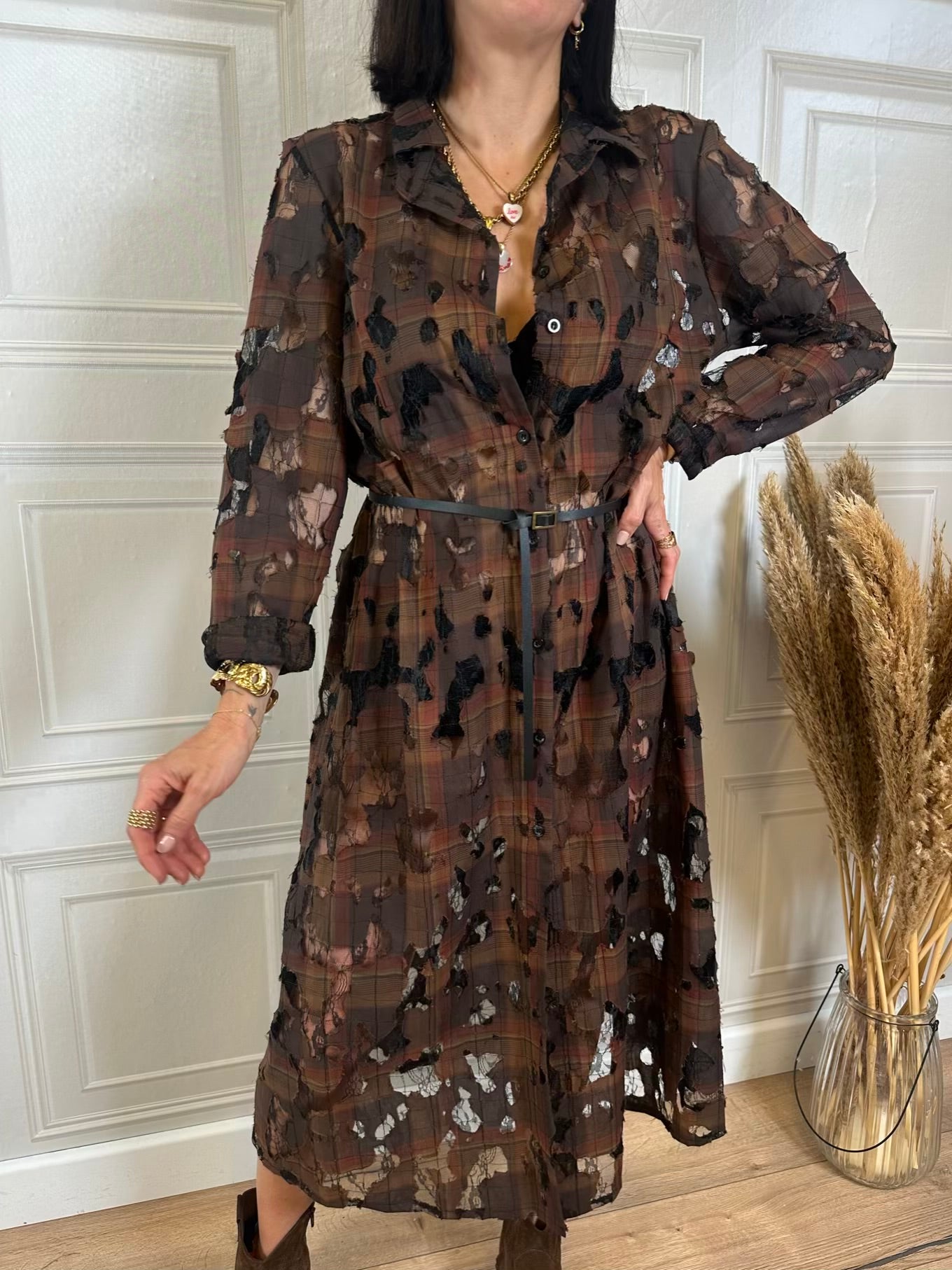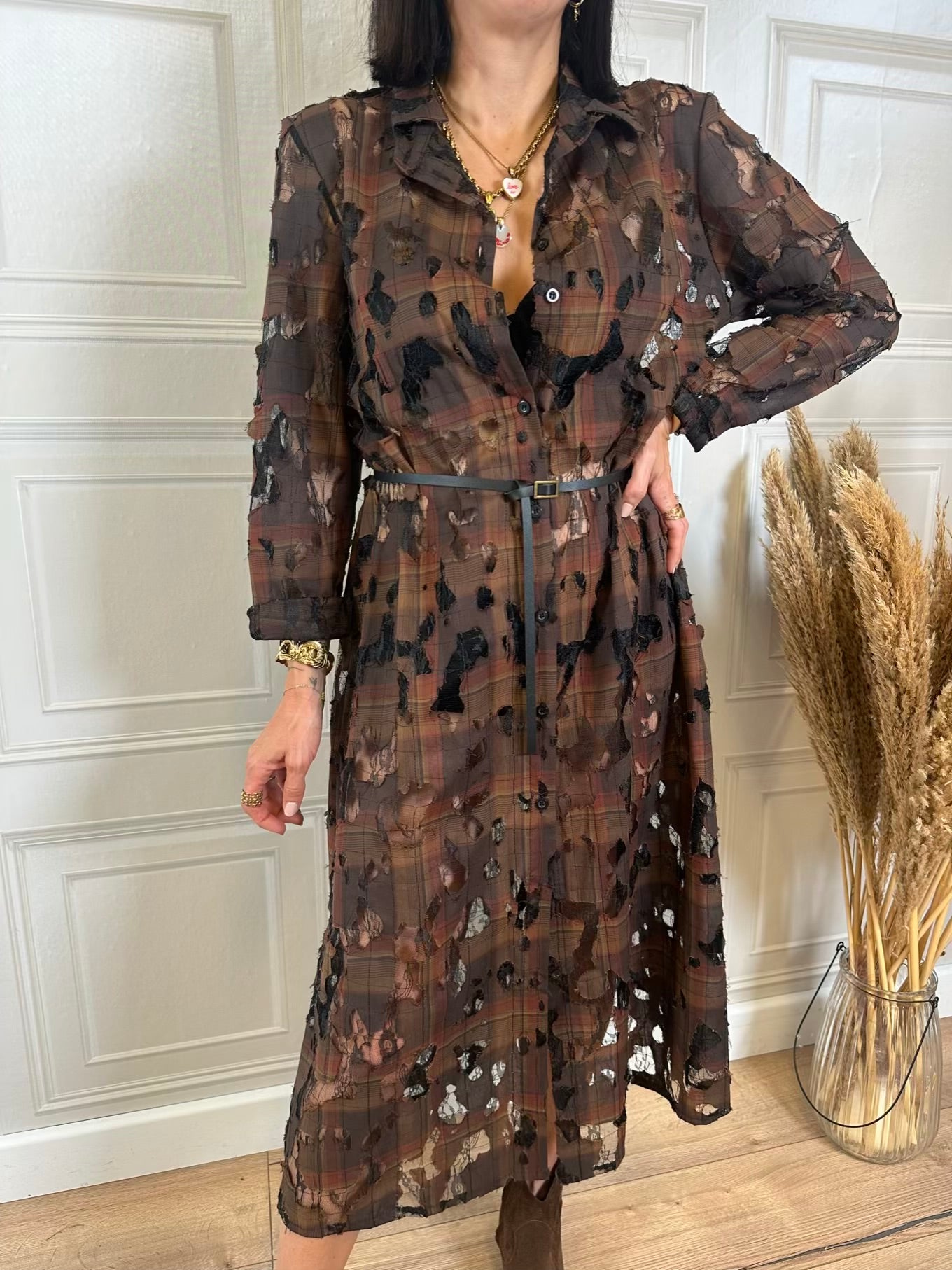 Abito lungo devore. Dettaglio di pizzo e trasparenze. Chiusura con bottoncini. Cinturina inclusa.