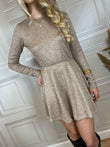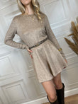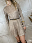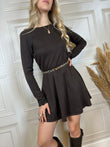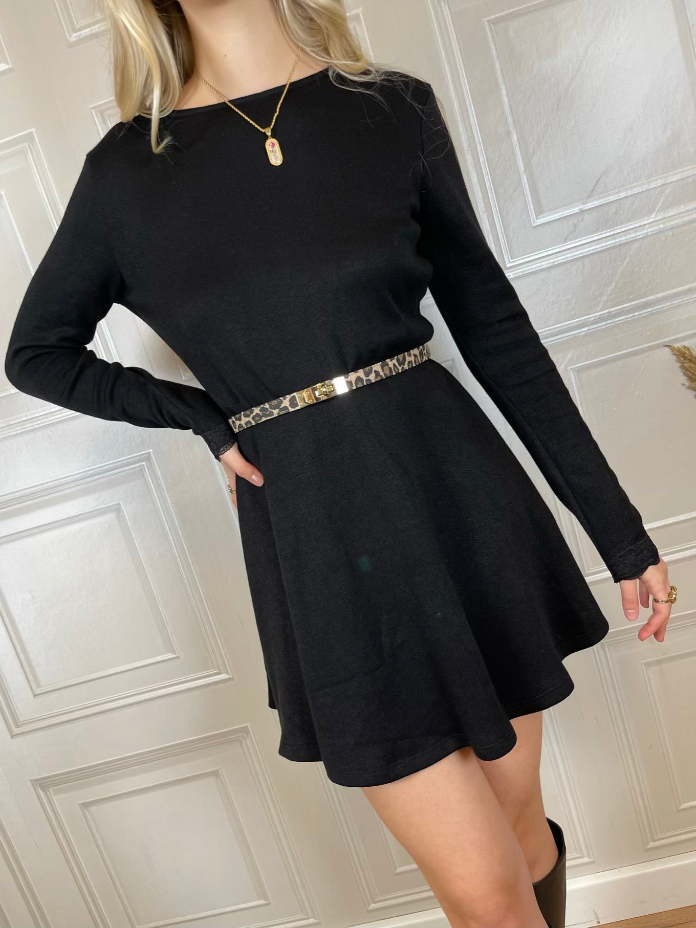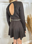 Abito in calda viscosa. Modello con oblò sul retro bordato in pizzo. Chiusura con bottoncini sul retro. Elastico in vita.