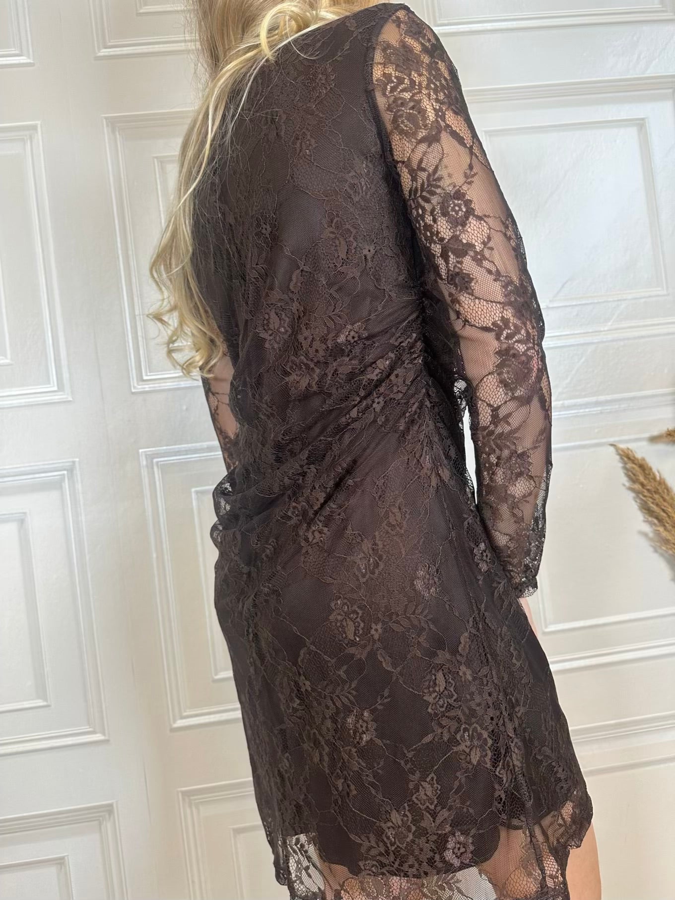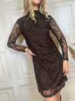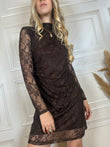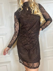 Abito in pizzo. Modello a tubino con collo a lupetto e manica lunga. Arricciature sui fianchi.