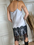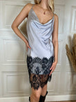 Abito lingerie in viscosa tinta unita con scollo a gronda. Modello con spallina sottile e fondo con pannello in pizzo nero.