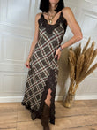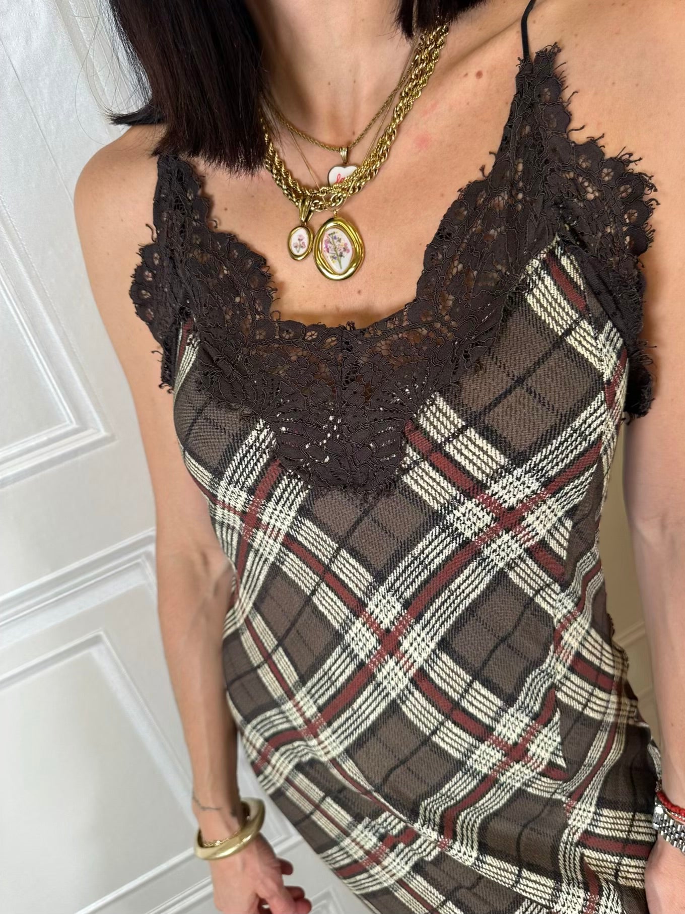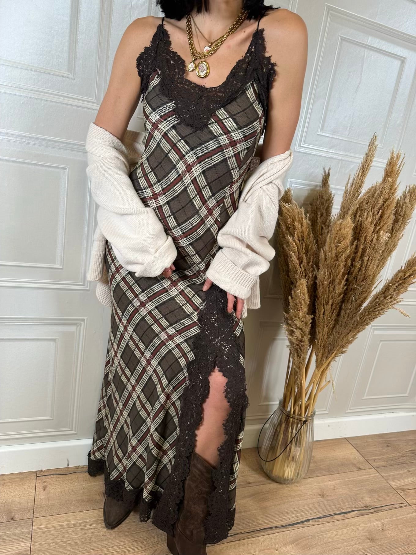 Abito lungo lingerie check con pizzo su scollo e fondo. Spacco laterale. Sui toni del moro, burro e mattone. In foto taglia S, vestibilità regolare.