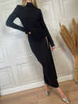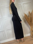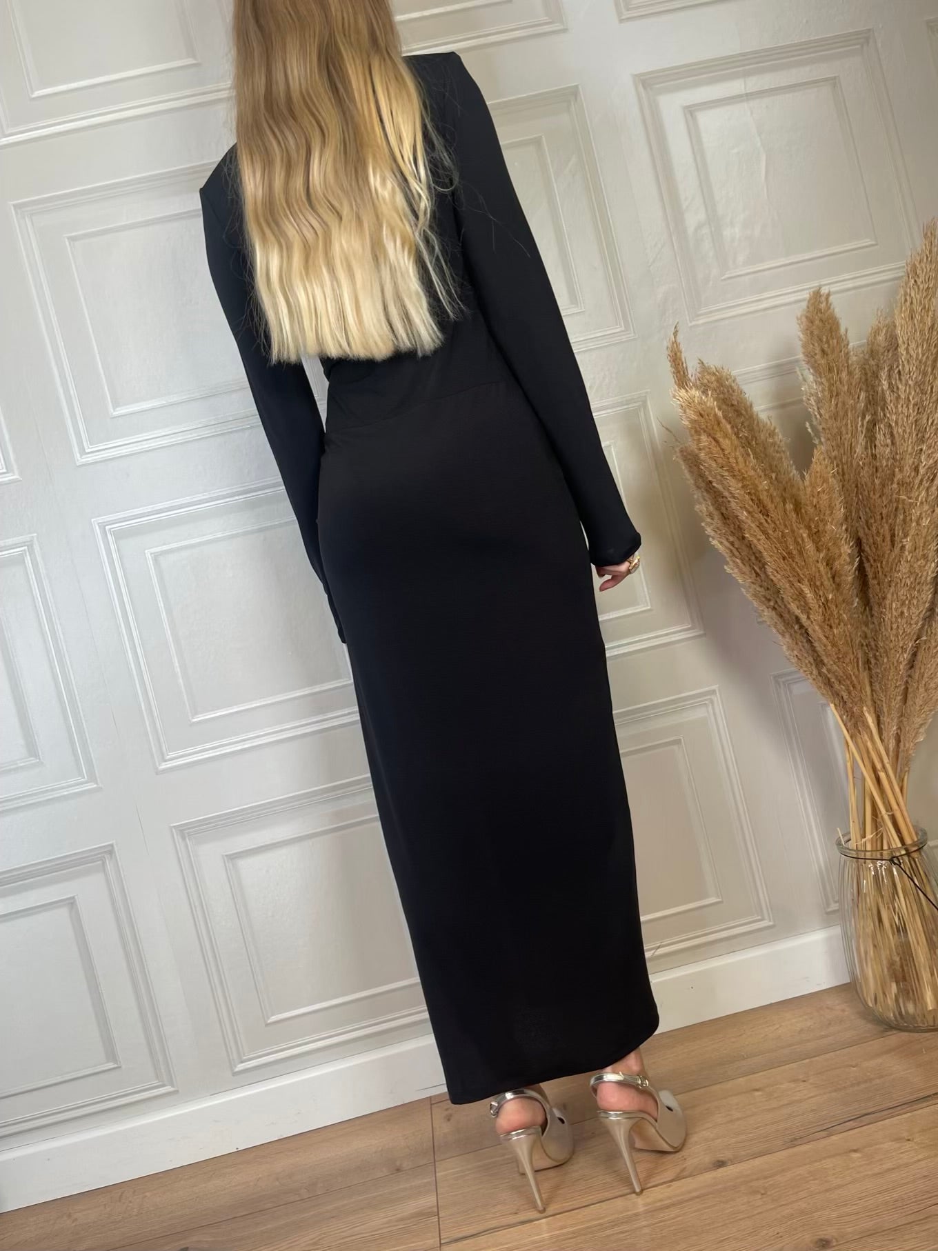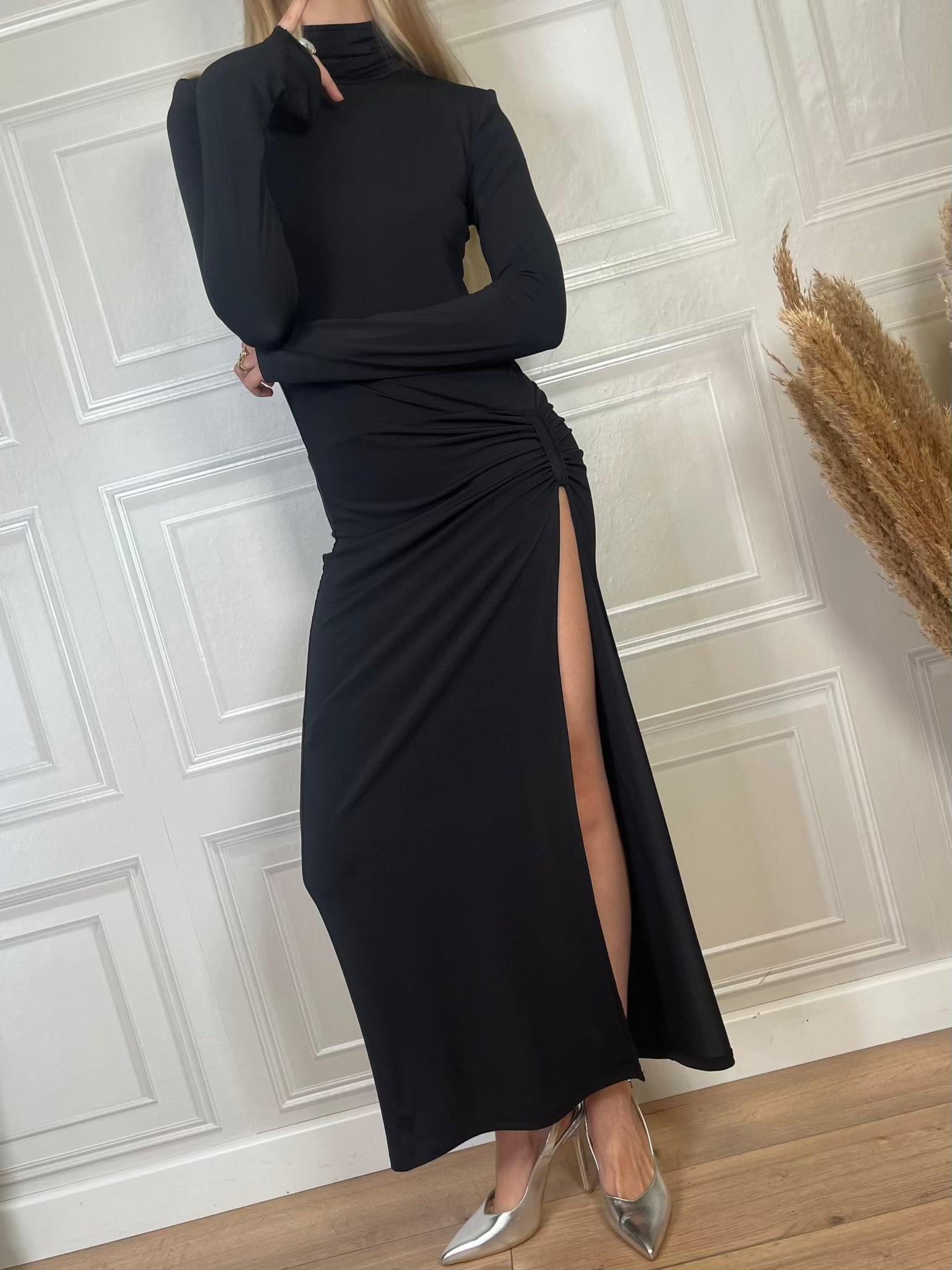 Abito lungo in tessuto nero. Modello a dolcevita con manica lunga e spalla imbottita. Ampio spacco sul lato sinistro. Ripresa su spacco.