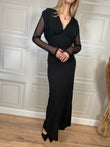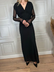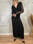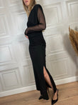 Abito lungo con spacco laterale. Scollo a V con arricciatura sulle spalline imbottite. Maniche in tulle trasparenti.