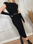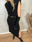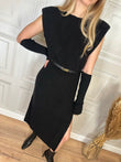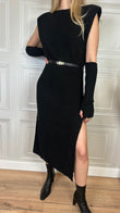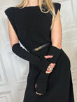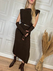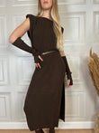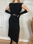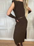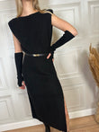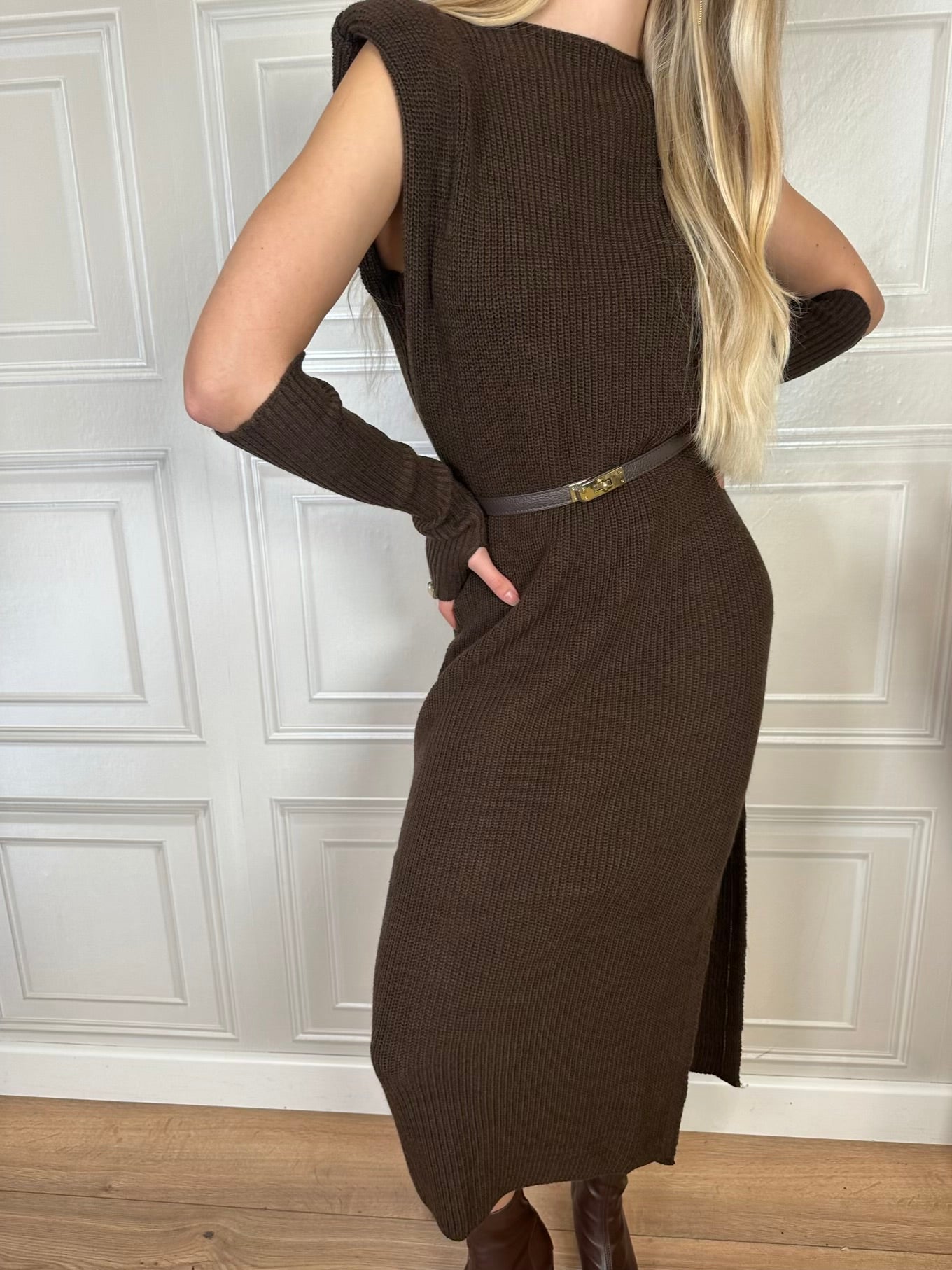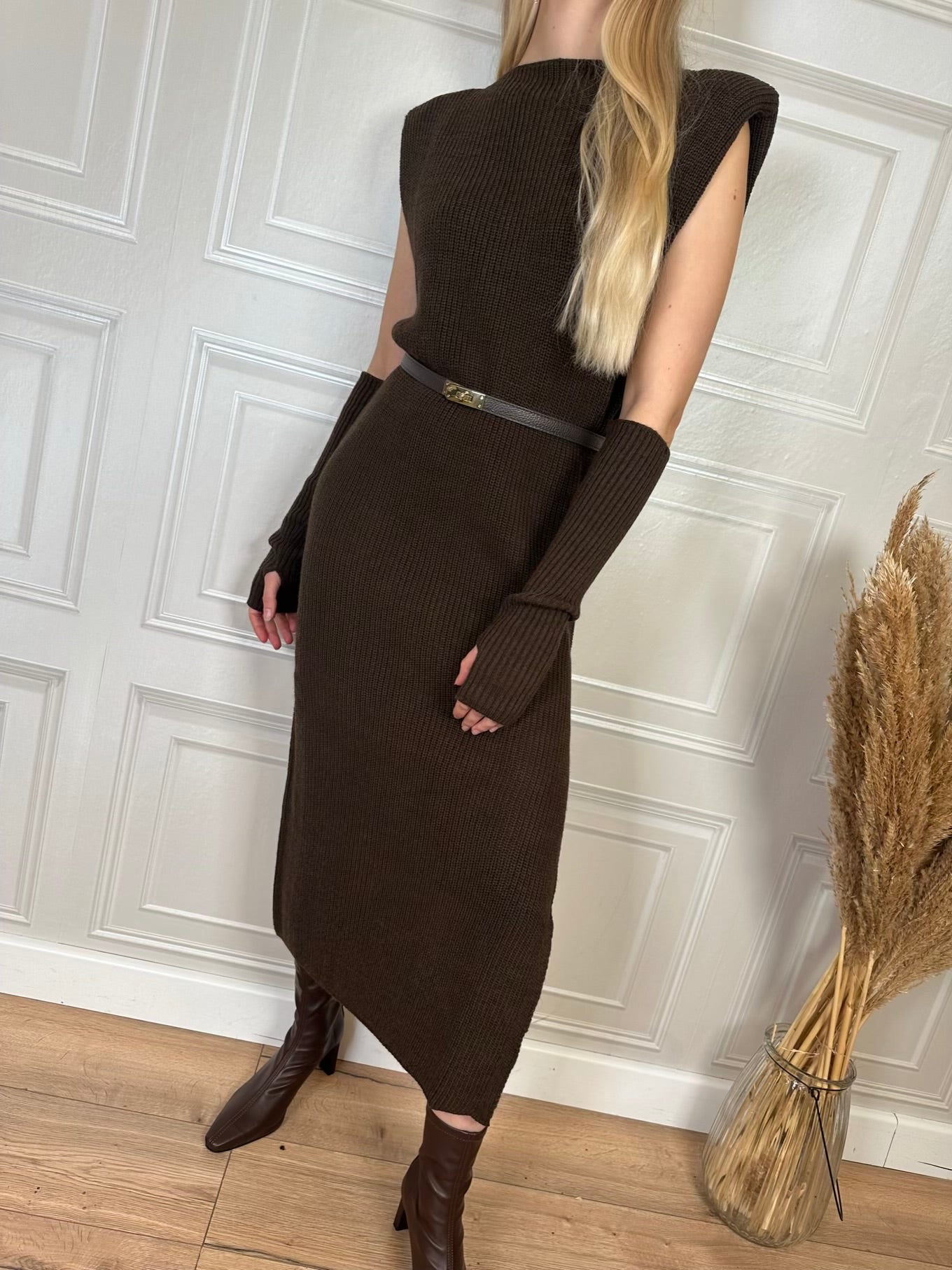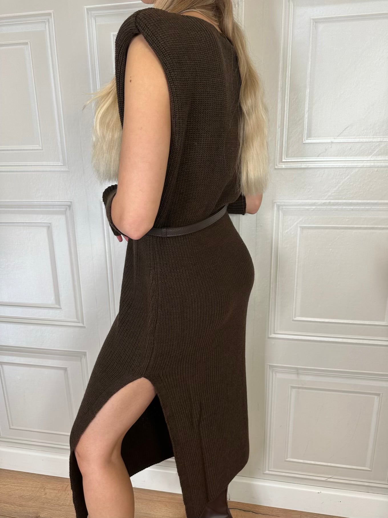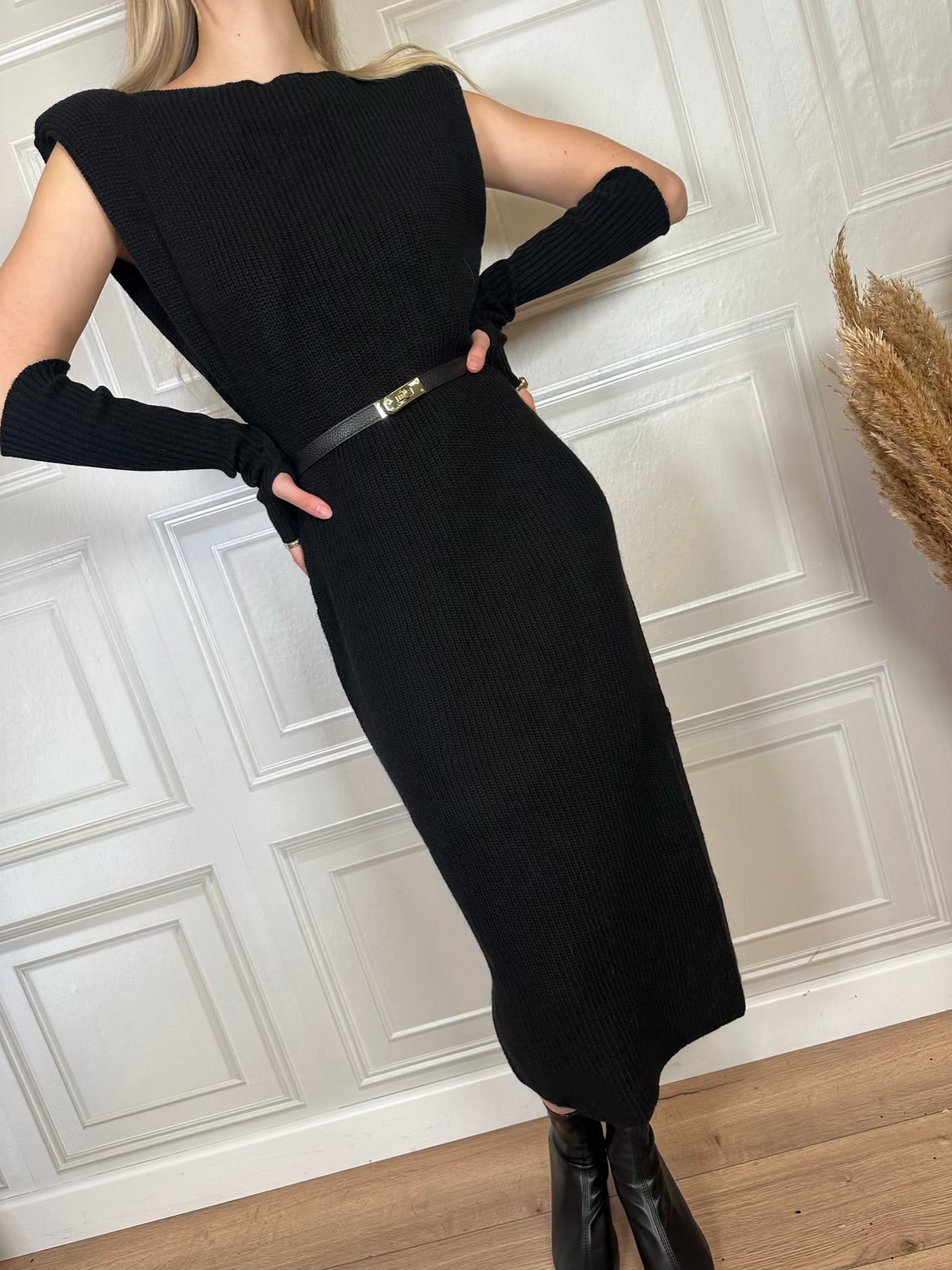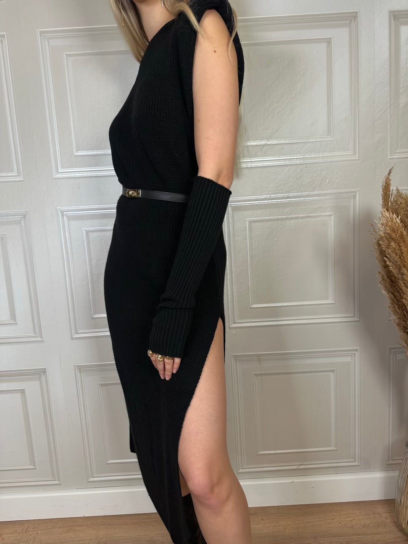 Abito lungo in maglia. Modello con manicotti, spalla imbottita e spacco laterale.