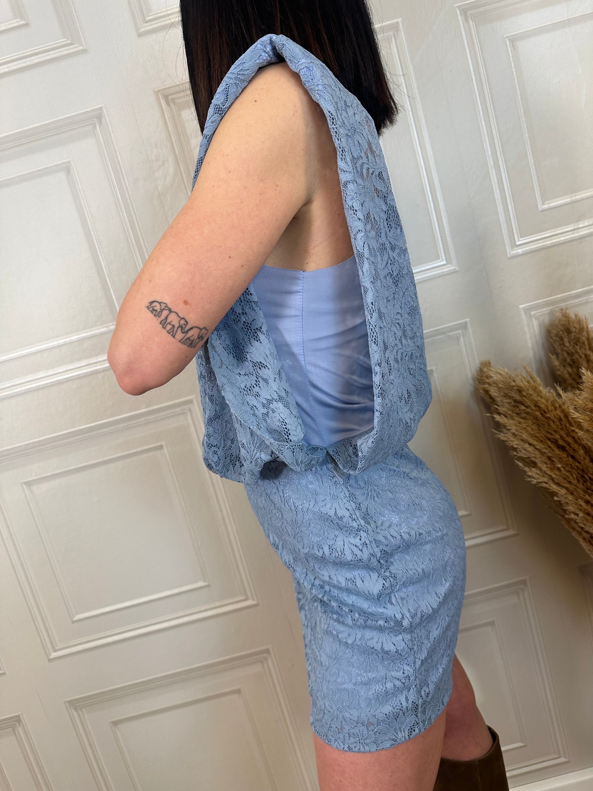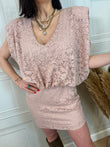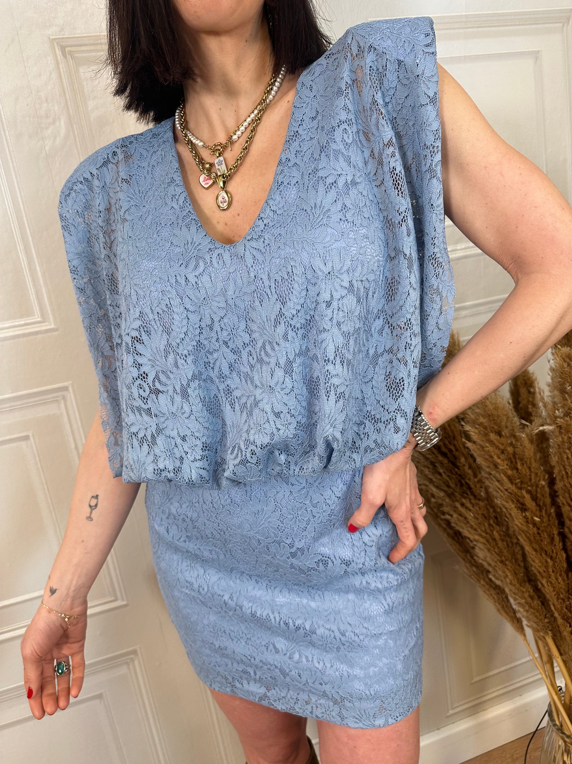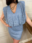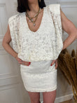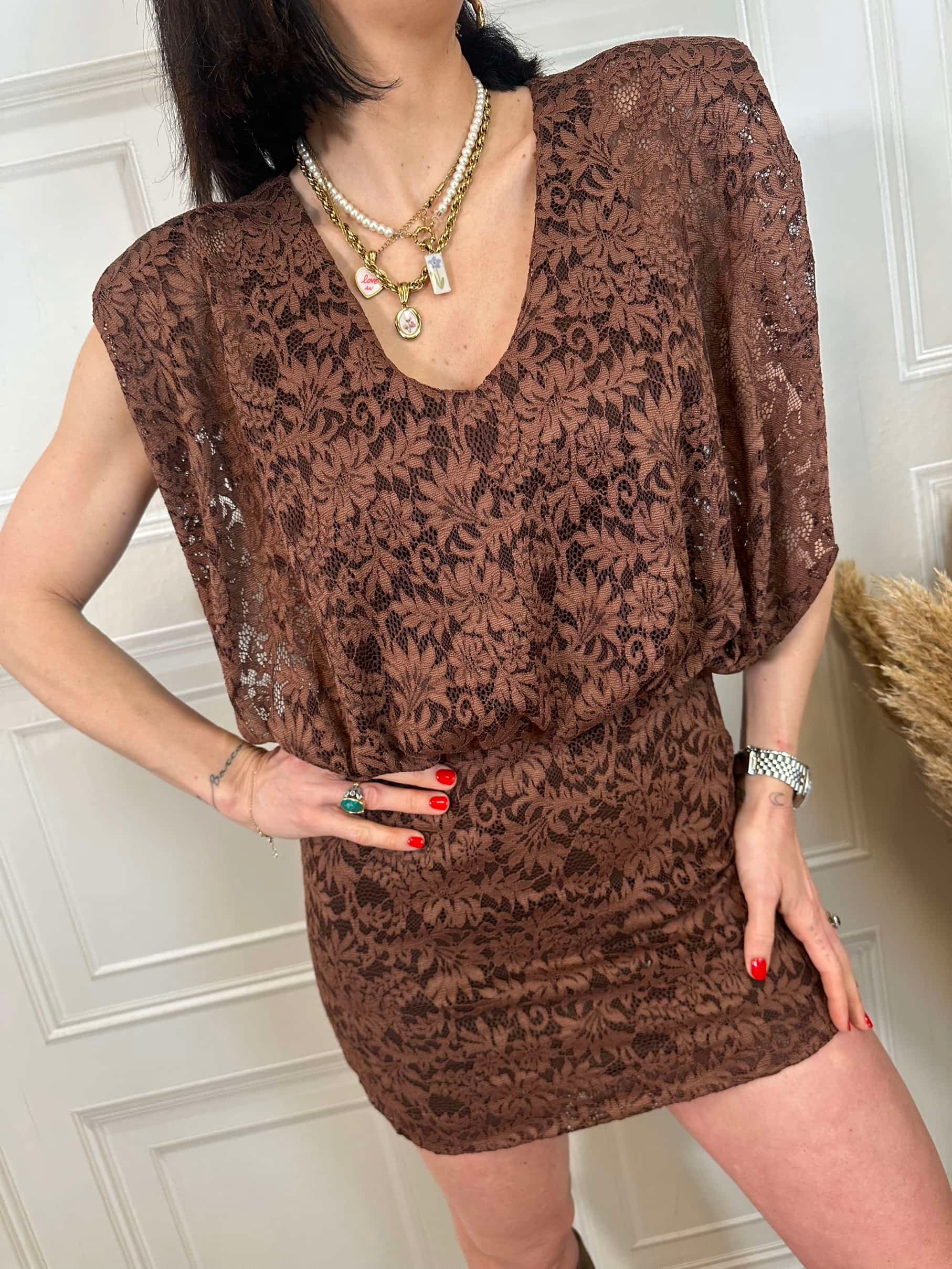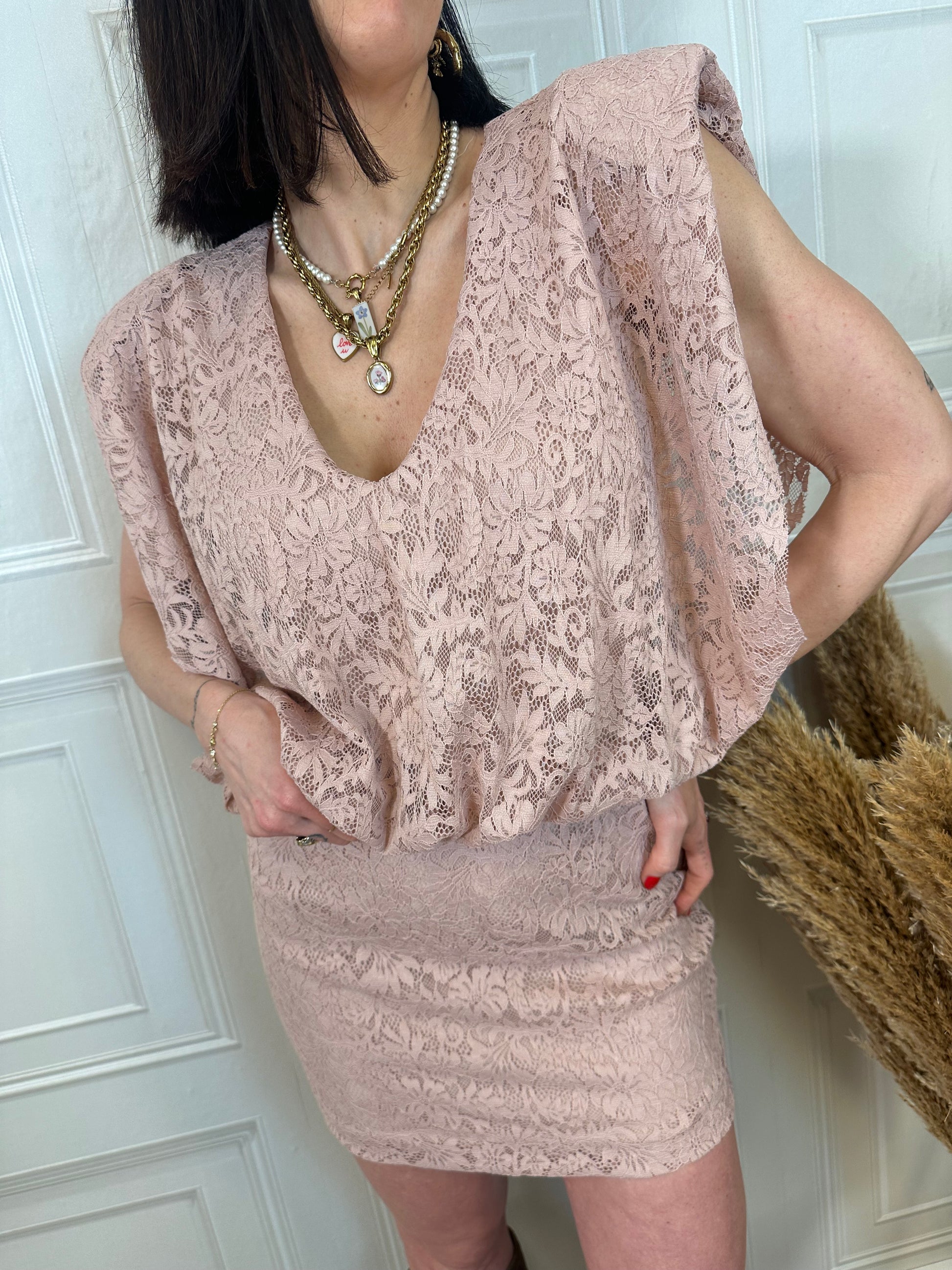 Abito in pizzo con scollo a V. Modello con spalline imbottite e gonna aderente.