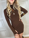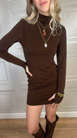 Abito dolcevita manica lunga tinta unita. Modello tubino in morbido tessuto elasticizzato con dettaglio manicotto.