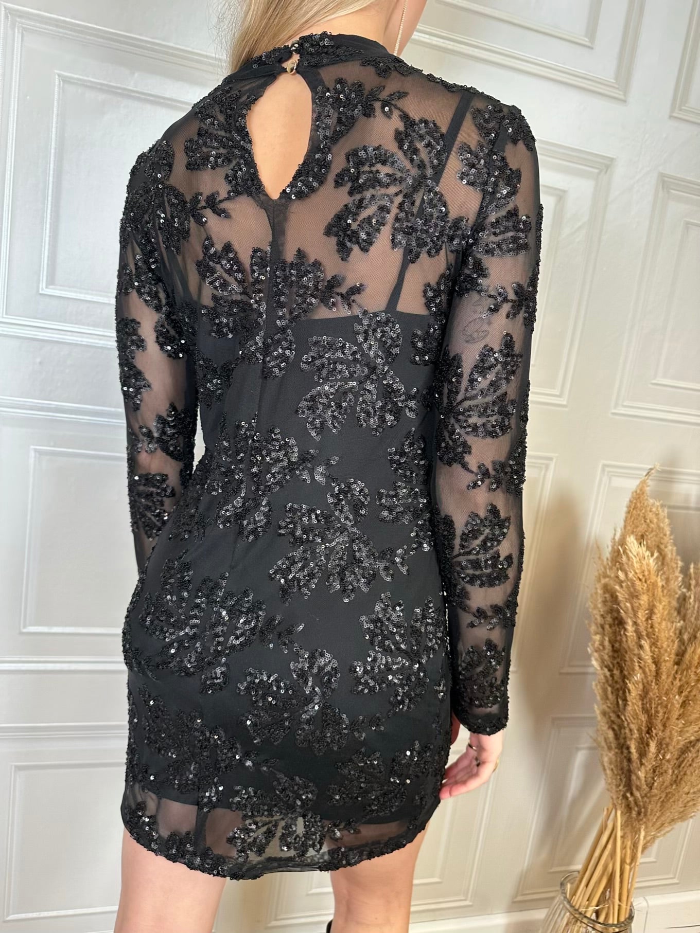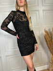 Abito corto a lupetto in tulle con ricami floreali in paillettes. Modello a manica lunga con sottoveste integrata, removibile.
