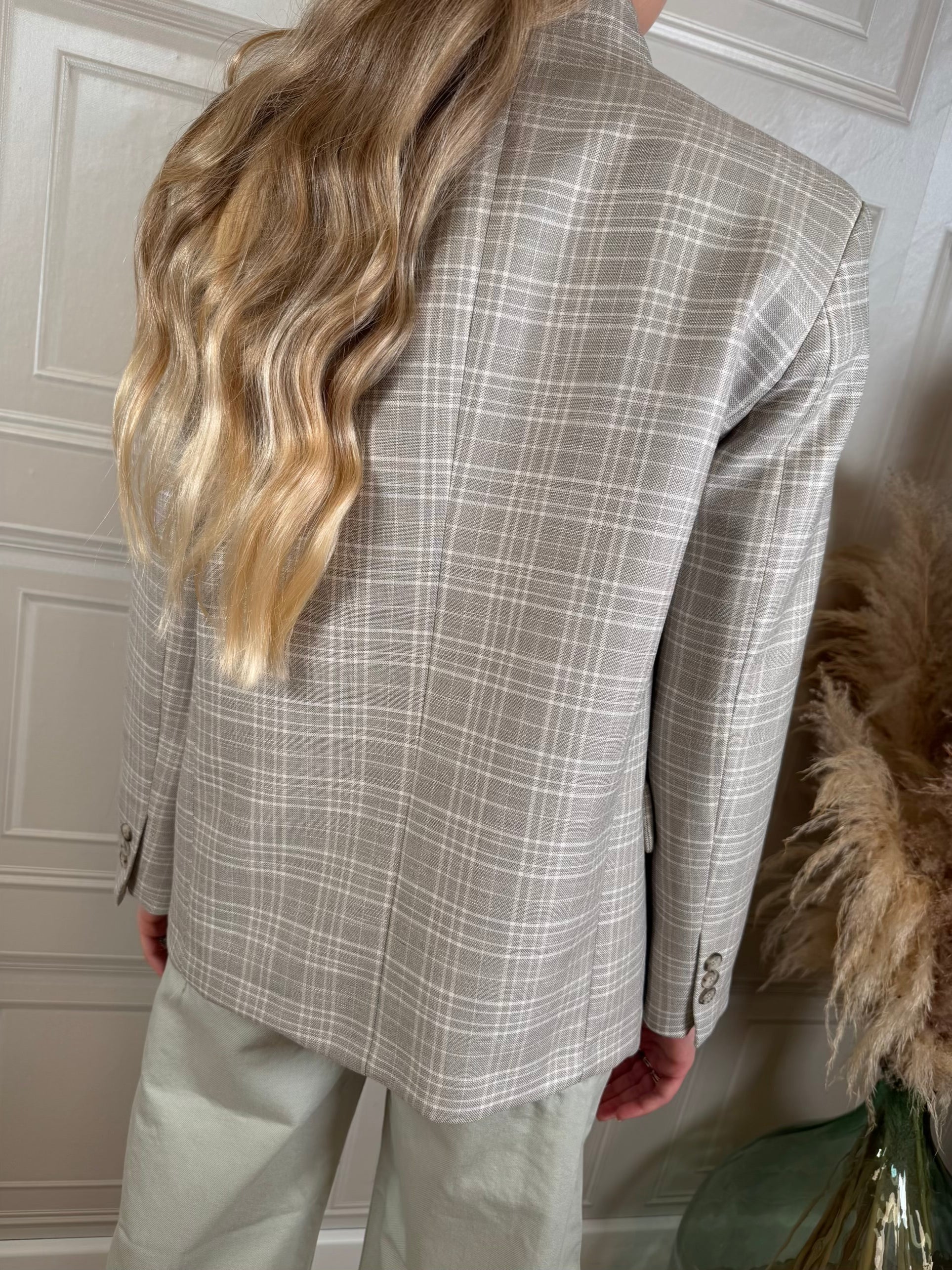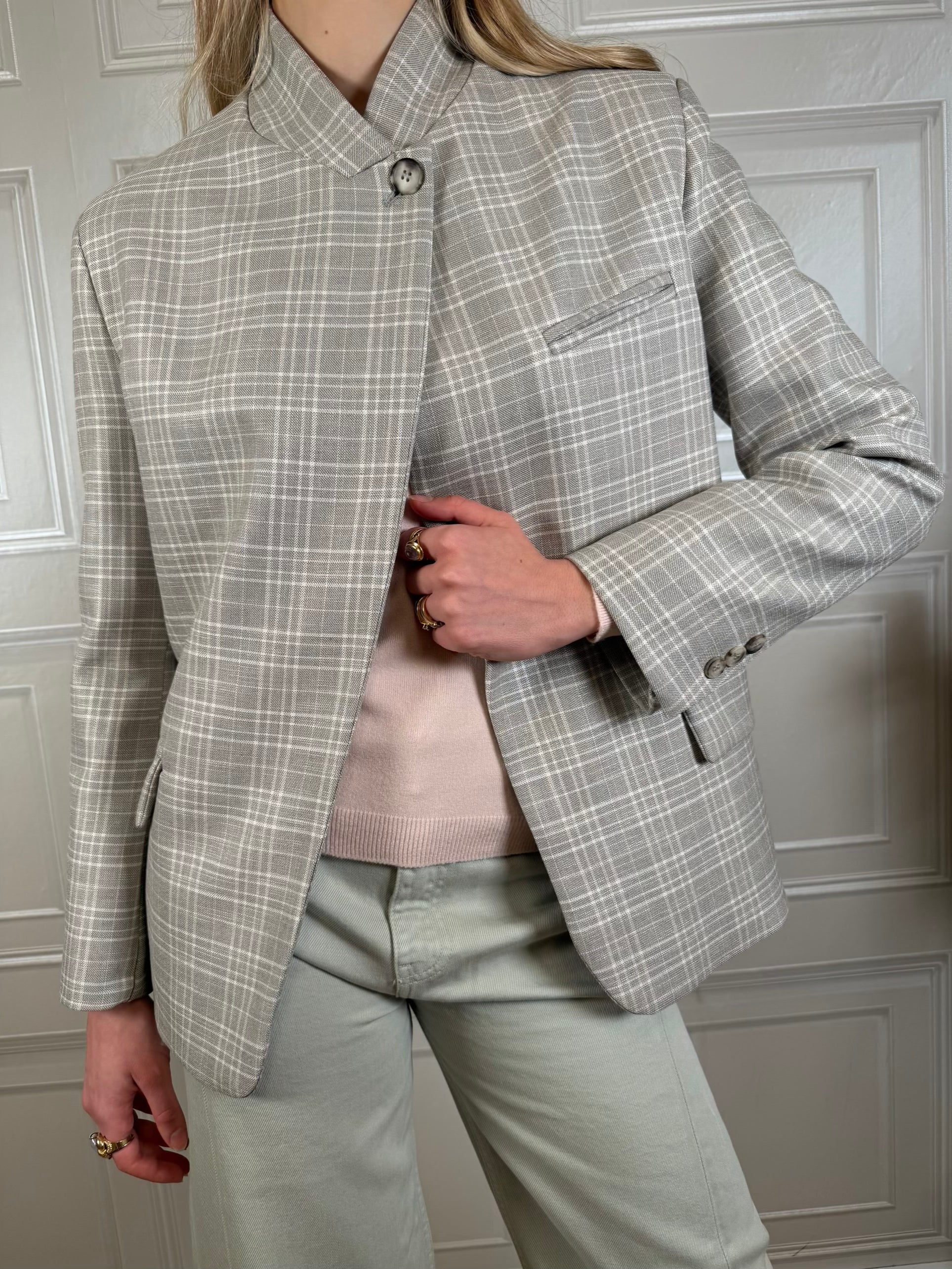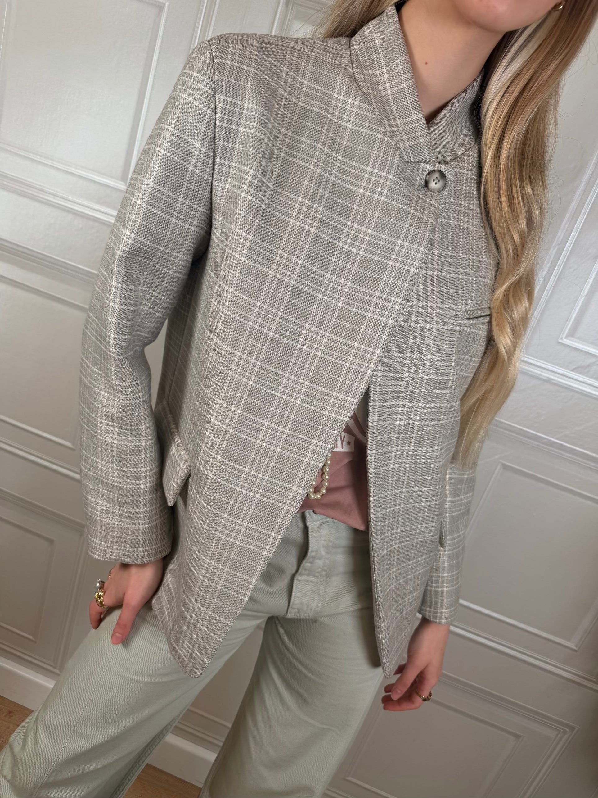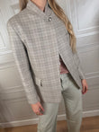 Giacca fantasia check grigia. Modello fit dritto chiusura con bottone altezza collo. Spalle imbottite e maniche lunghe con bottoncini sul fondo. Tasca a filetto sul petto. Foderata internamente