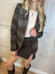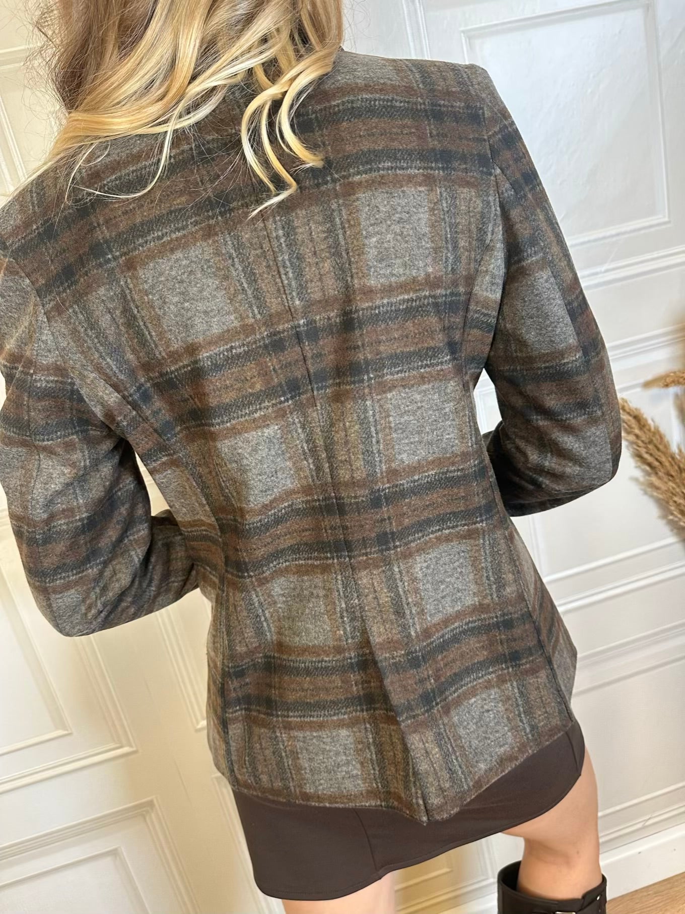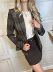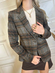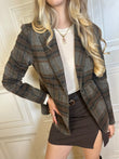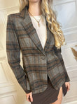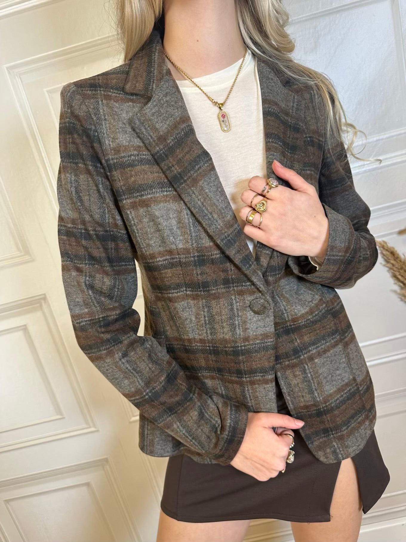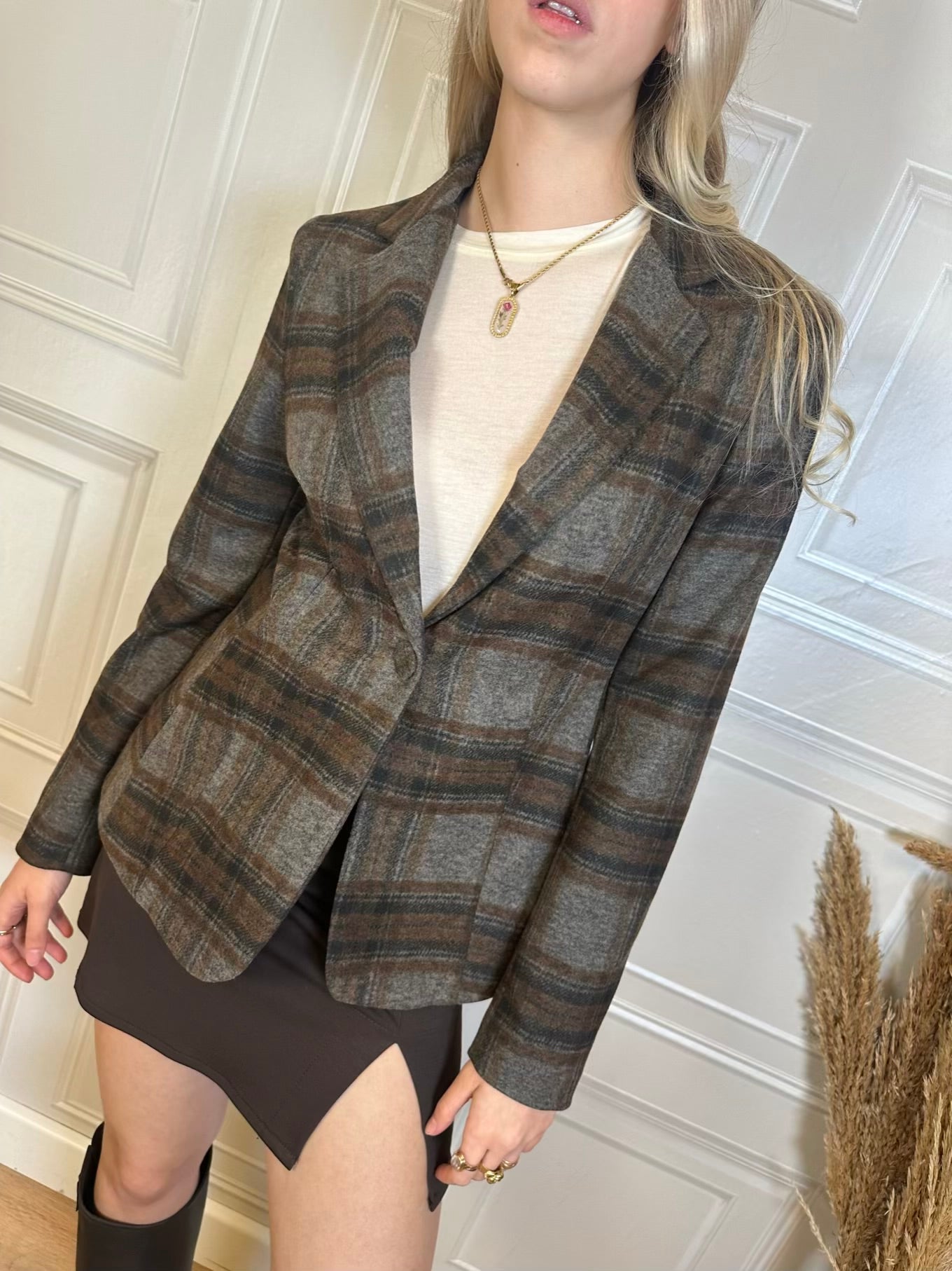 Blazer fantasia check monopetto. Chiusura ad un bottone. Sui toni del moro, grigio, tabacco e nero. Piccolo spacco sul fondo del retro. Foderato all’interno. In foto taglia S, vestibilità regolare.