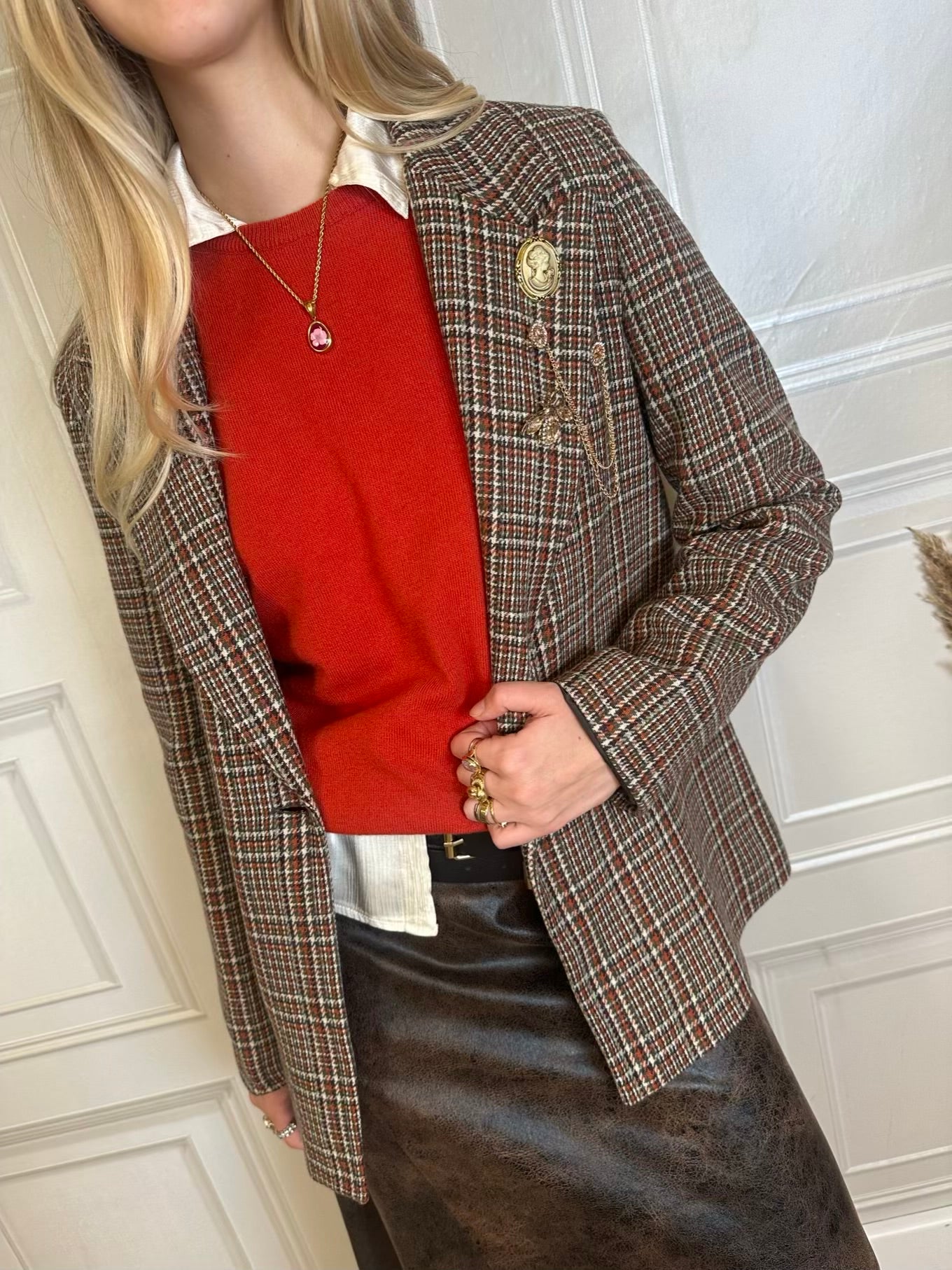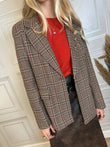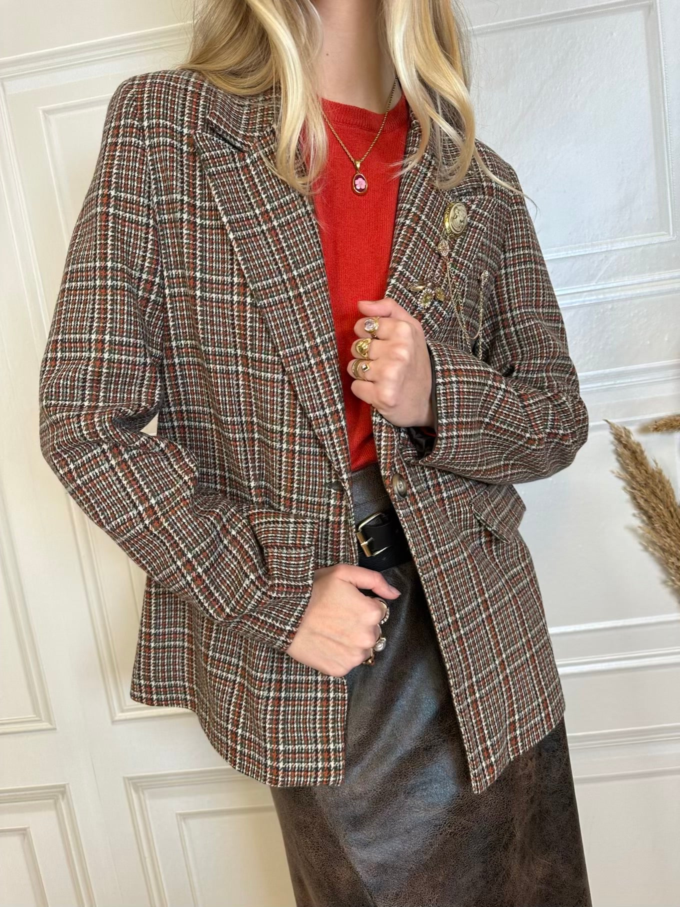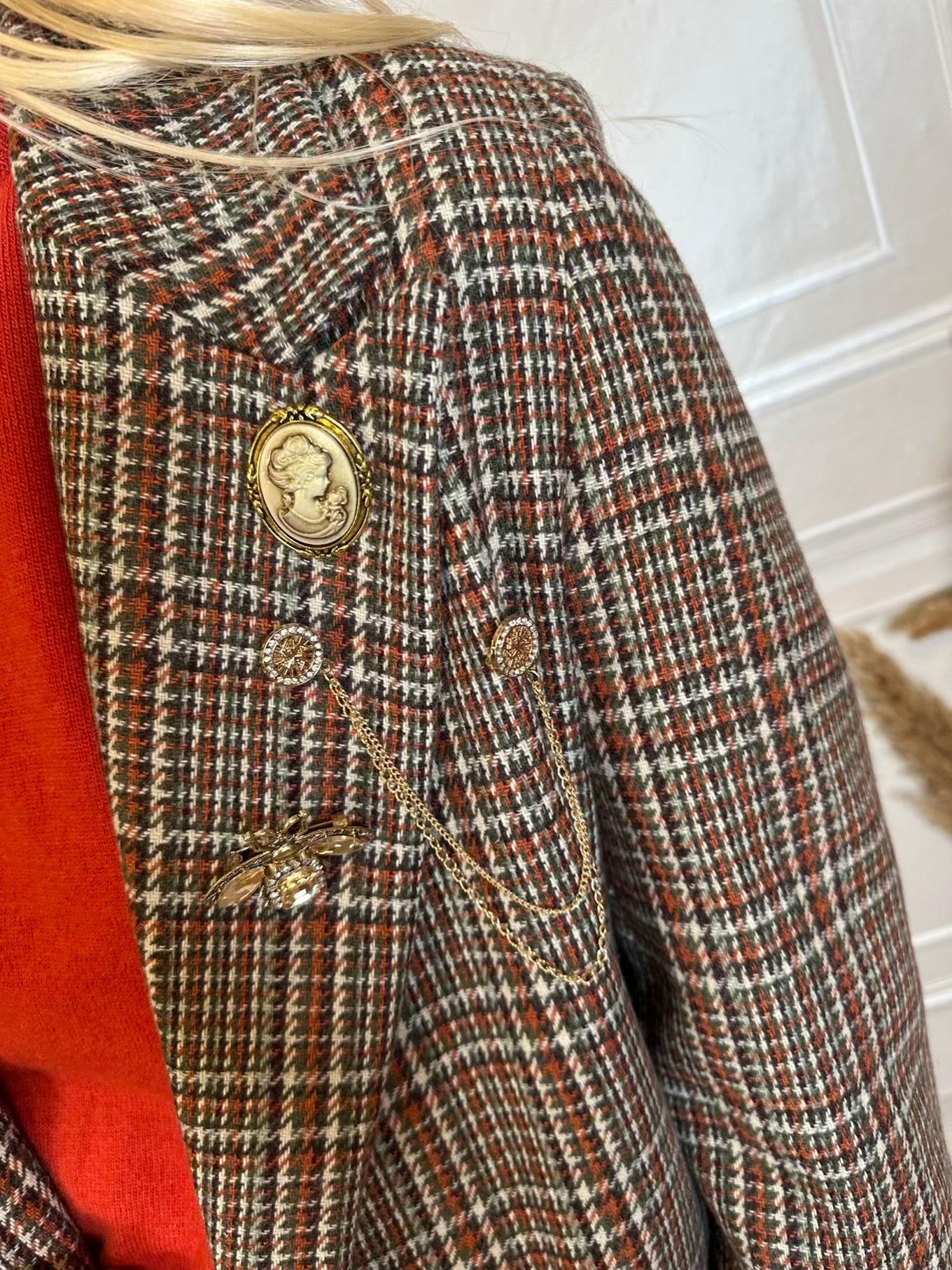 Blazer monopetto sui toni del zucca verde moro e avorio. Chiusura ad un bottone. Dettaglio spille. Fodera interna. In foto taglia S, vestibilità regolare. Lunghezza da spalla: 71 cm circa.