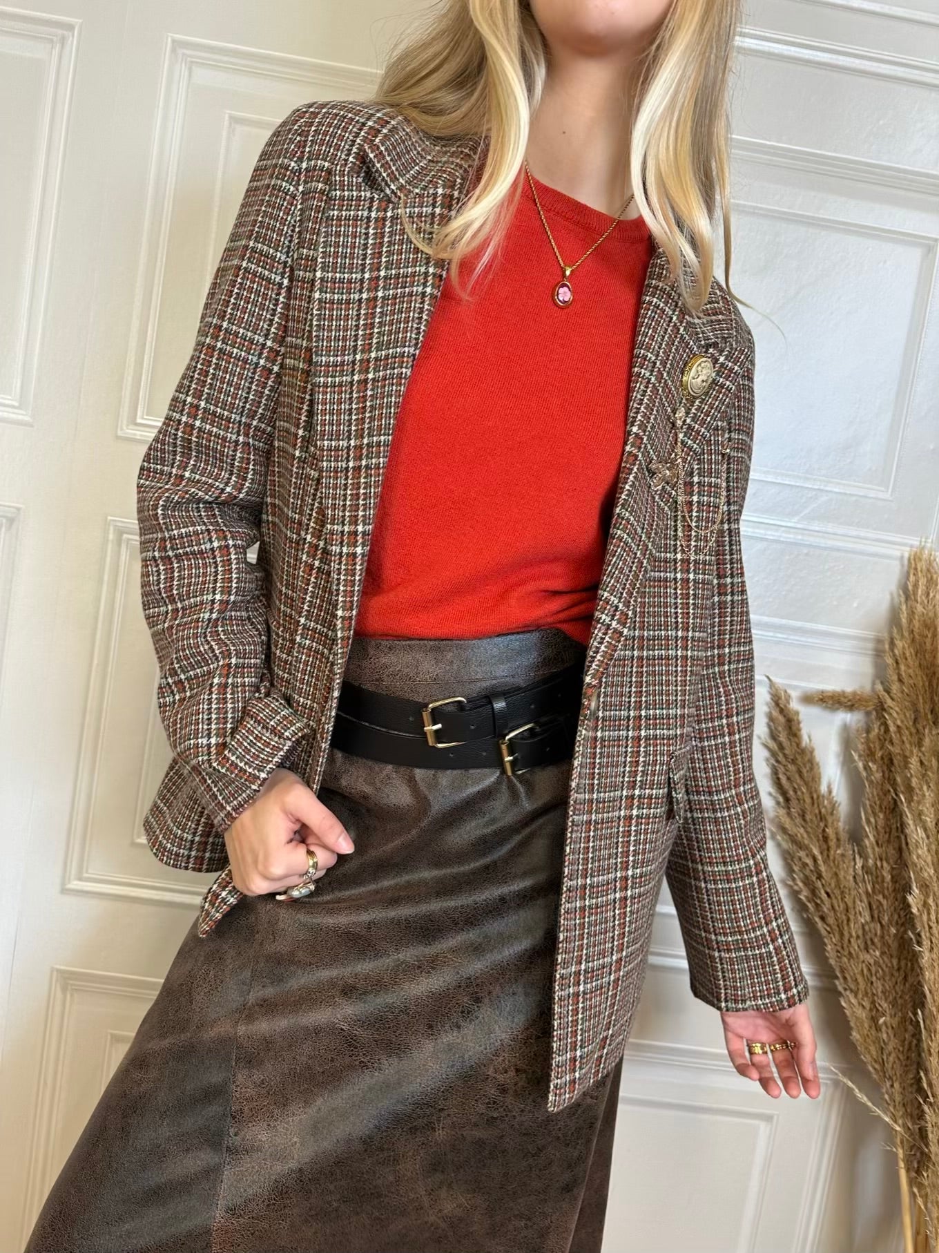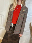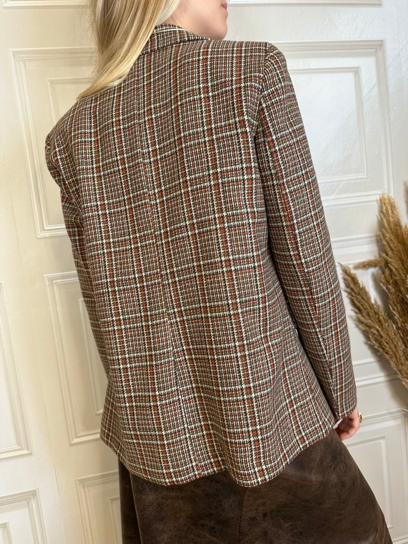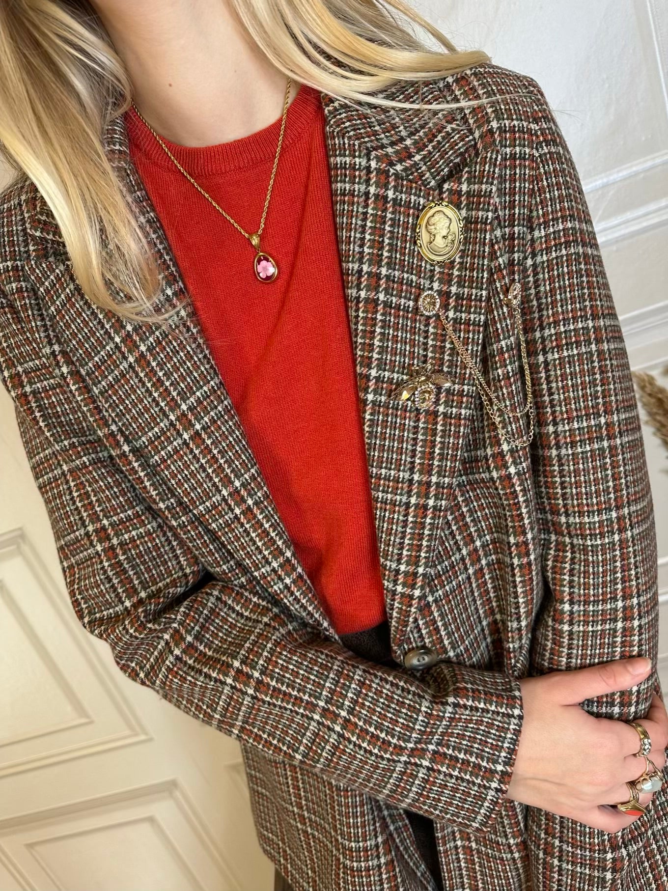 Blazer monopetto sui toni del zucca verde moro e avorio. Chiusura ad un bottone. Dettaglio spille. Fodera interna. In foto taglia S, vestibilità regolare. Lunghezza da spalla: 71 cm circa.