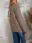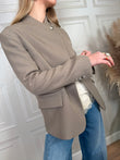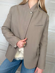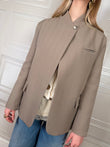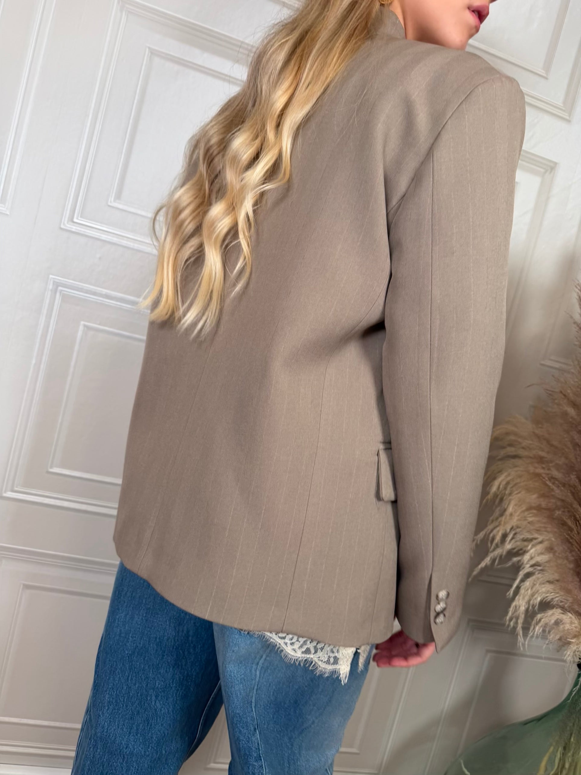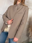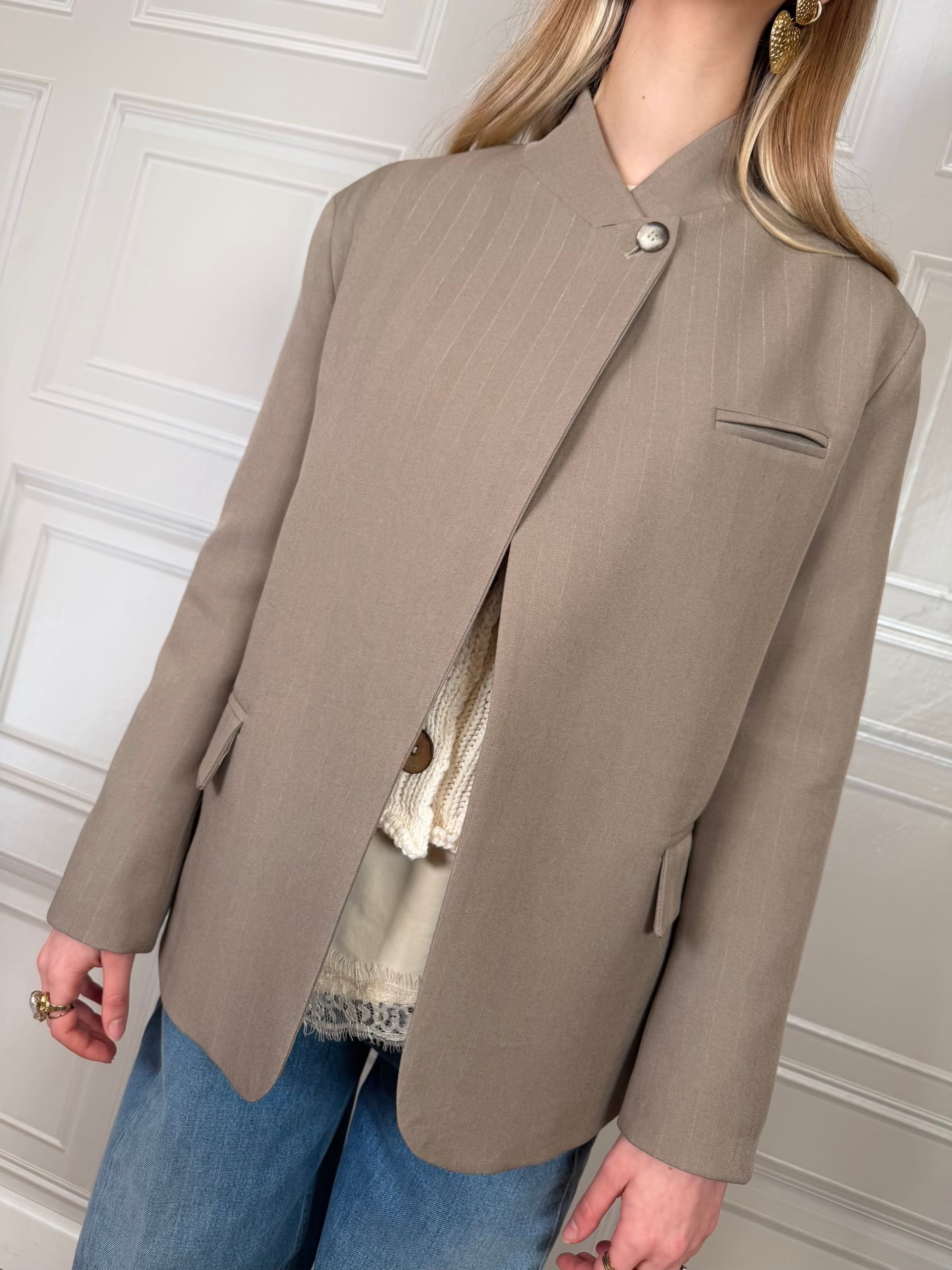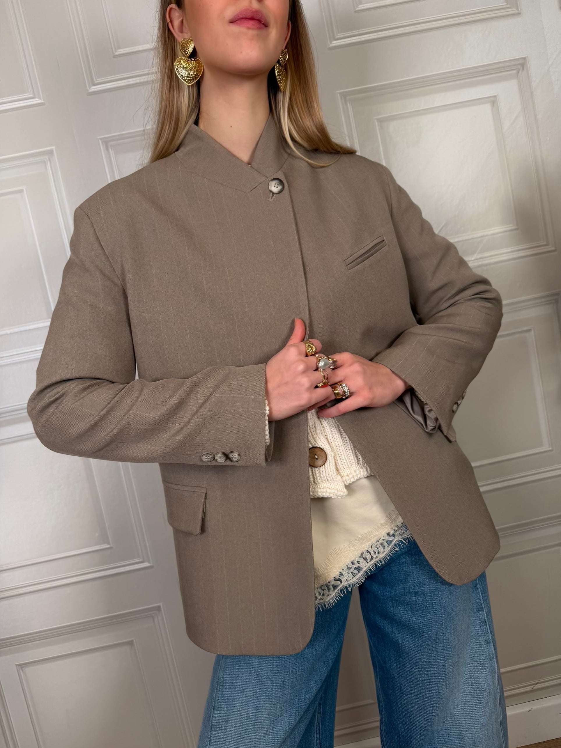 Giacca gessata fango. Modello fit dritto chiusura con bottone altezza collo. Spalle imbottite e maniche lunghe con bottoncini sul fondo. Tasca a filetto sul petto. Foderata internamente