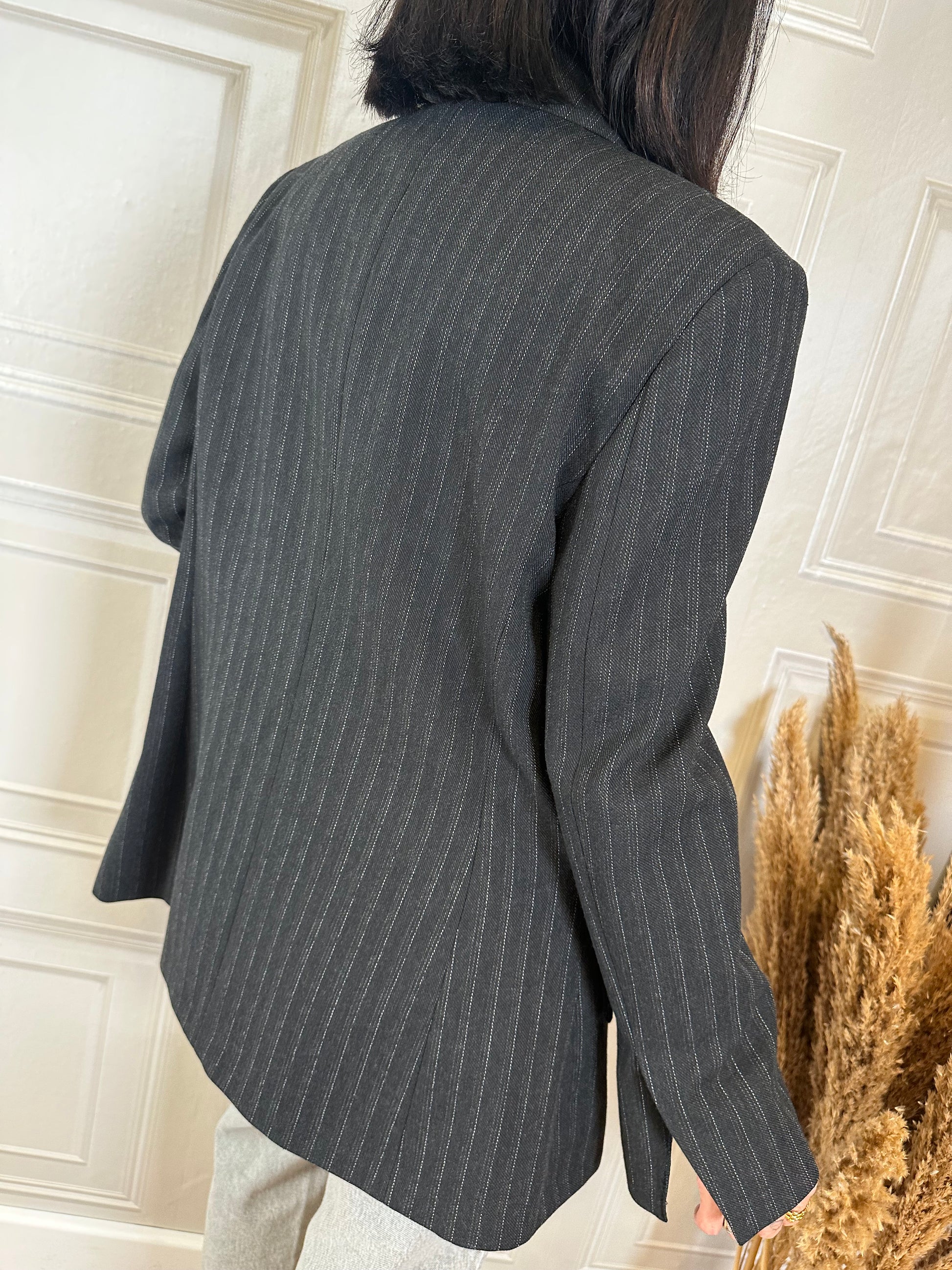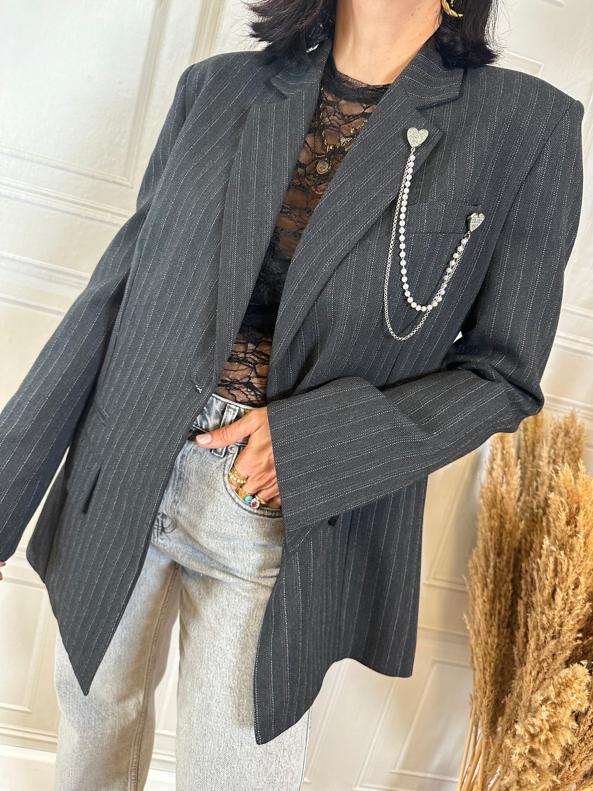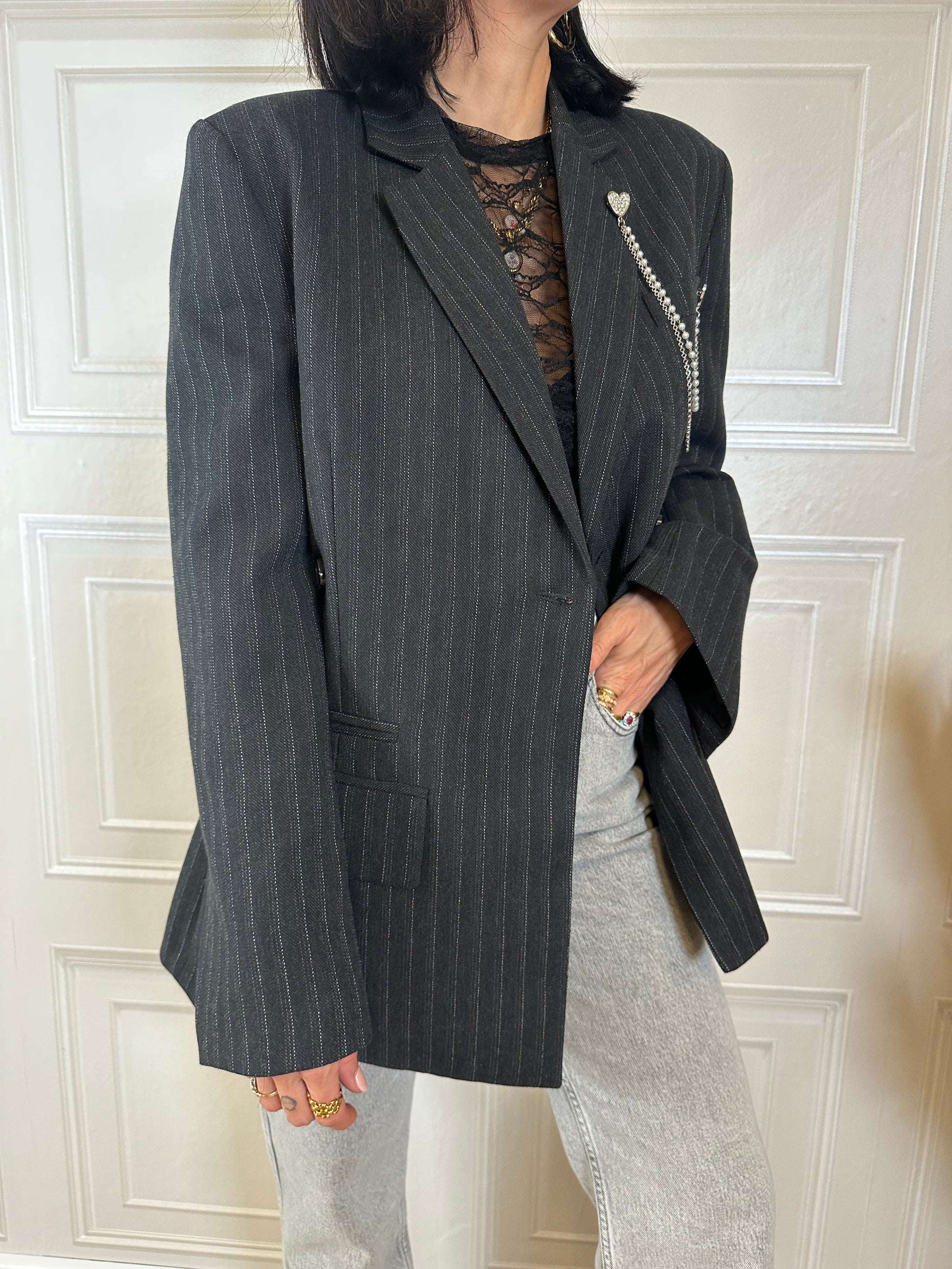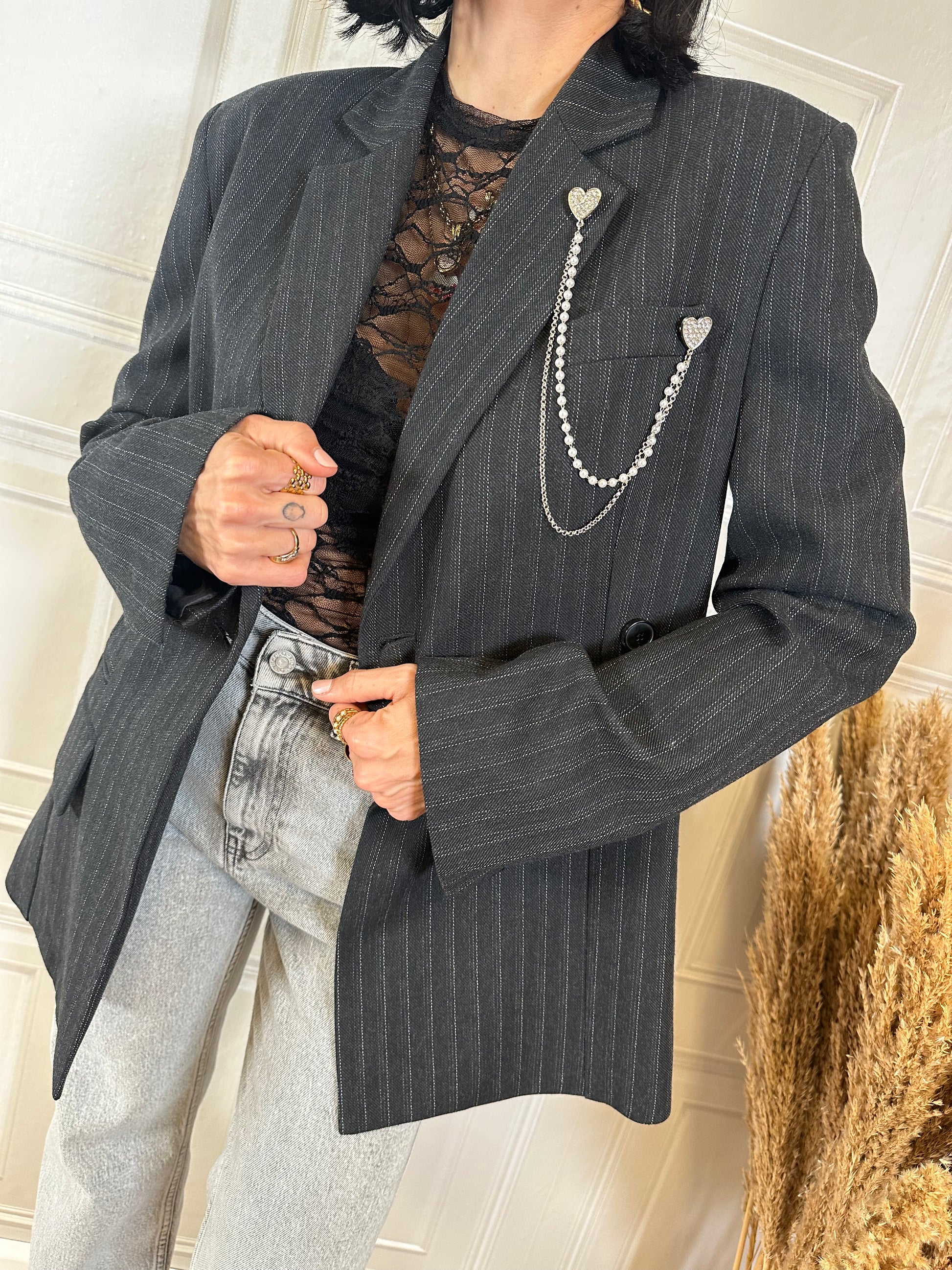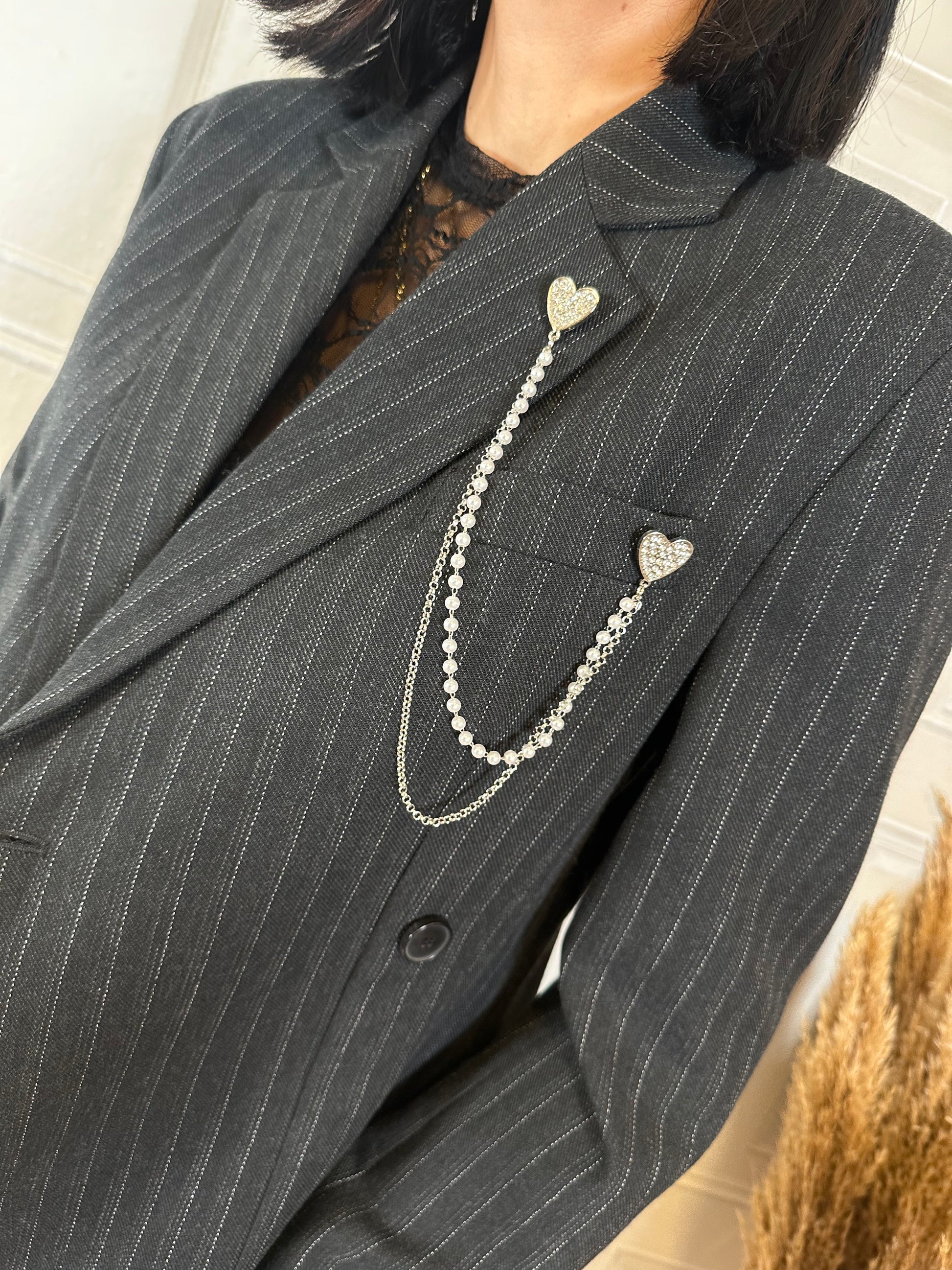 Chiusura con bottone singolo. Dettaglio di spilla con cuore rimovibile.