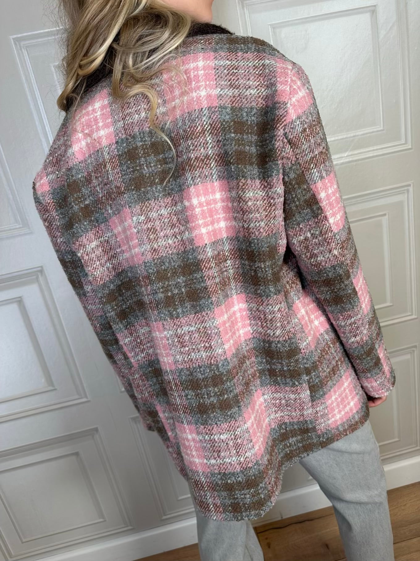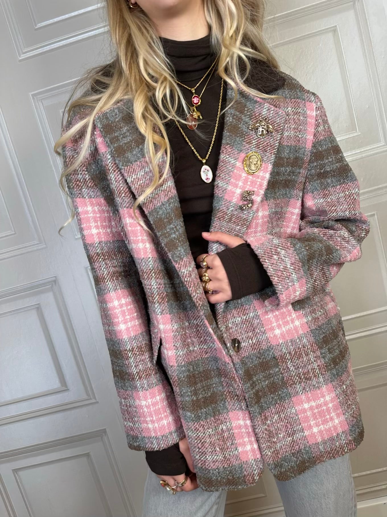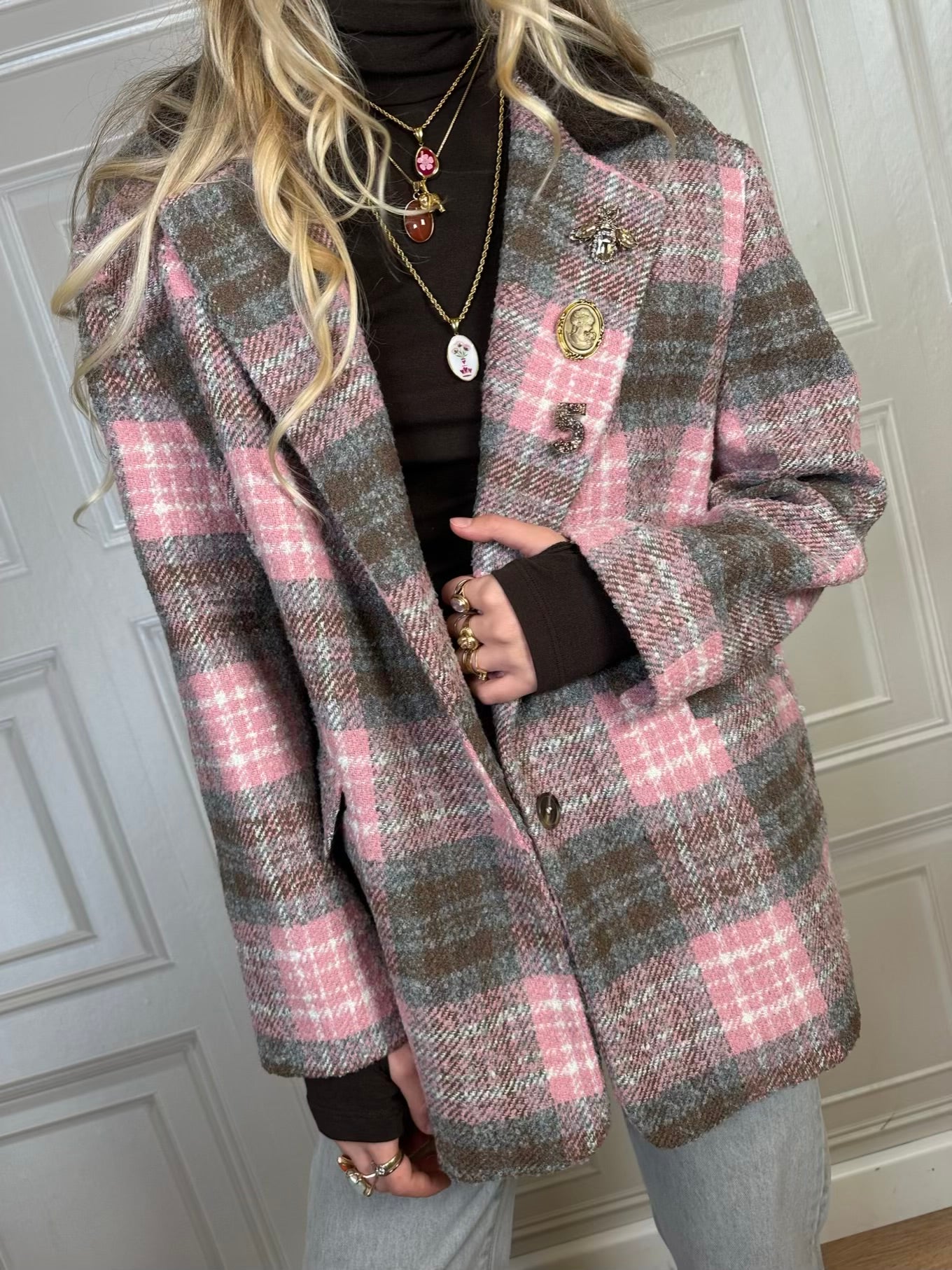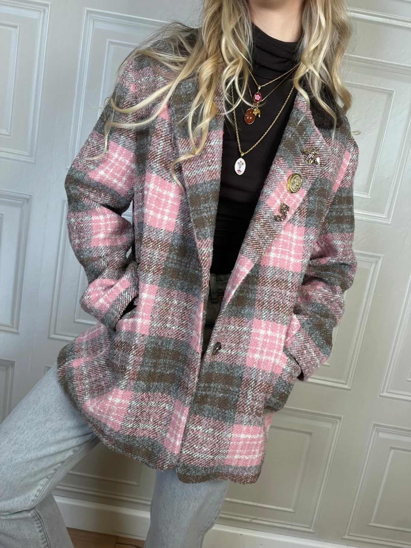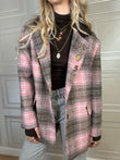 Giacca monopetto sui toni del grigio, cammello e rosa. Chiusura a due bottoni. Spille su reverse. Tasche laterali con patta Foderato internamente.