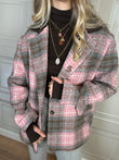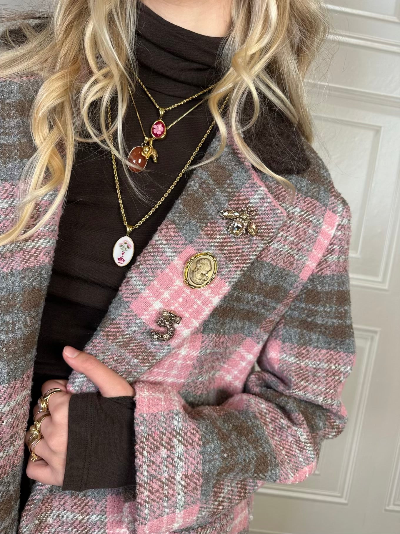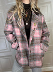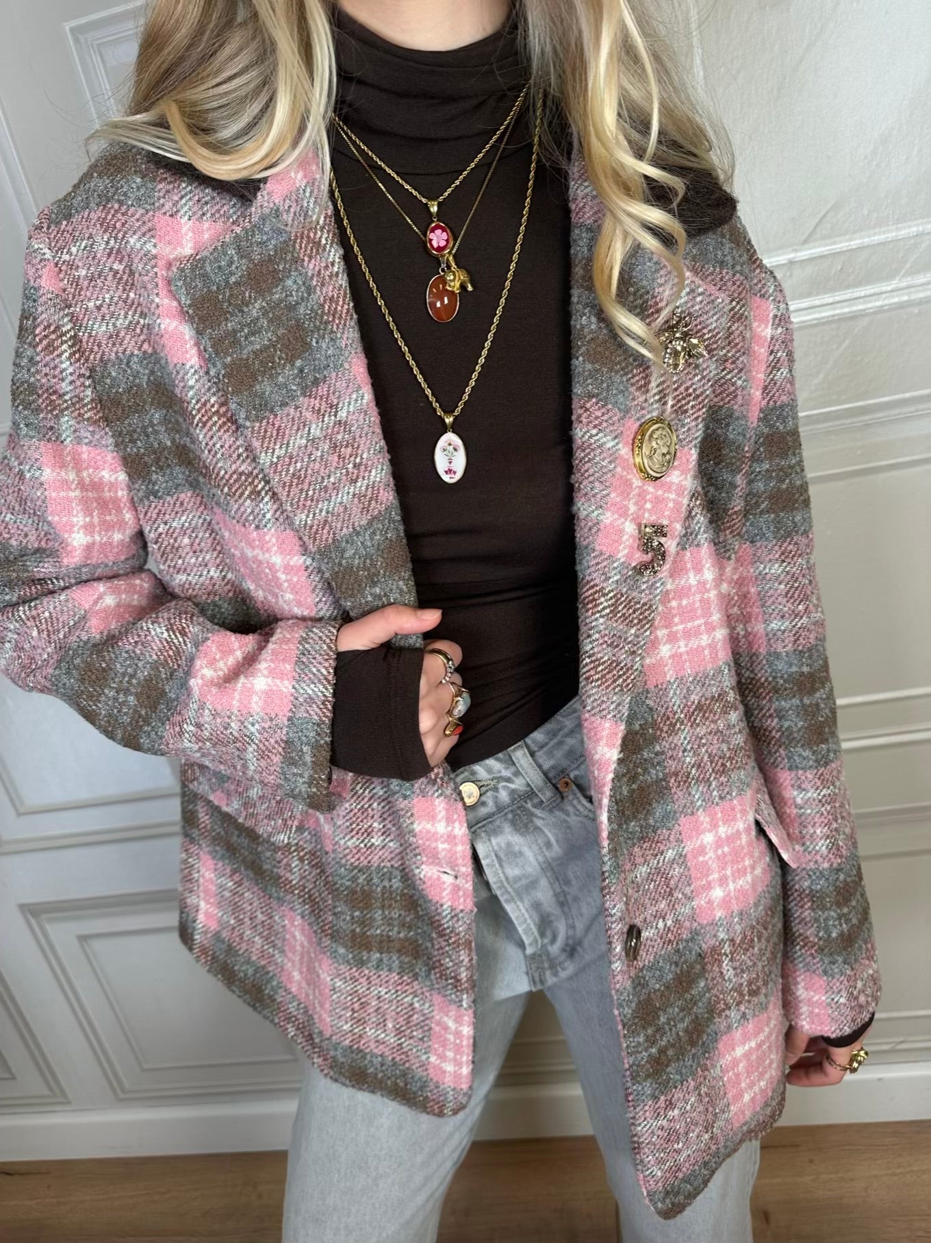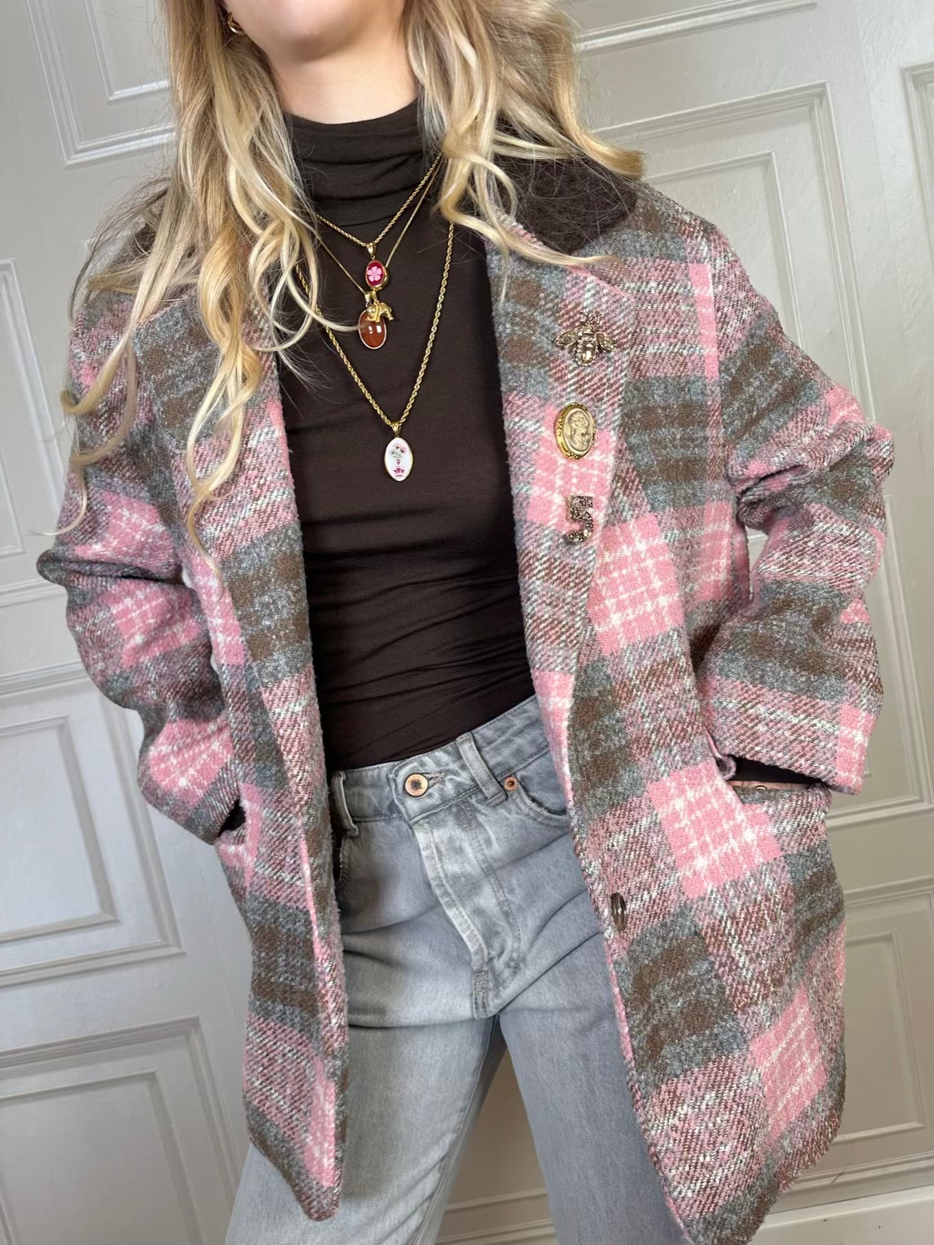 Giacca monopetto sui toni del grigio, cammello e rosa. Chiusura a due bottoni. Spille su reverse. Tasche laterali con patta Foderato internamente.