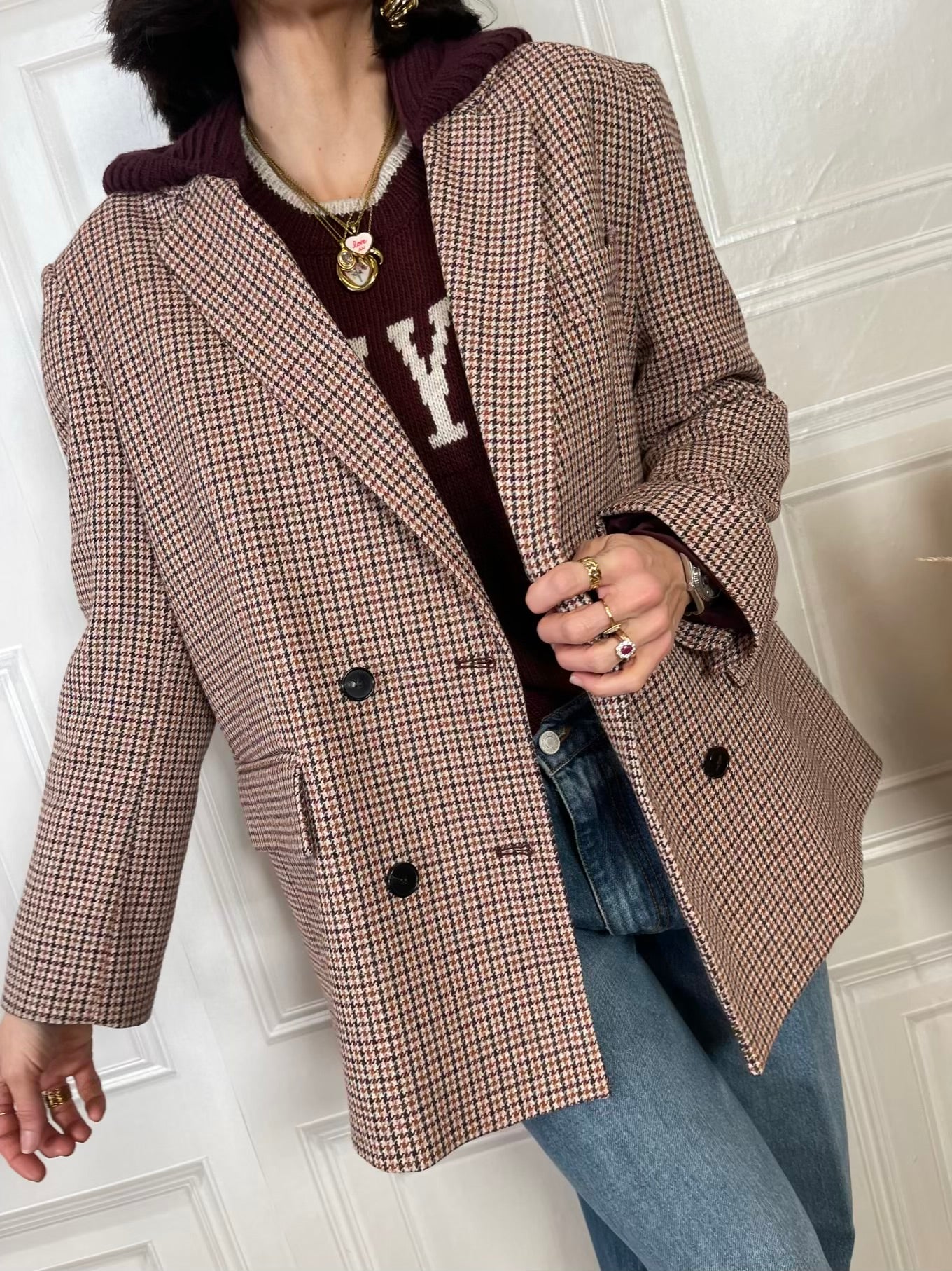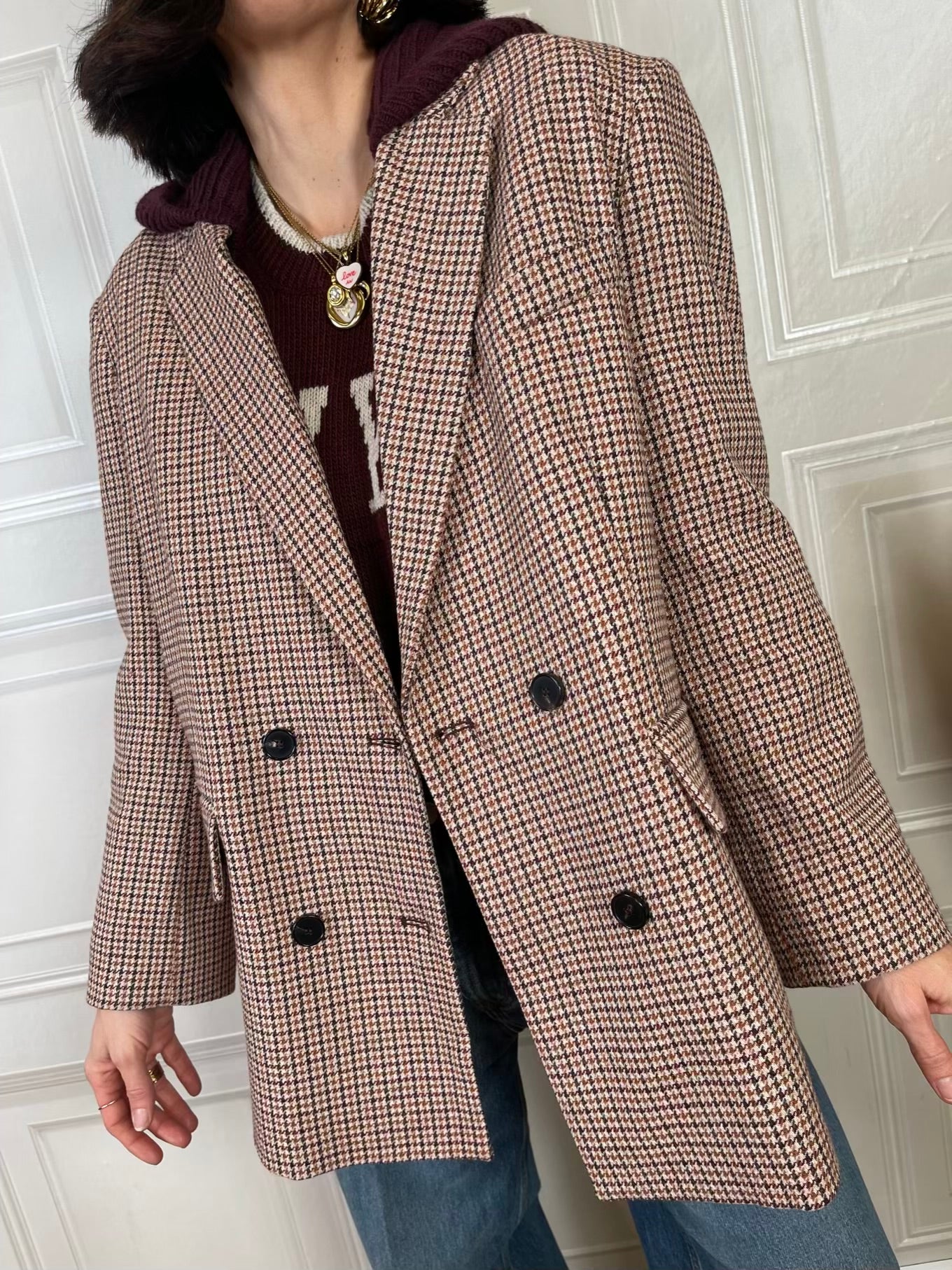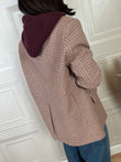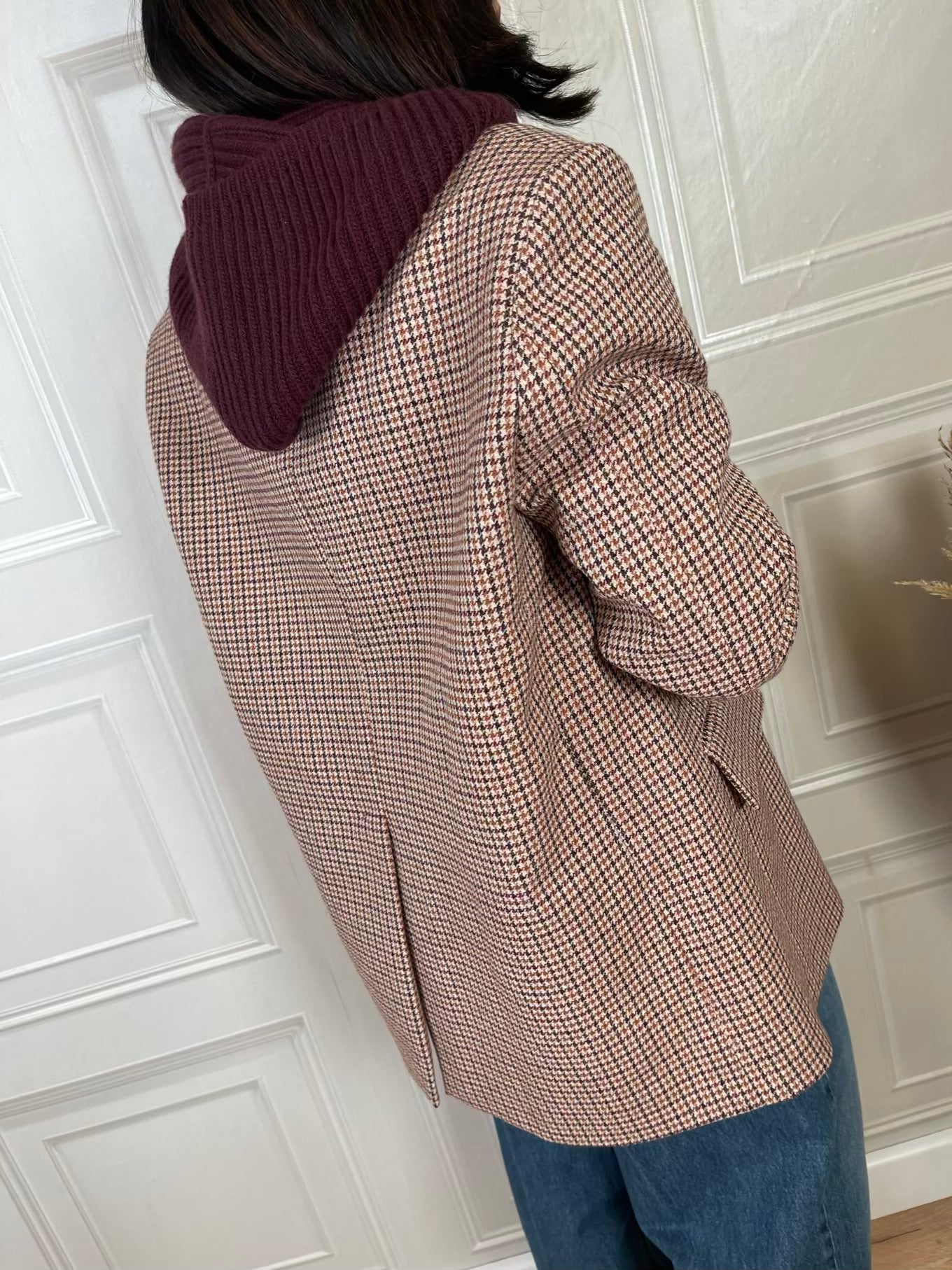 Giacca cappotto a fantasia pied de poule doppiopetto con chiusura a doppio bottone e cappuccio in maglia. Sui toni del bordeaux, arancio, sabbia e grigio. Taschine con patta sul fronte. Presenti 4 bottoncini sulla manica. Foderato internamente.