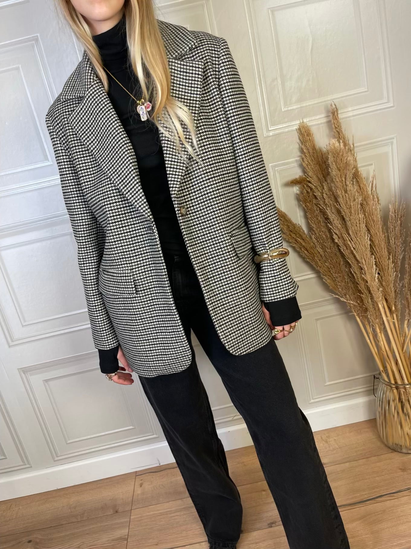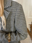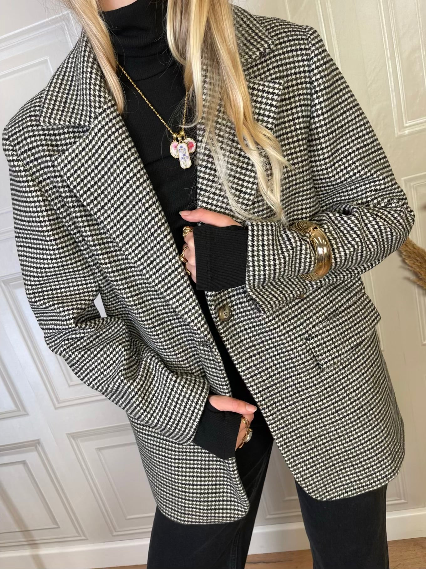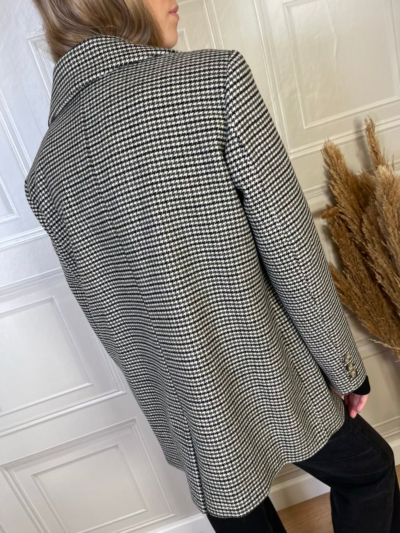 Blazer a fantasia pied de poule monopetto con chiusura a un bottone. Toni del bianco, nero e verde militare. Taschine frontali con patta. Presenti 3 bottoni sulla manica. Foderato internamente nel verde.