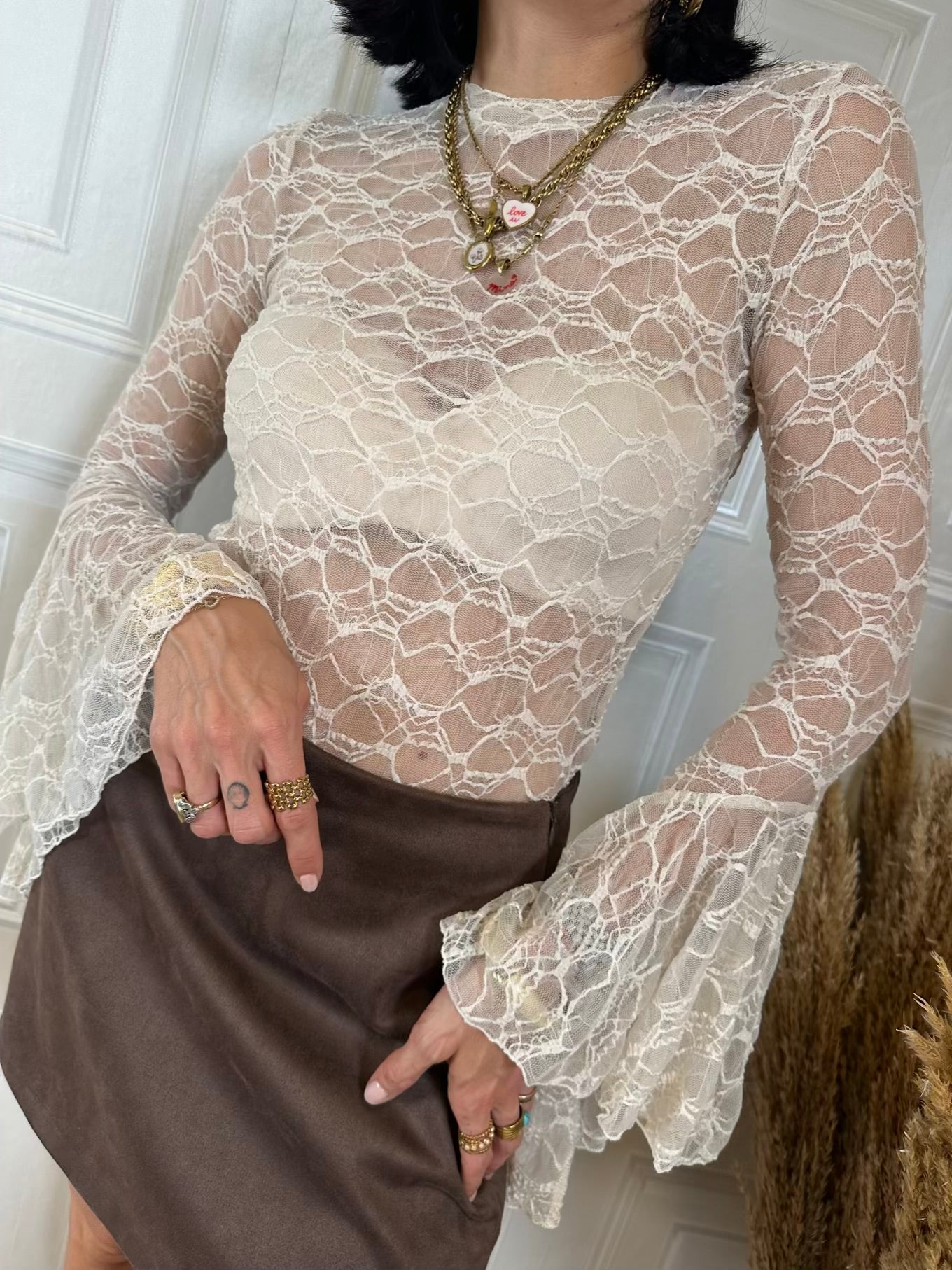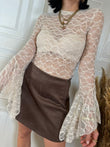 Blusa girocollo in pizzo. Modello con manica lunga a corolla.