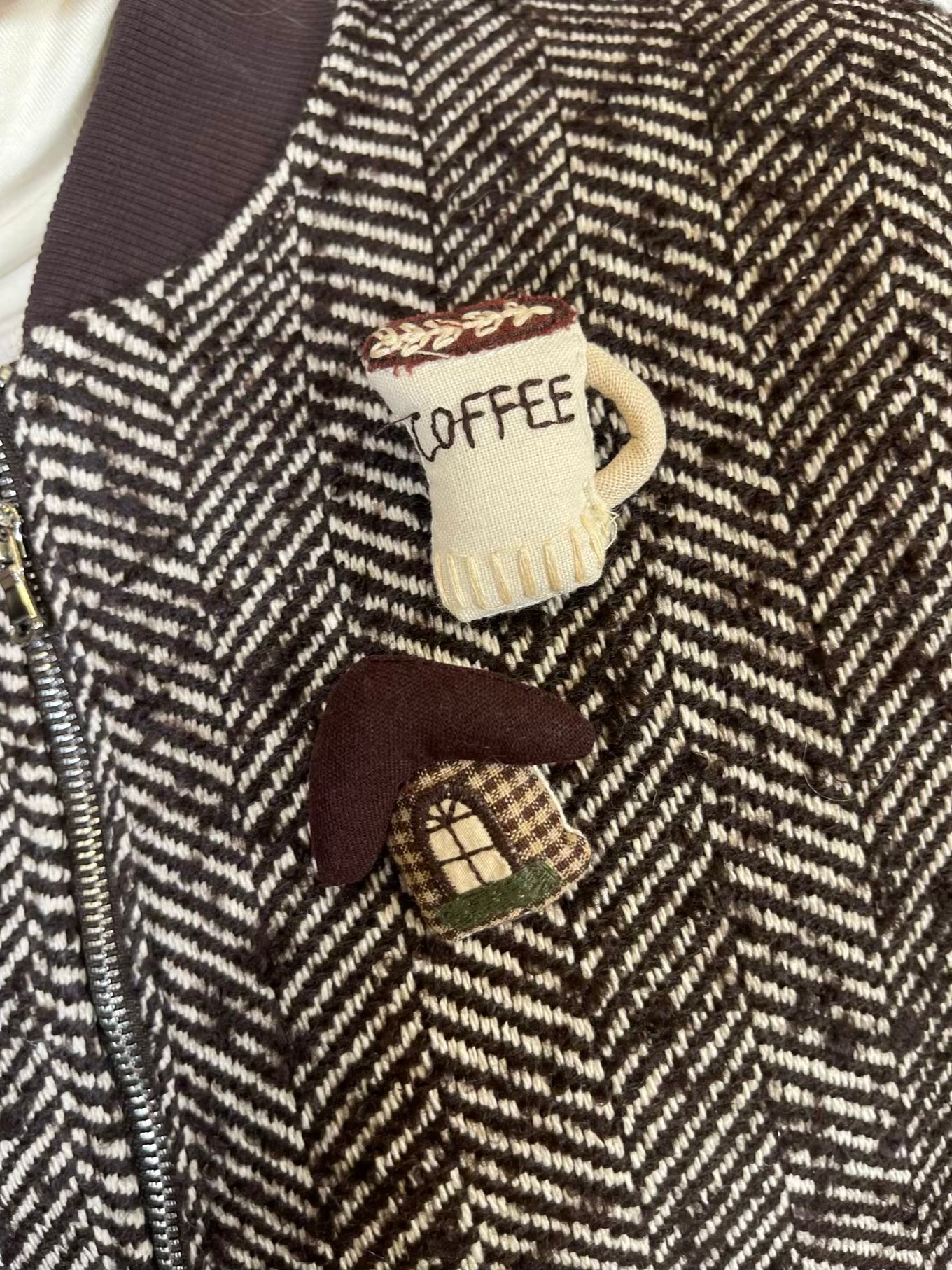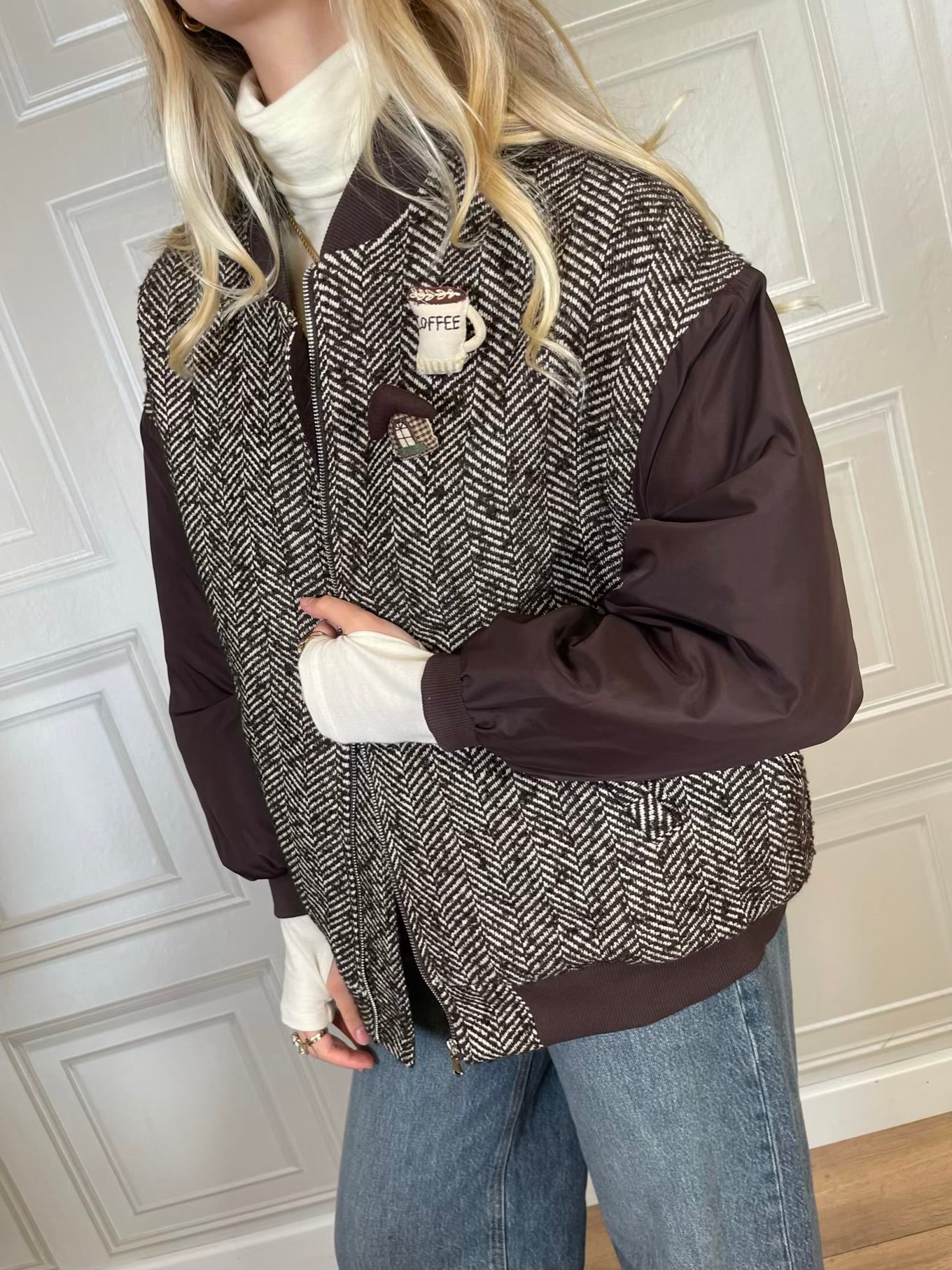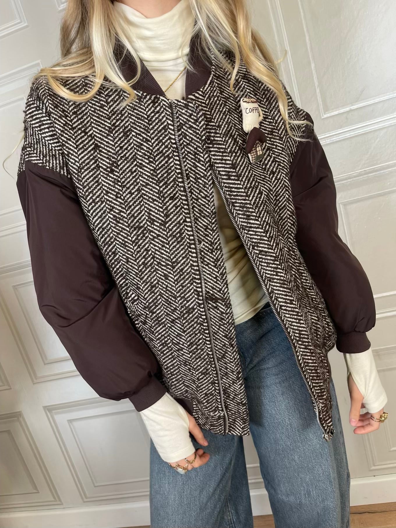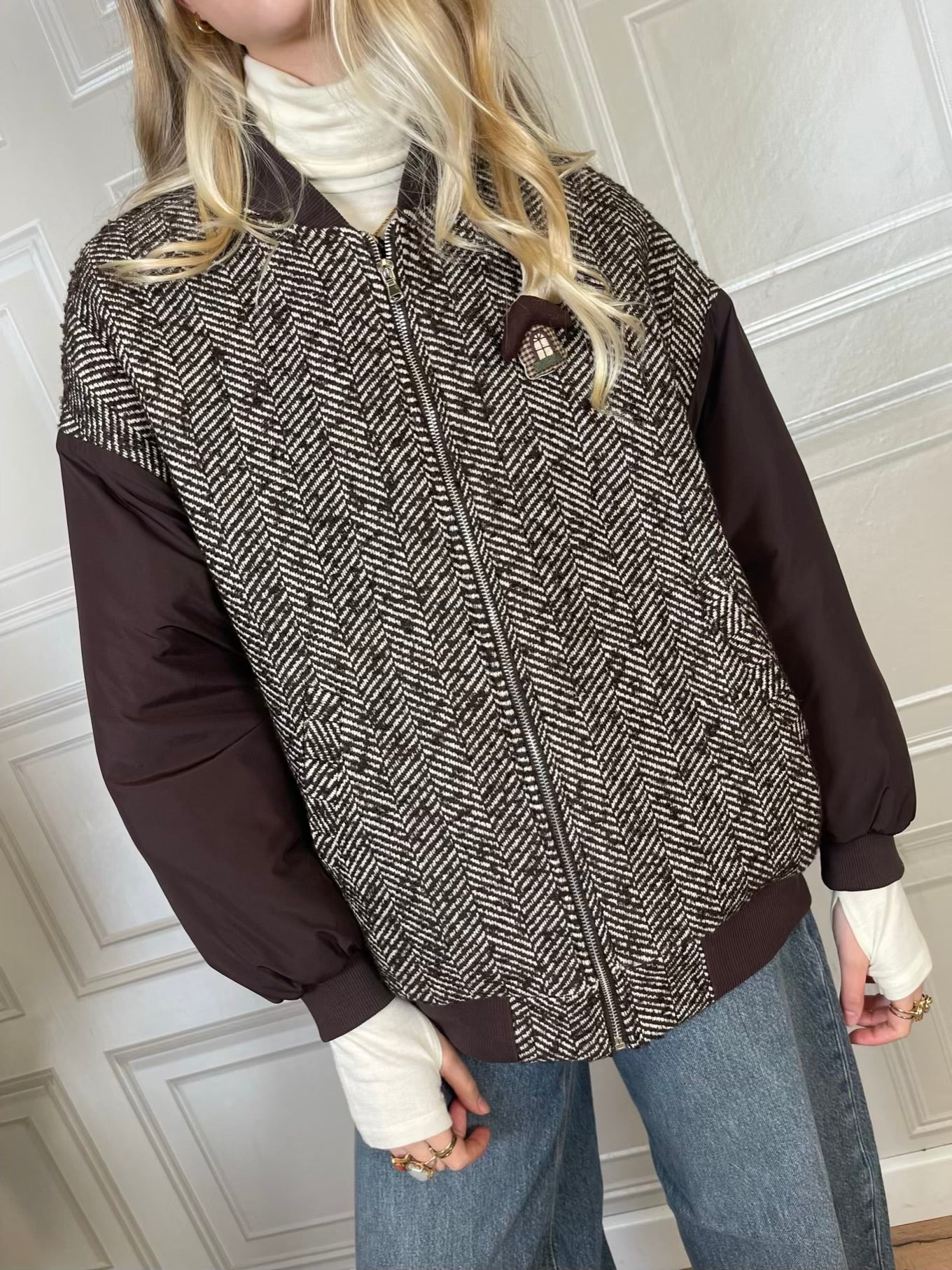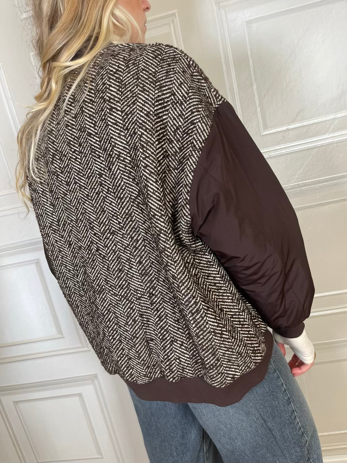 giacca in fantasia spigata sui toni del moro e panna.. Modello a bomber con elastico sul fondo e sui polsini, con colletto moro a costine a contrasto. Tasche laterali, chiusura con zip frontale. Foderato e imbottito internamente. Maniche a contrasto imbottite.