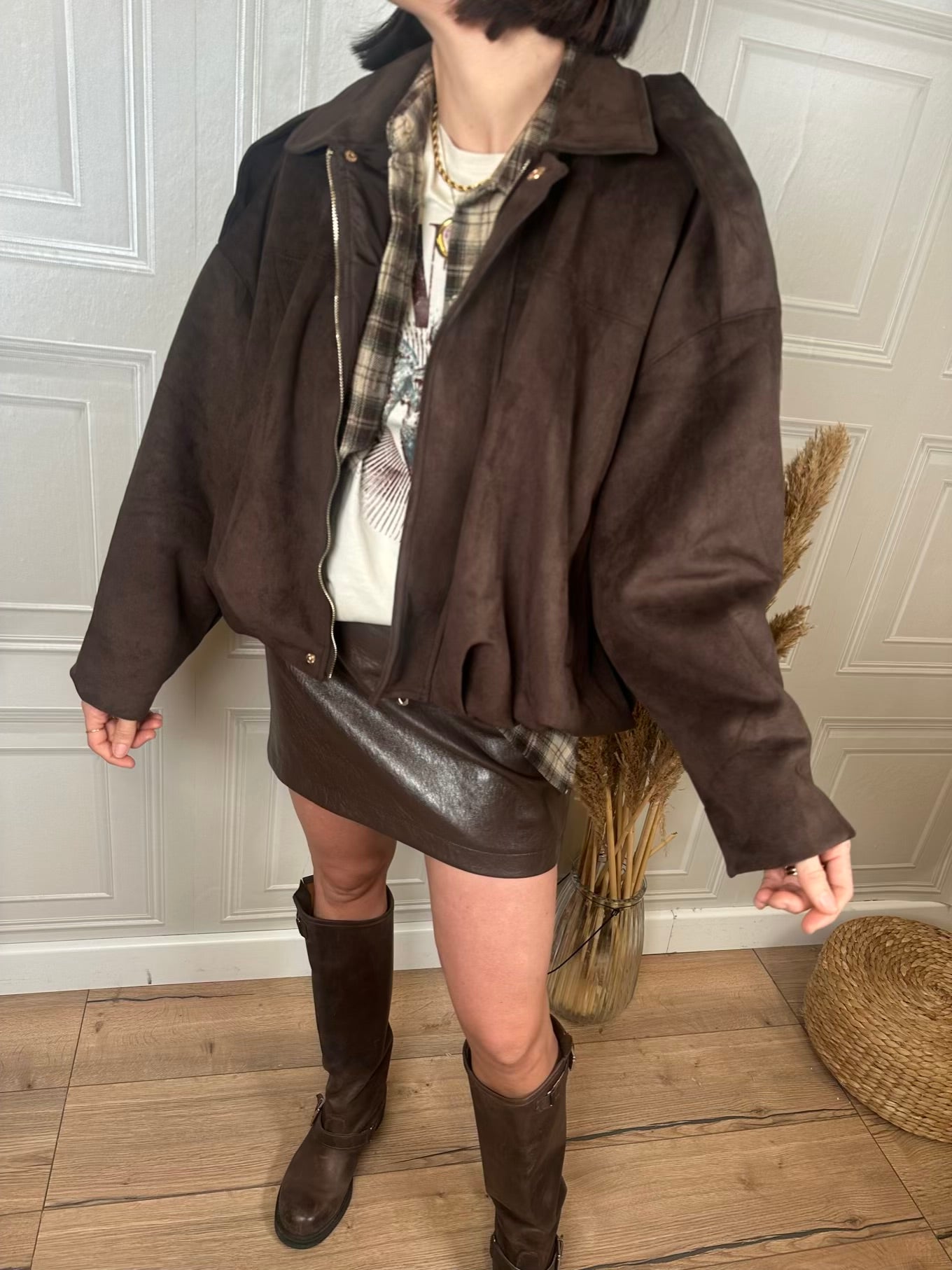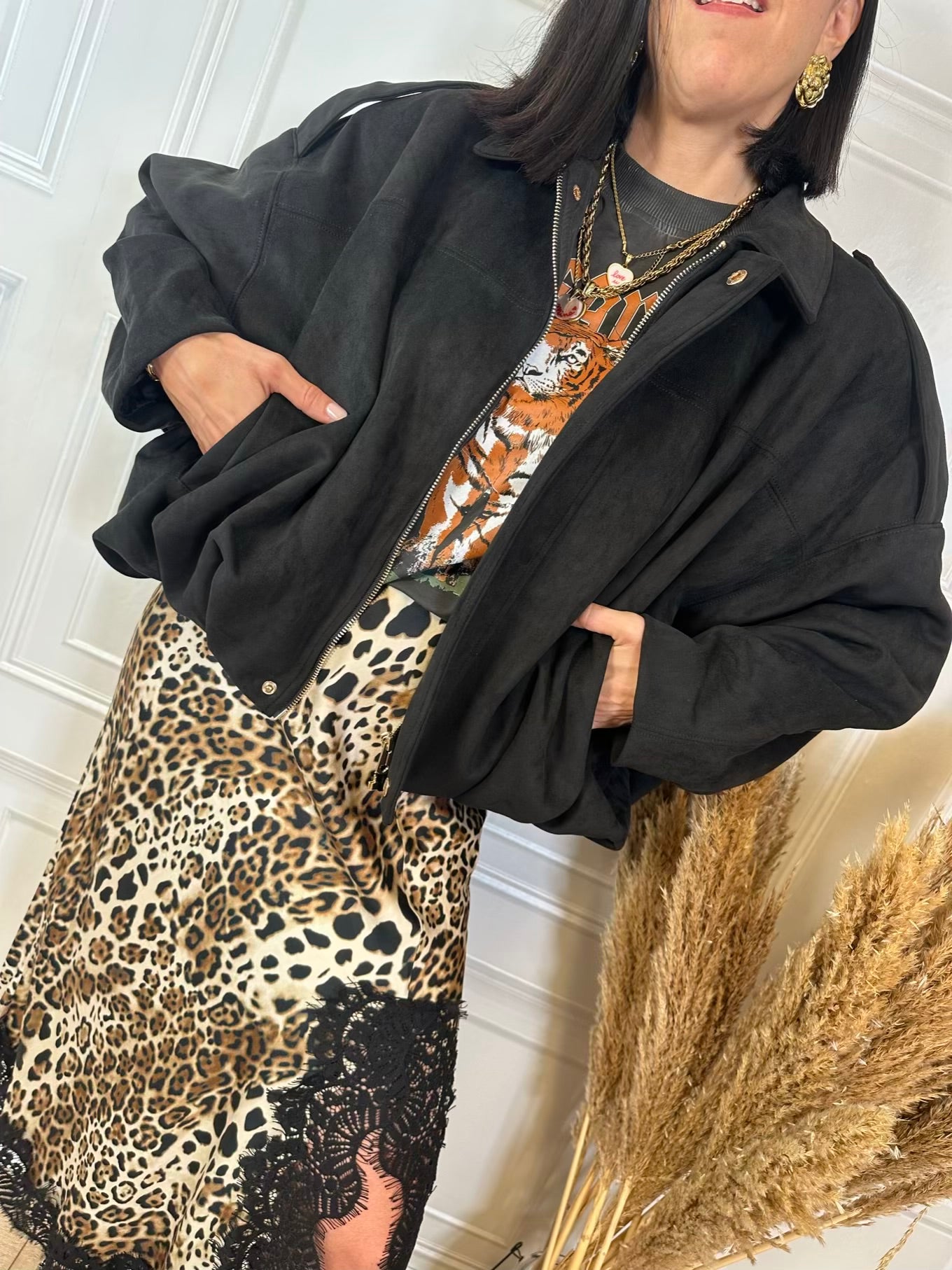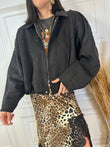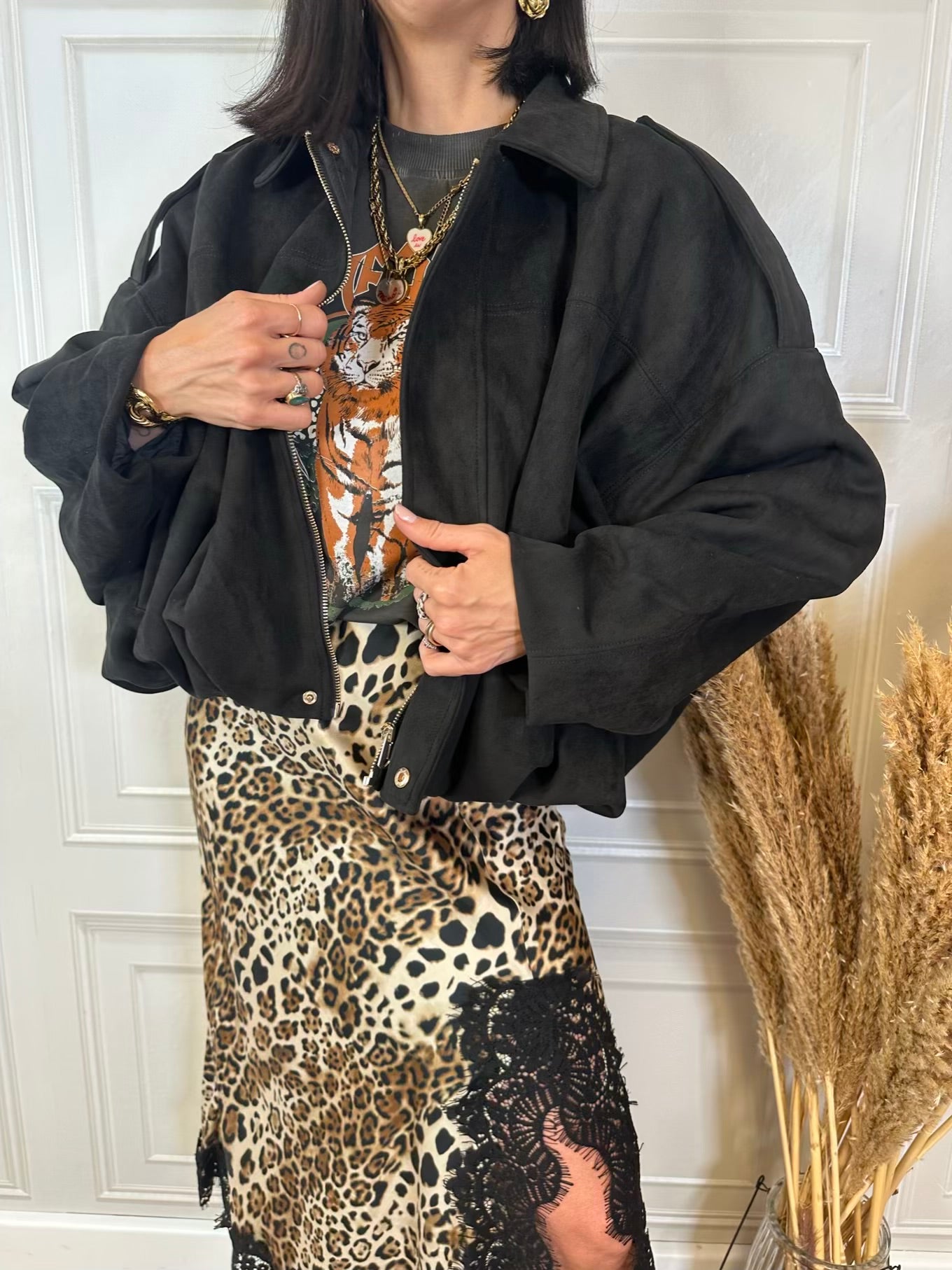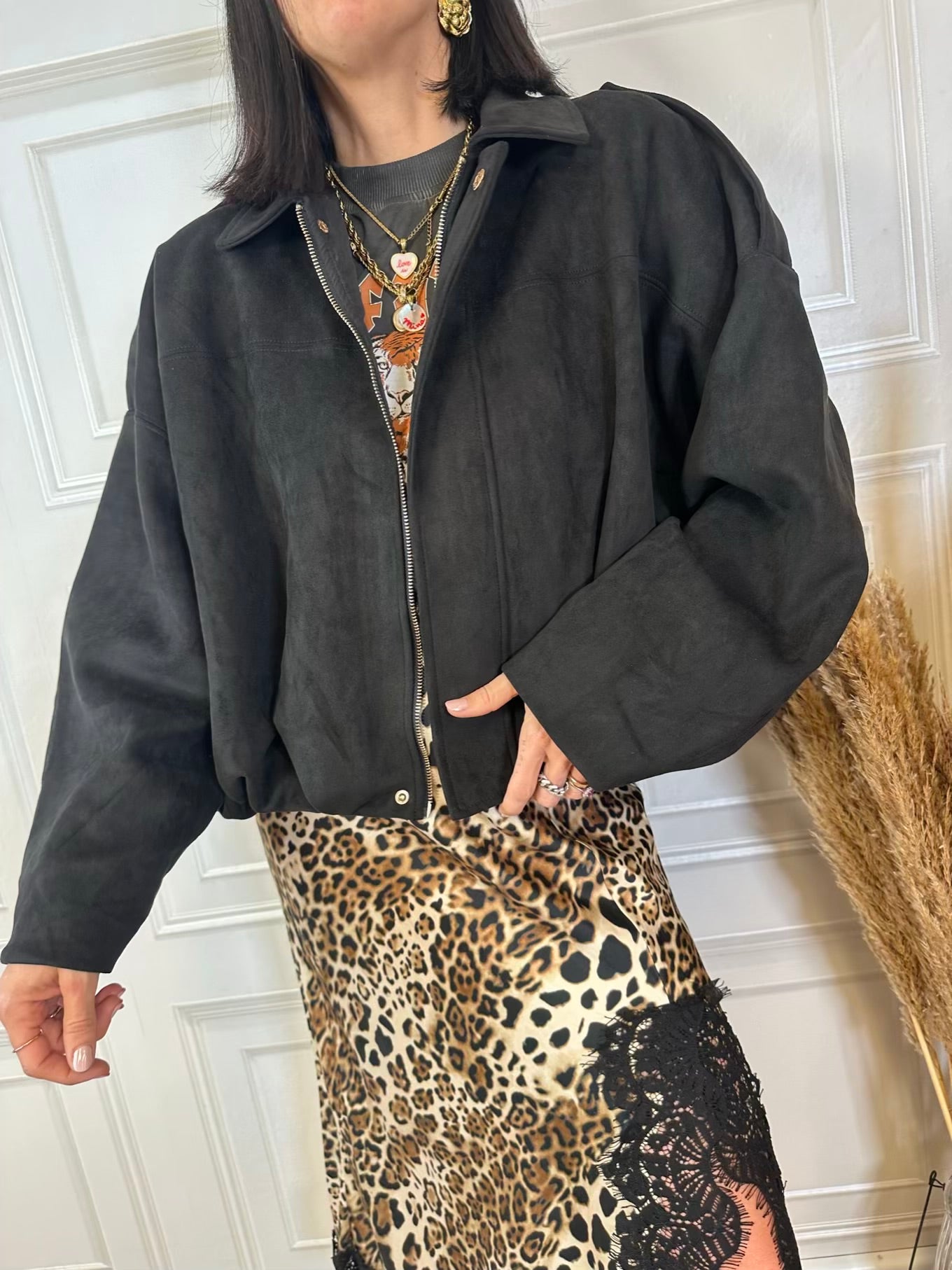Bomber eco dainetto. Modello leggermente over, chiusura con zip frontale e bottoncini. Taglia unica