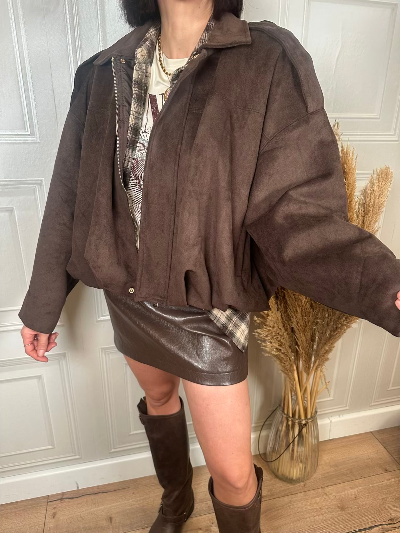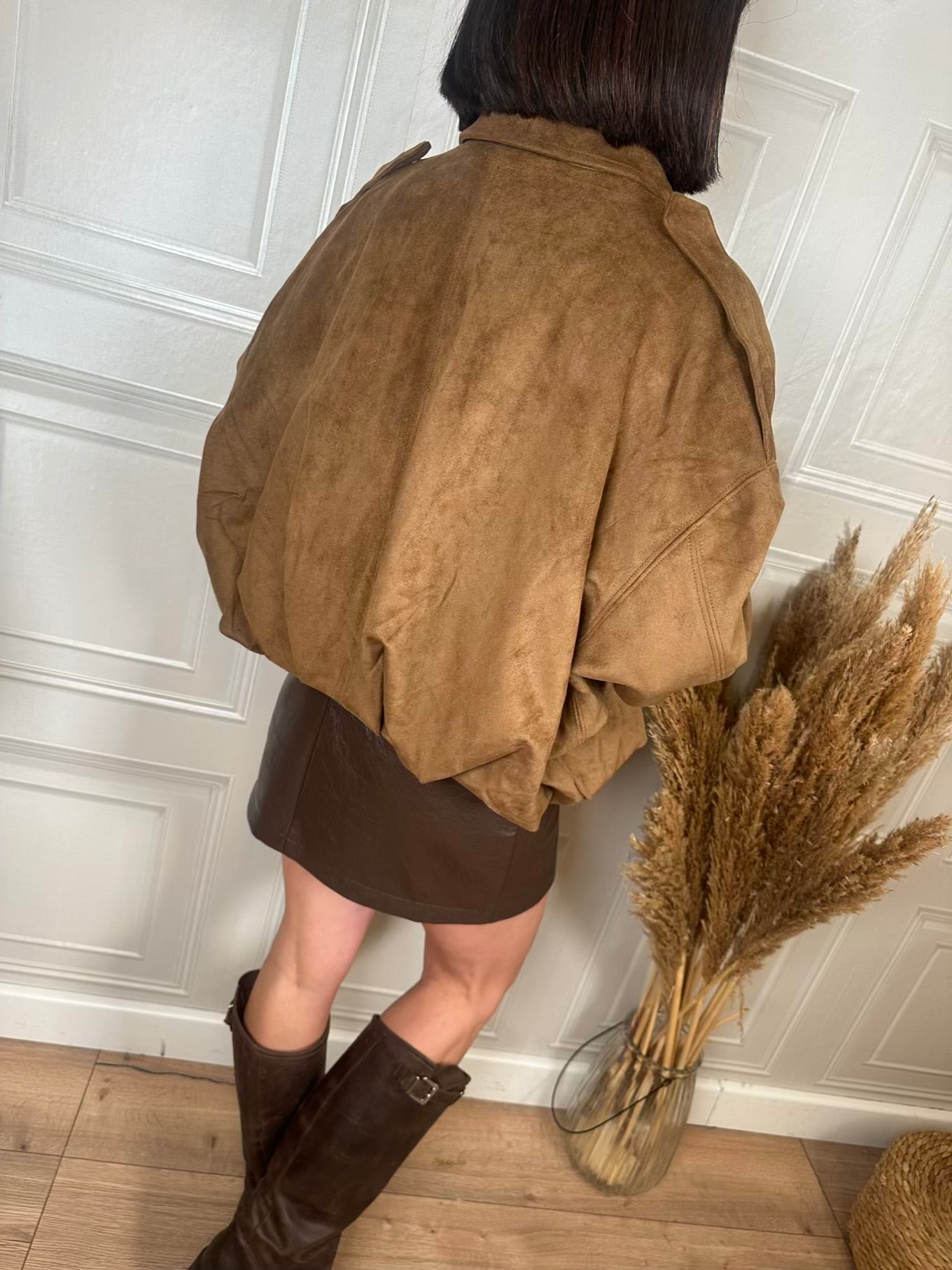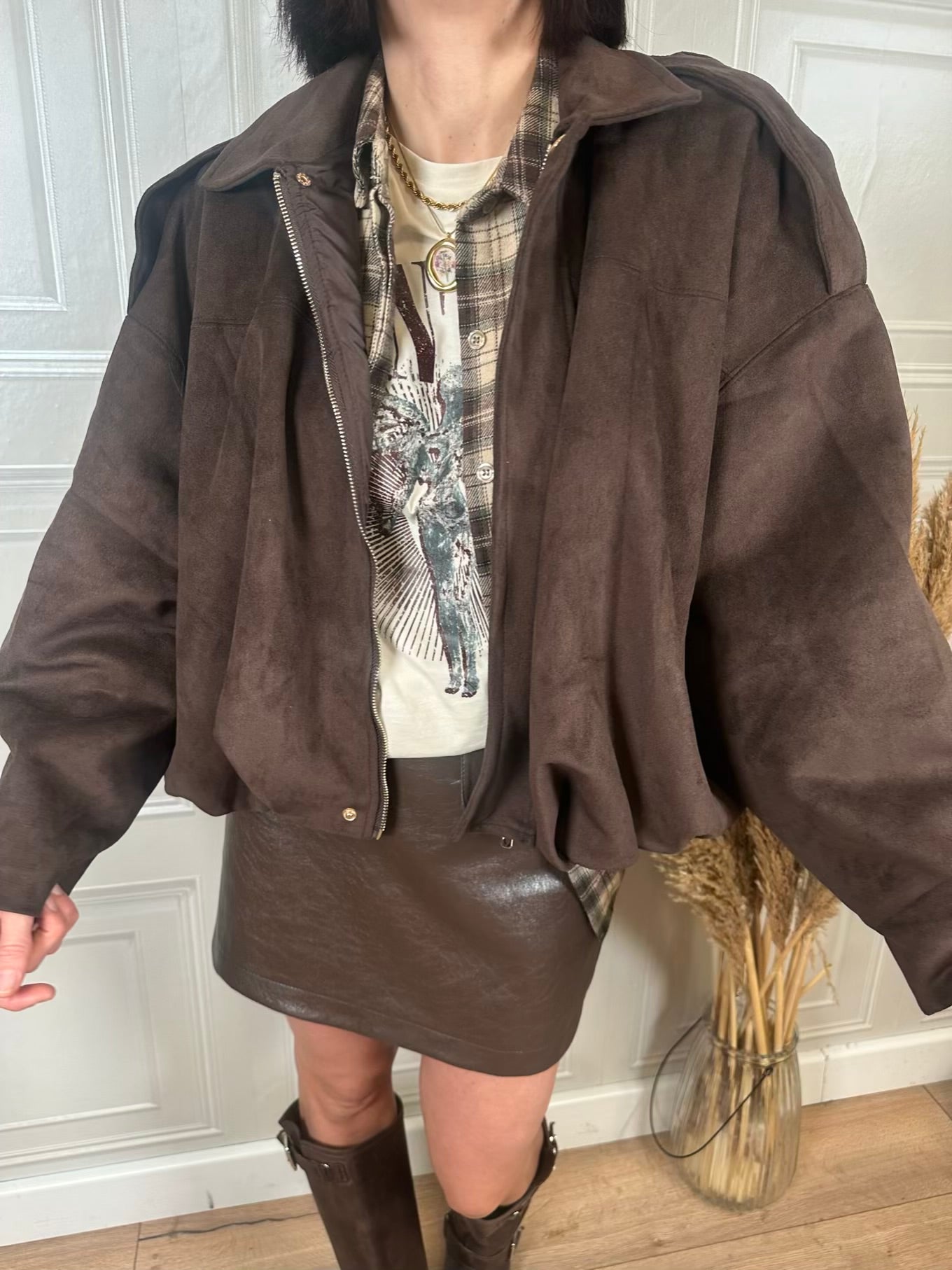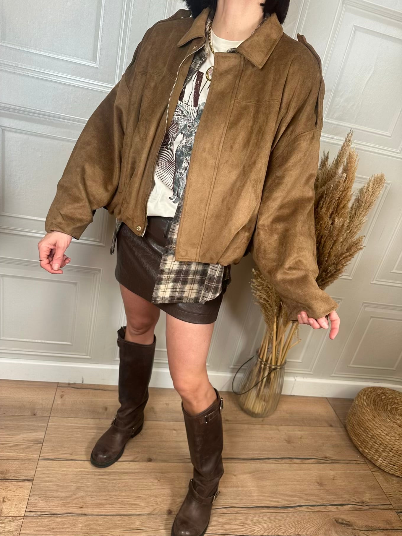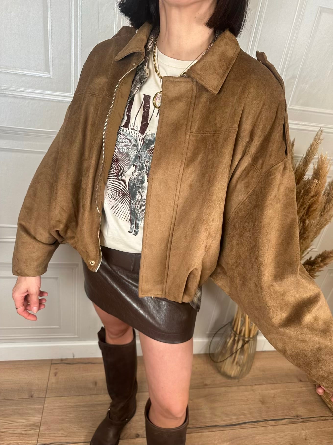 Bomber eco dainetto. Modello leggermente over, chiusura con zip frontale e bottoncini. Taglia unica