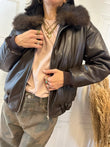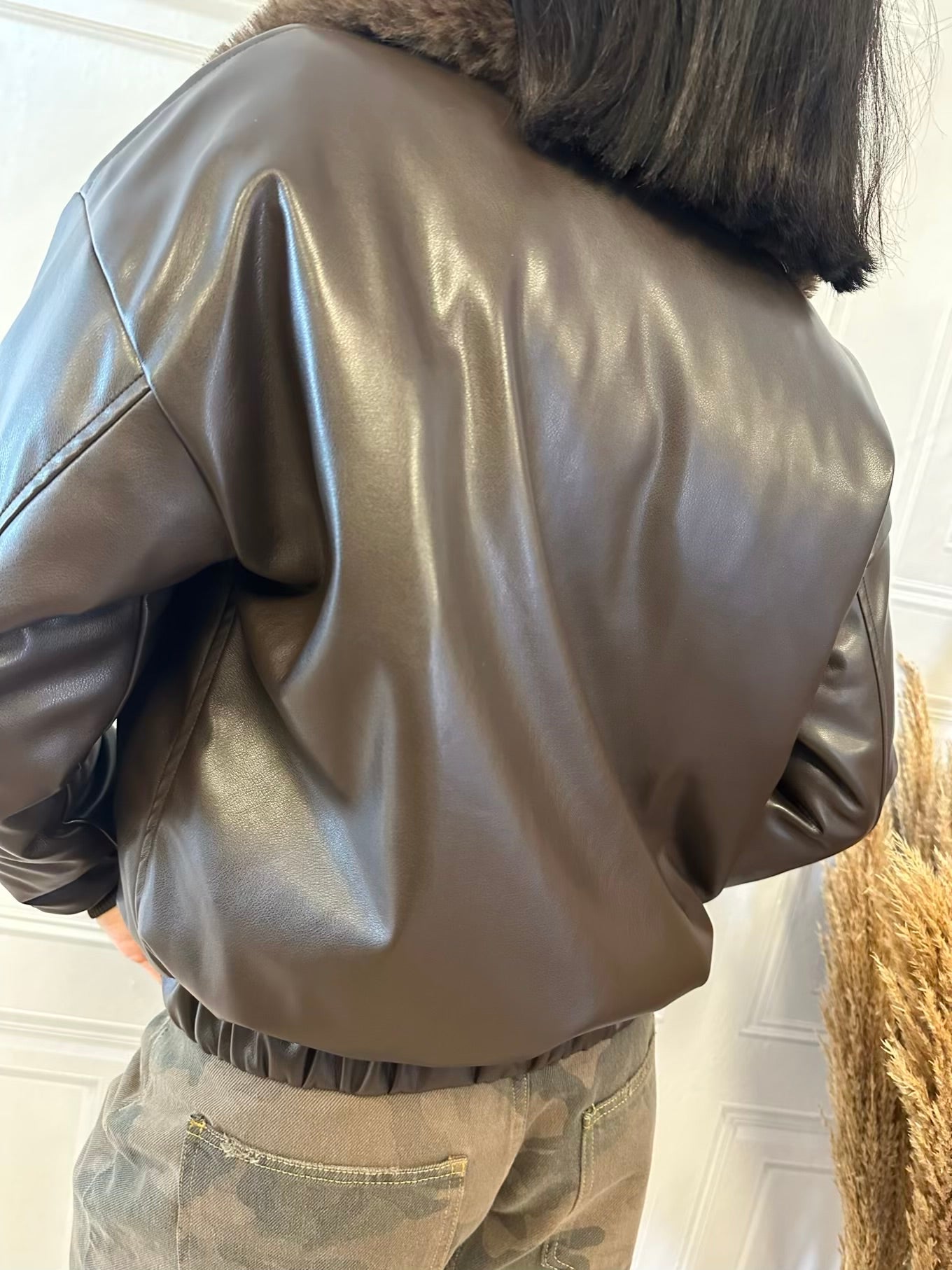 Giacca ecopelle moro . Modello a bomber con elastico sul fondo e sui polsini, con collo in ecofur rimovibile. Tasche laterali, chiusura con zip frontale. Trapuntato internamente Taglia unica, vestibilita’ leggermente morbida