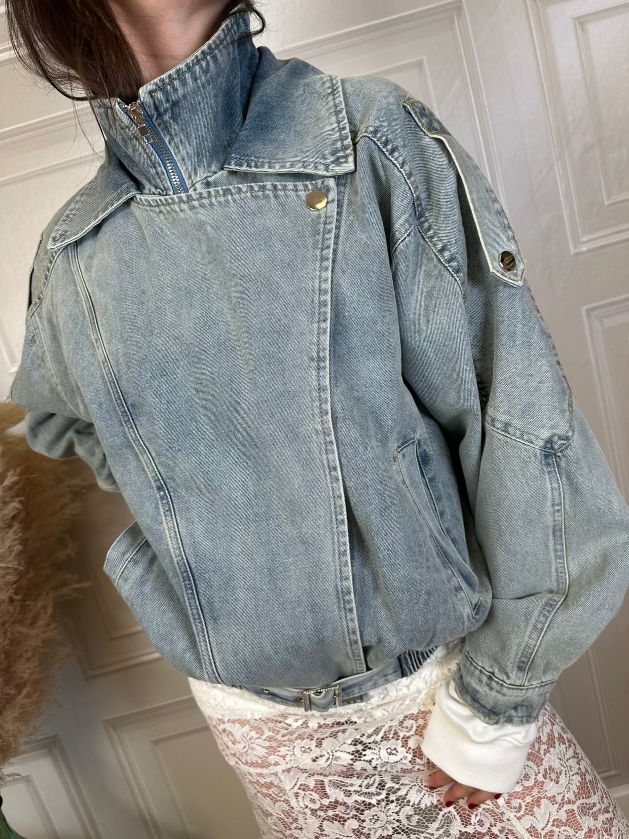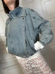 giacca in denim. Modello a bomber con elastico in vita e cintura sul fronte. Doppio colletto. chiusura con zip e patta asimmetrica con automatico. Tasche laterali.