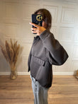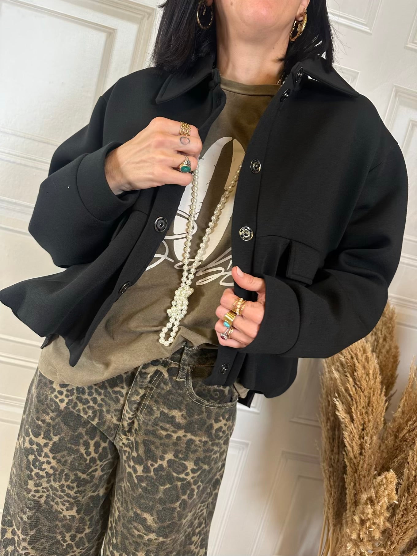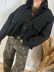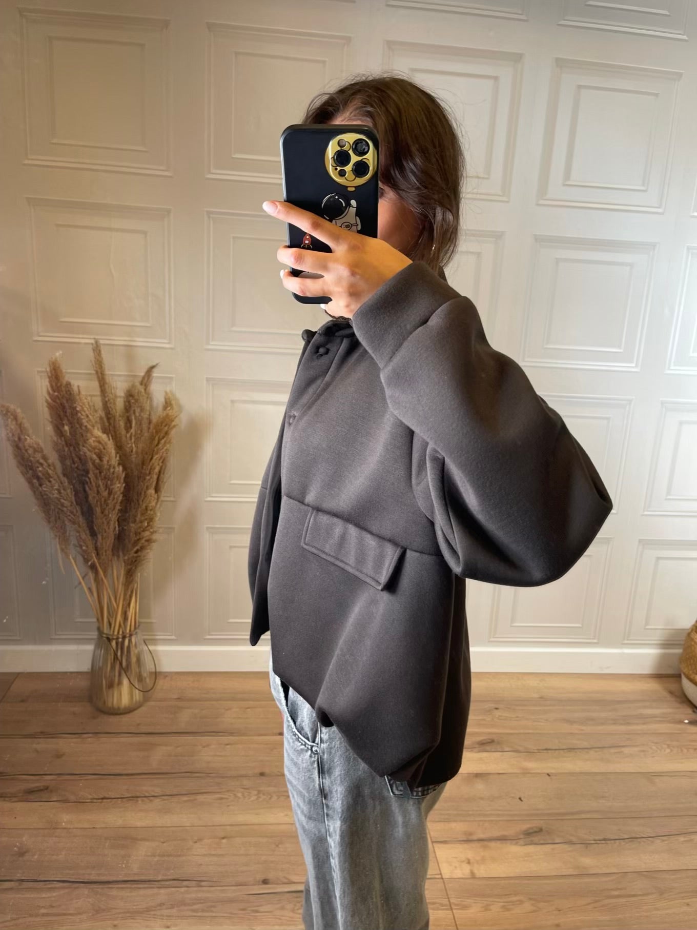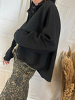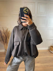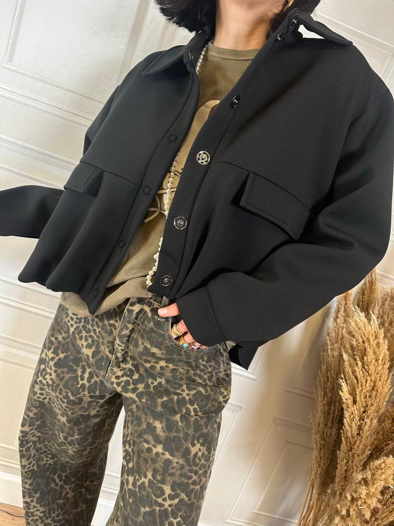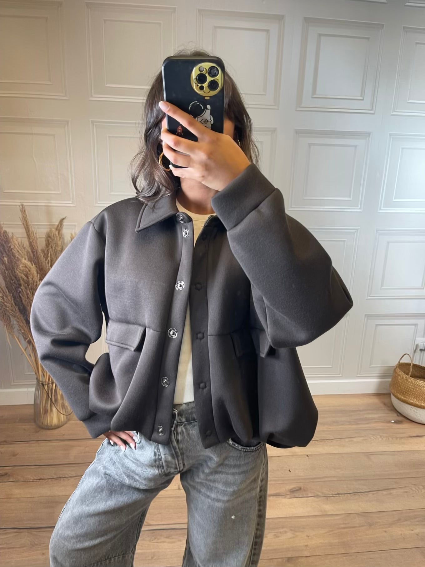 Bomber scuba in tessuto tecnico. Modello leggermente over, con taschino compatta anteriori, arricciatura effetto rimborso sul davanti, leggermente più lungo sul retro. Chiusura con automatici a scomparsa. Taglia unica