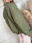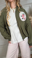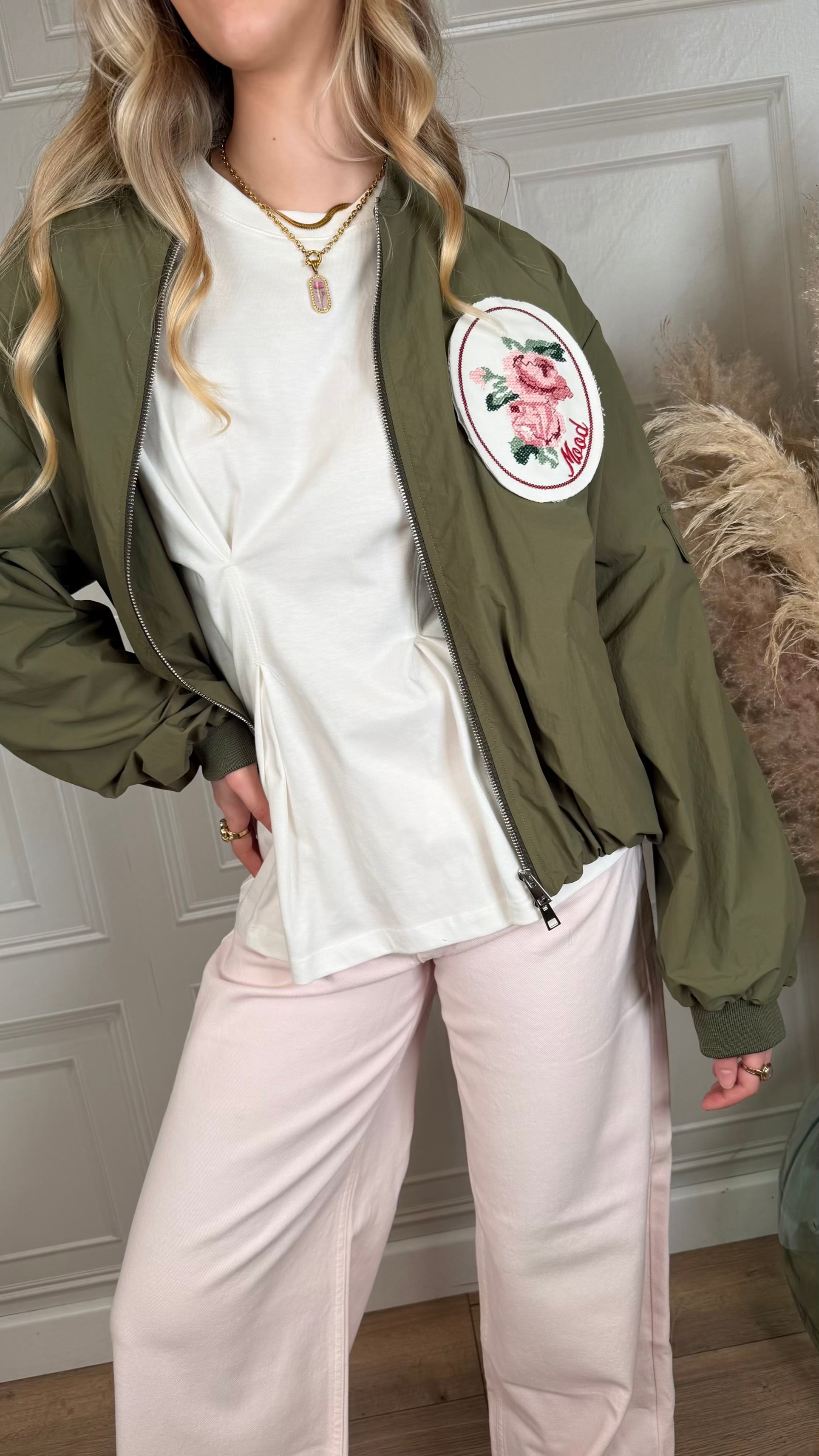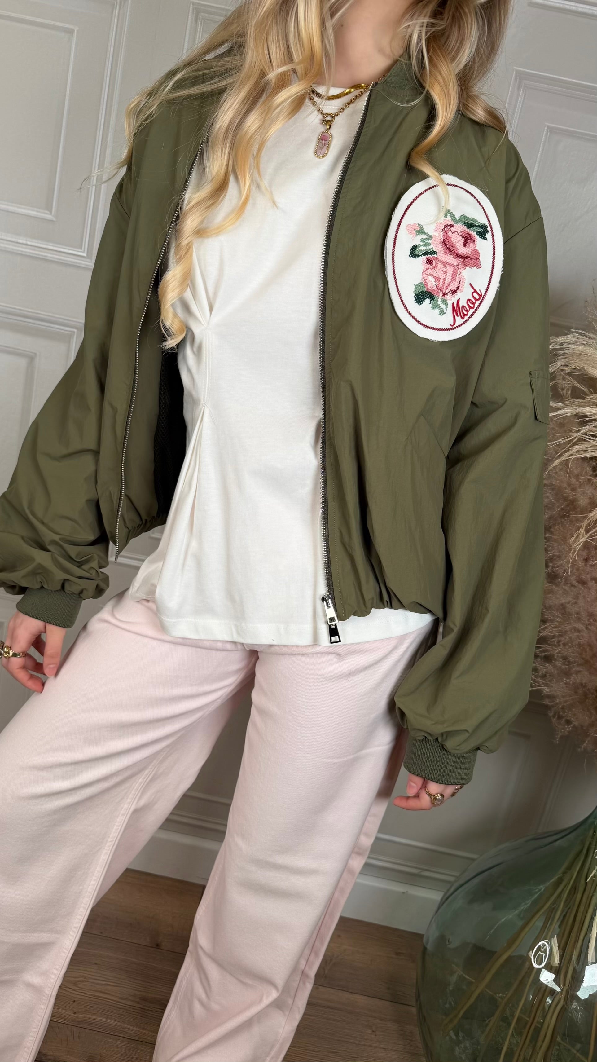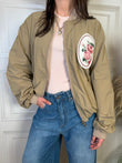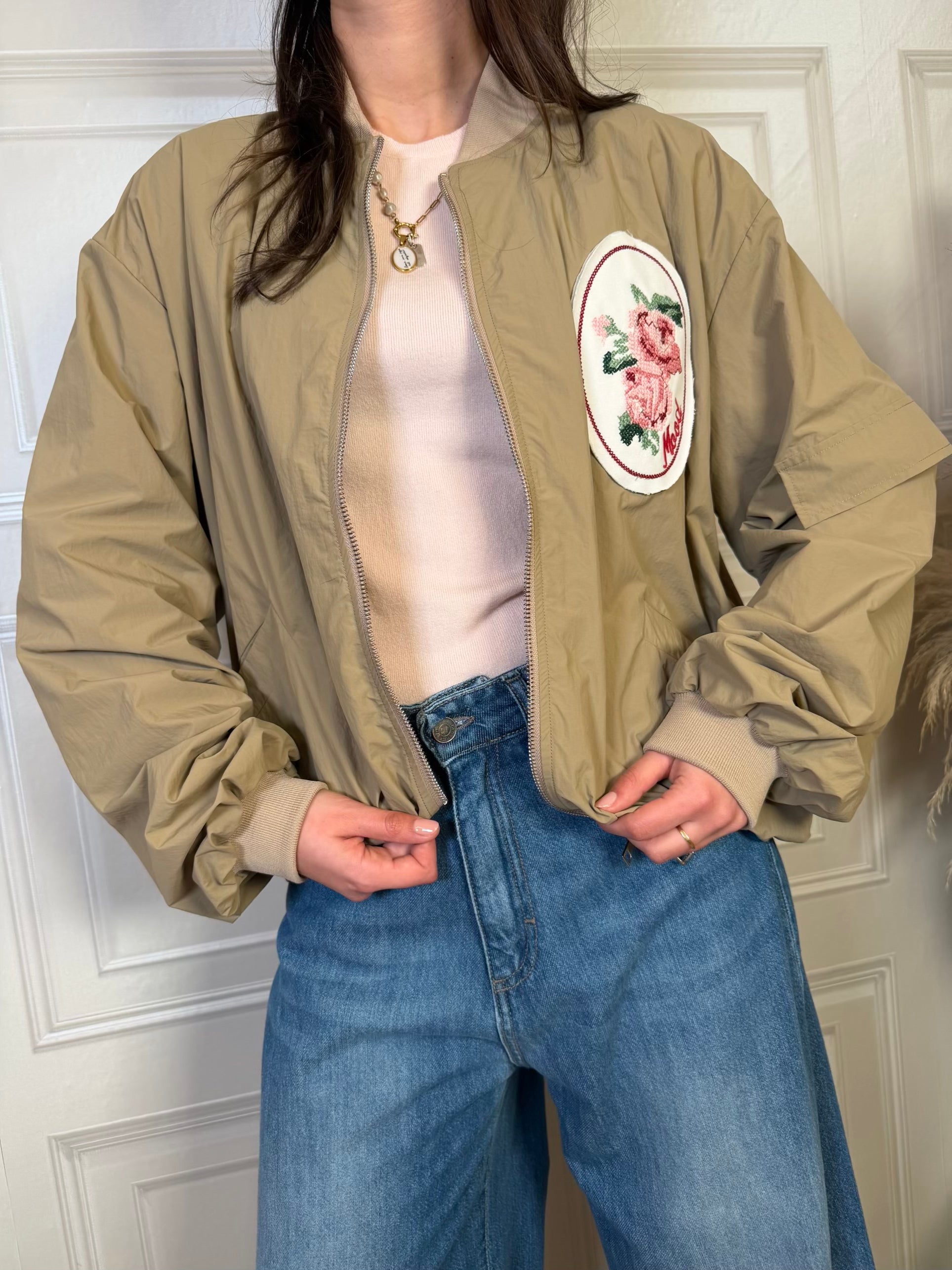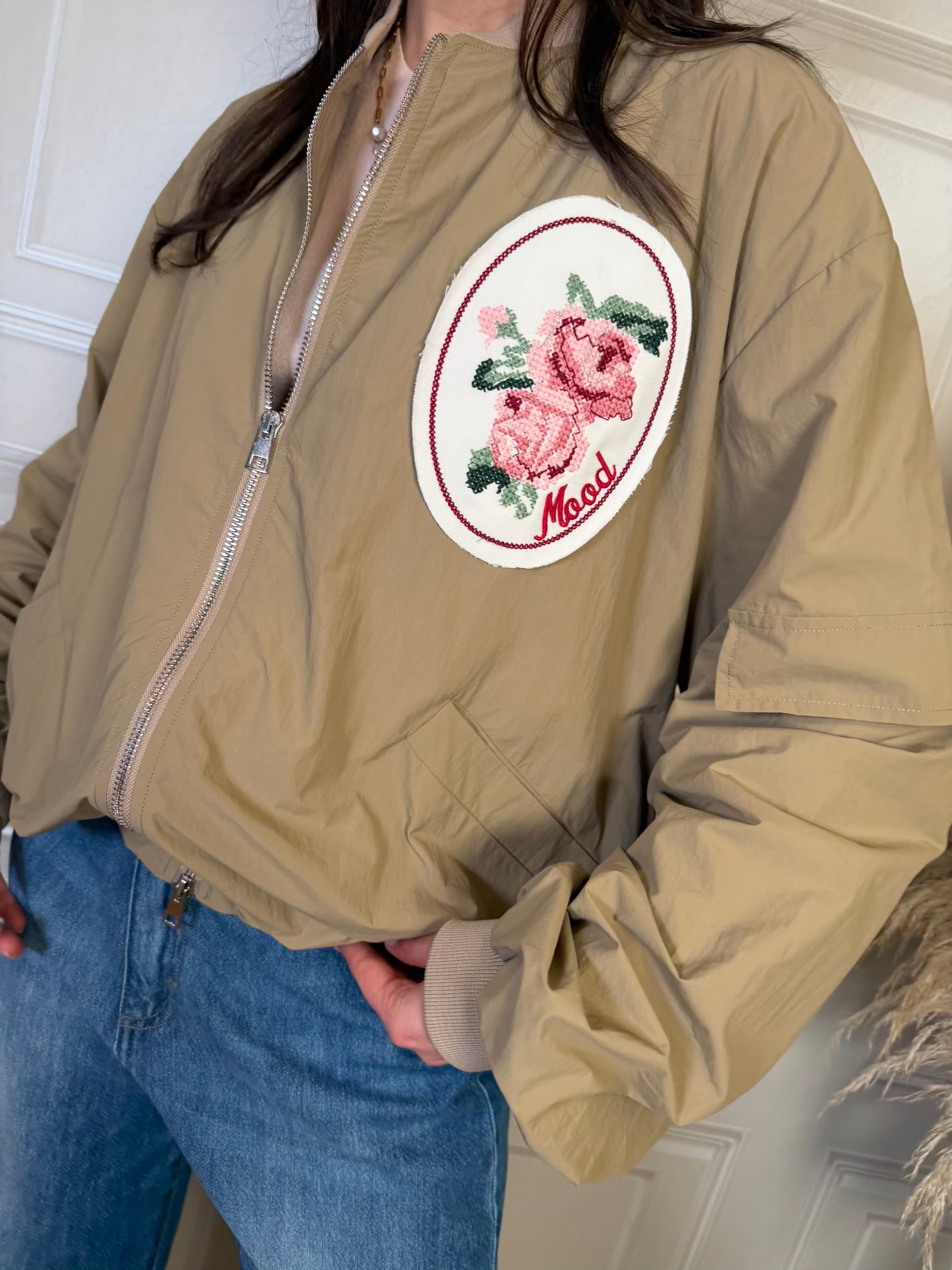 Bomber in tessuto impermeabilizzato. Patch con ricamo sul fronte. Elastico su polsi e in vita. Tasche frontali. Chiusura con zip. Fodera interna in rete traspirante.