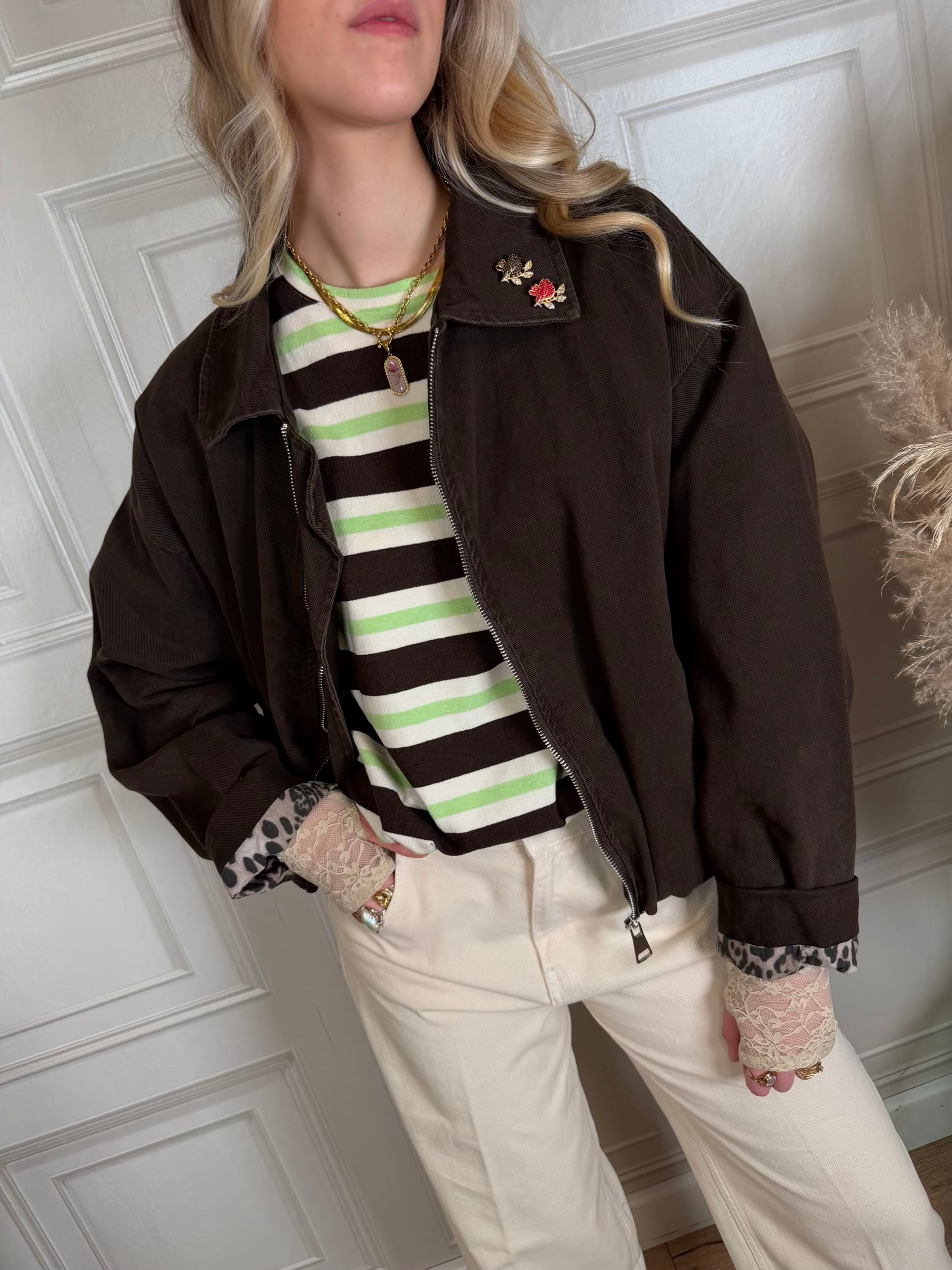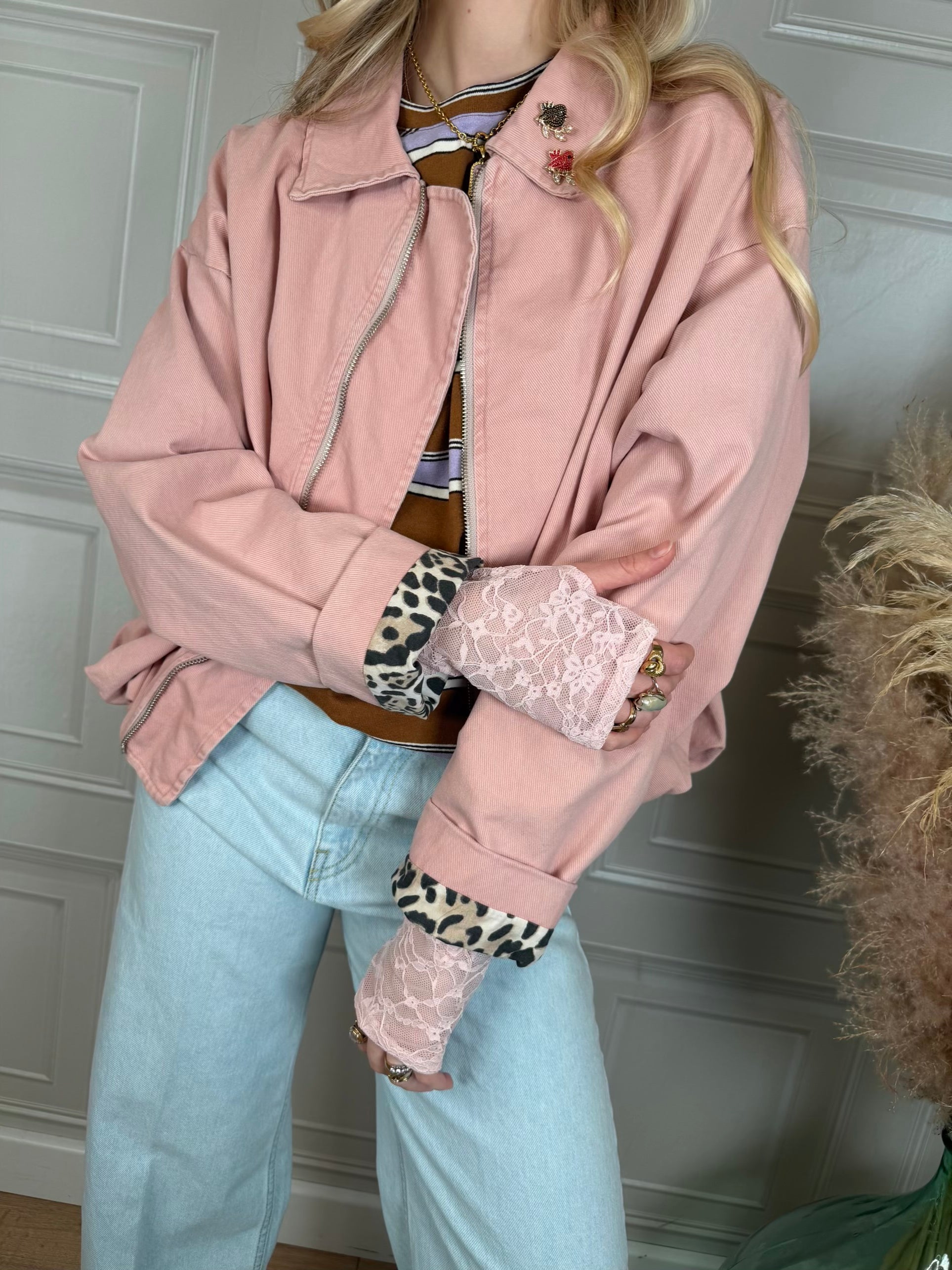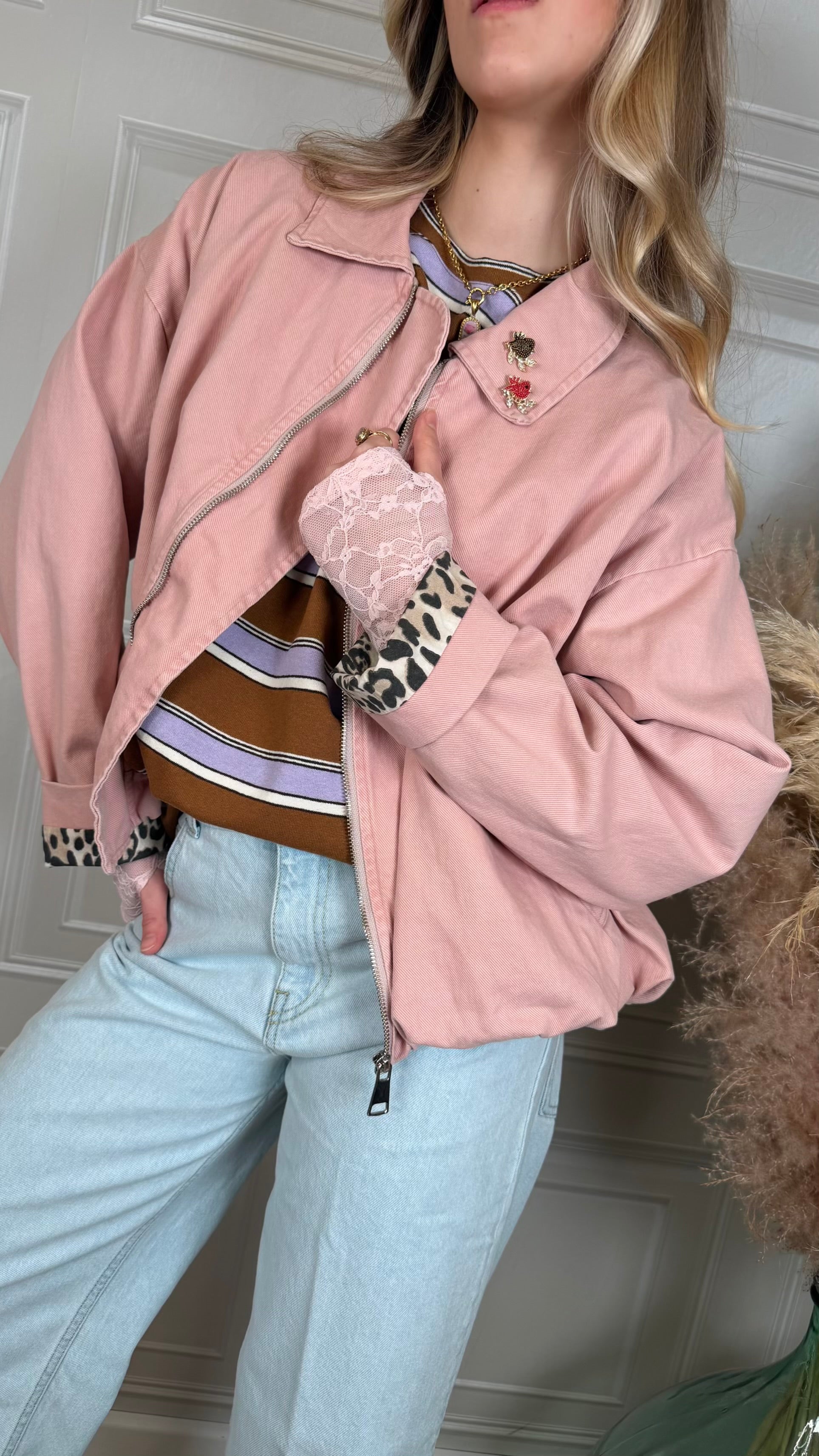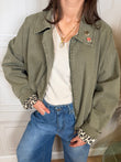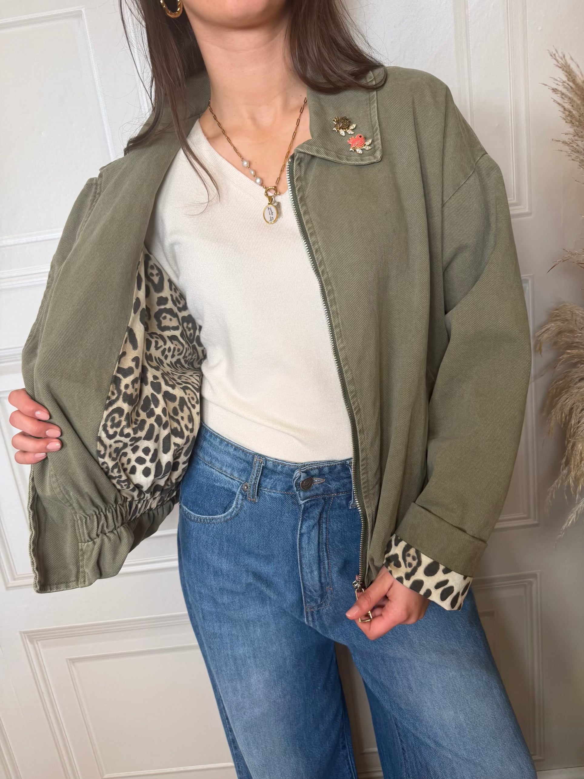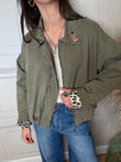 Bomber tessuto jeans tinto capo. Elastico sul fondo. Dettaglio di spillette removibili sul collo. Tasche frontali. Chiusura con zip. Fodera interna maculata.