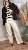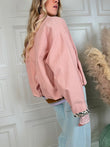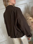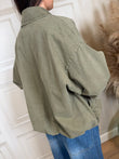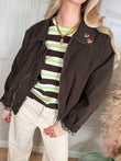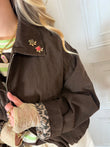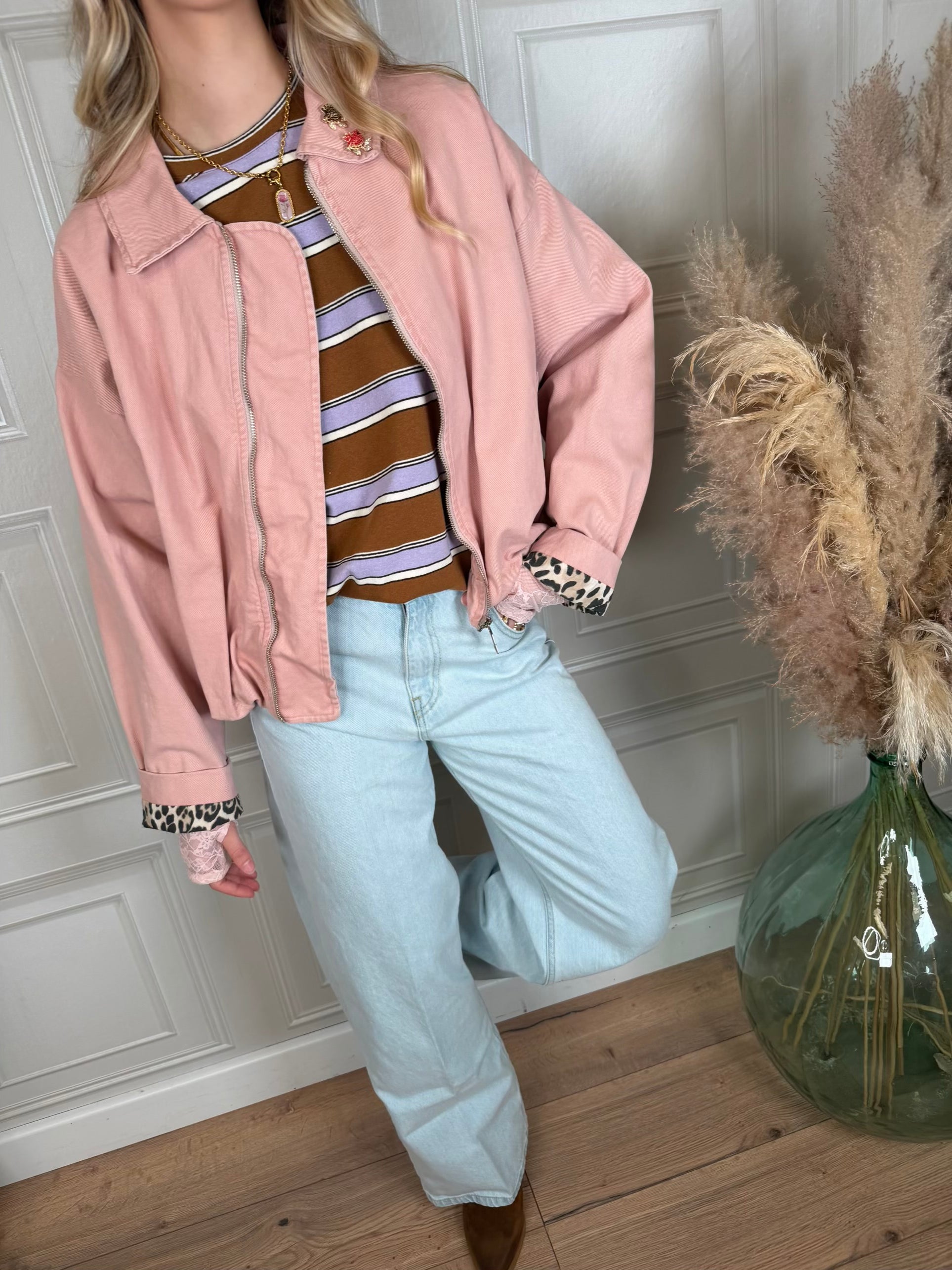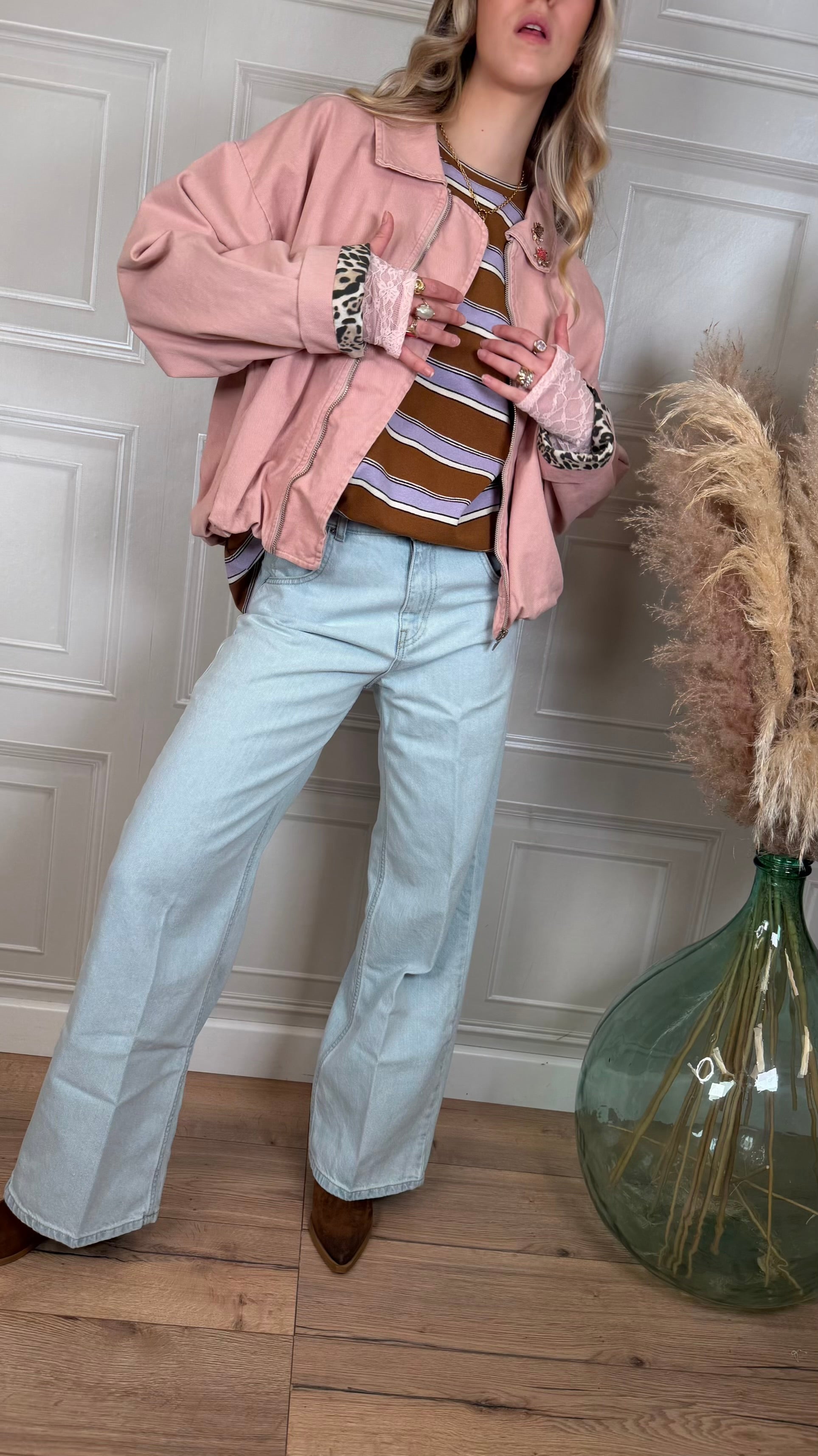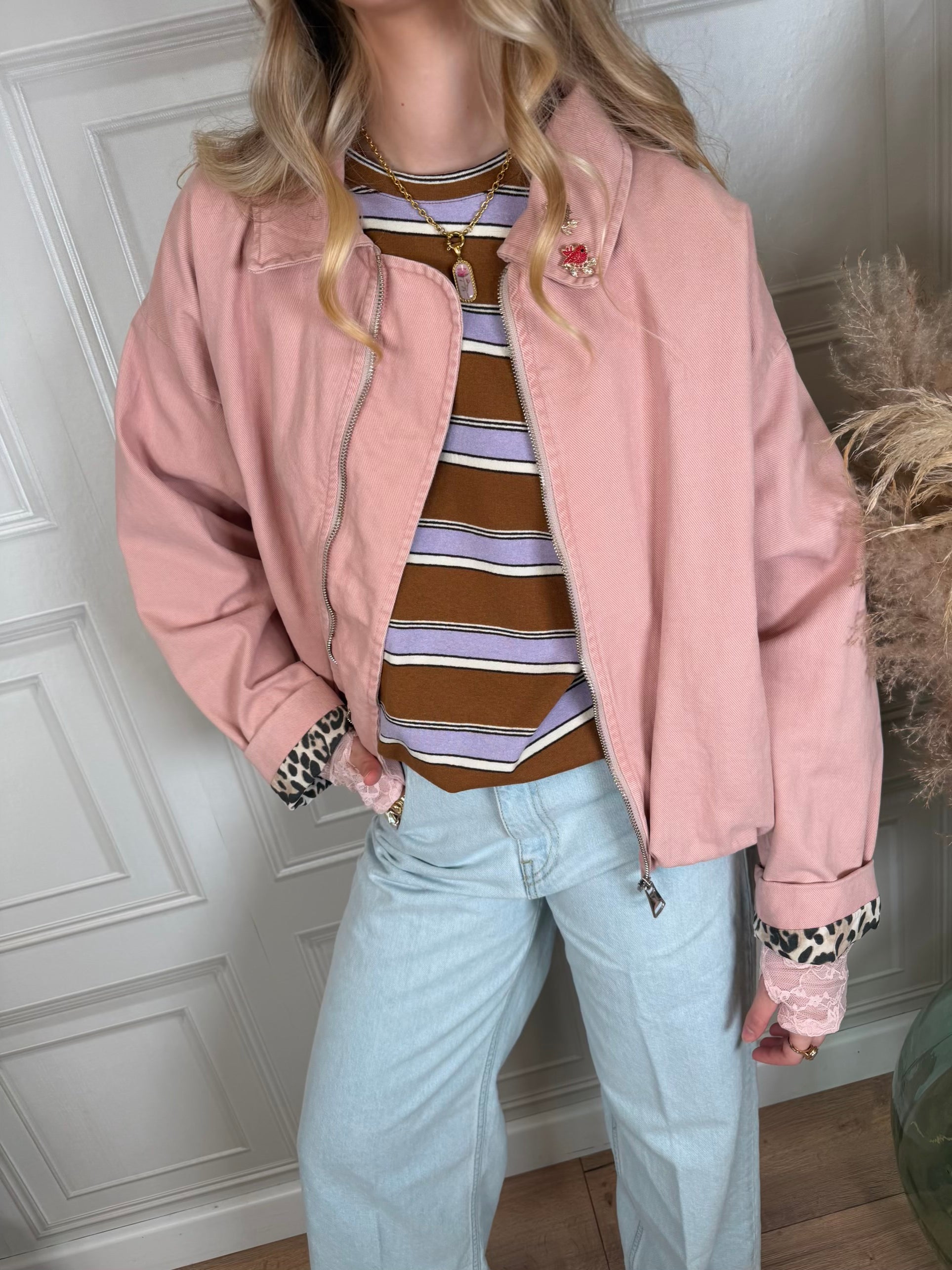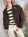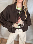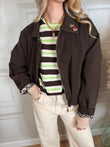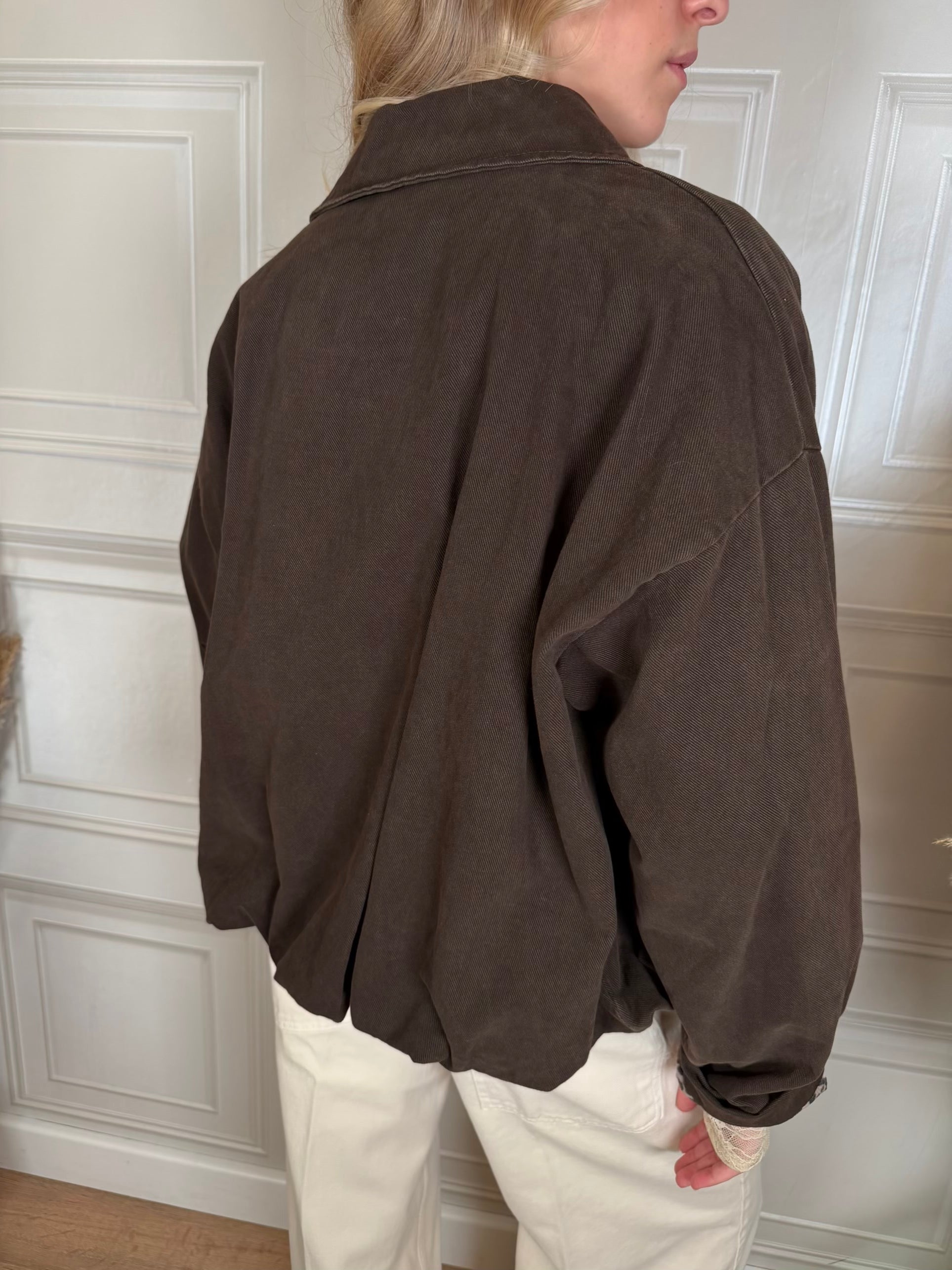 Bomber tessuto jeans tinto capo. Elastico sul fondo. Dettaglio di spillette removibili sul collo. Tasche frontali. Chiusura con zip. Fodera interna maculata.