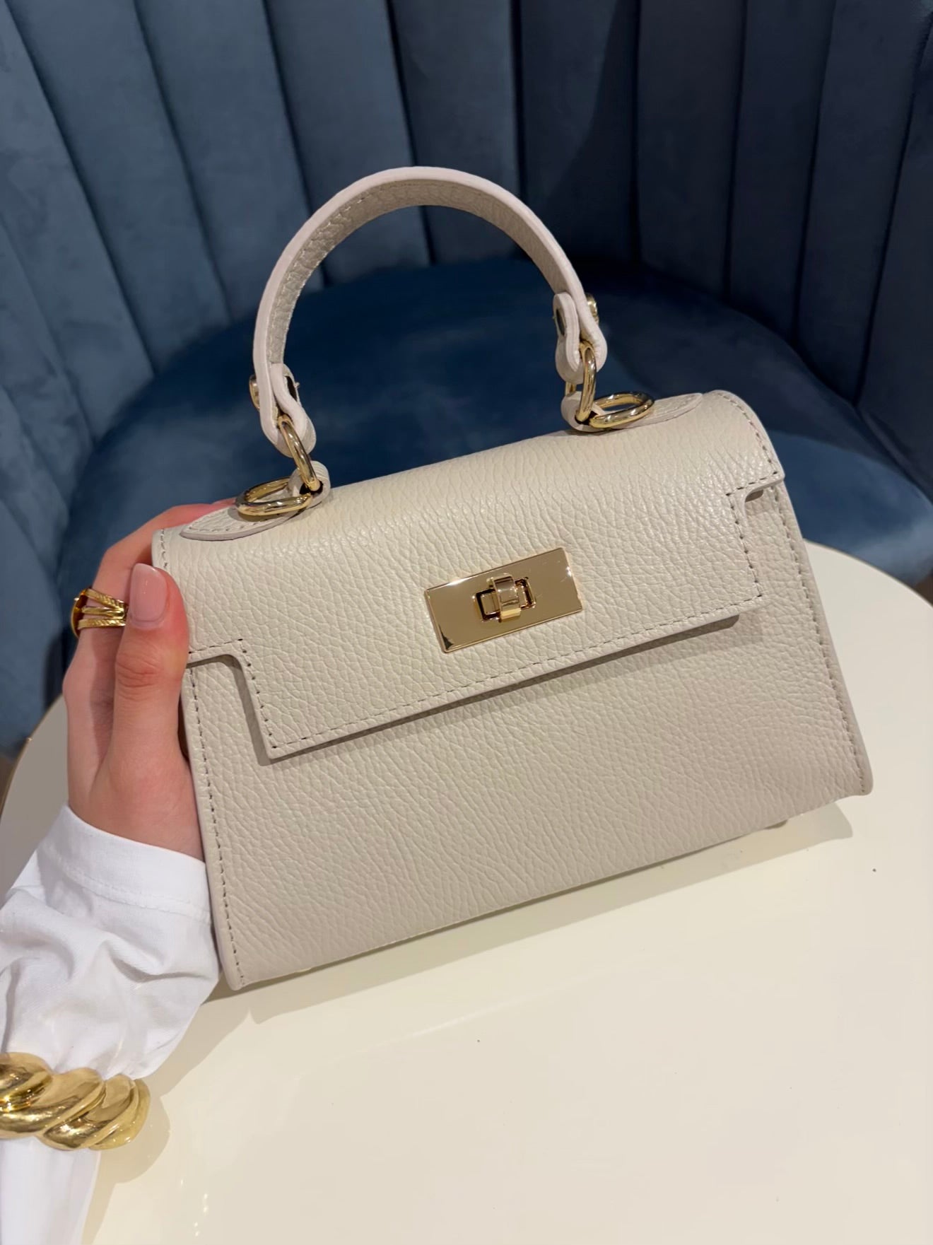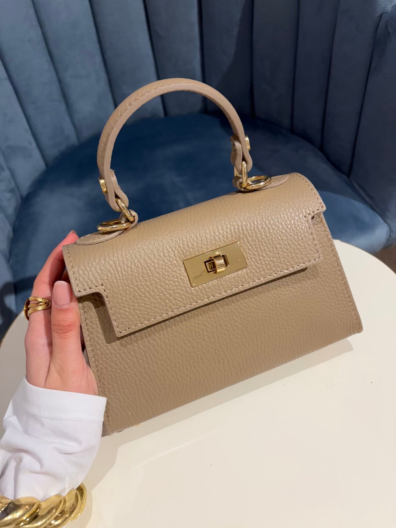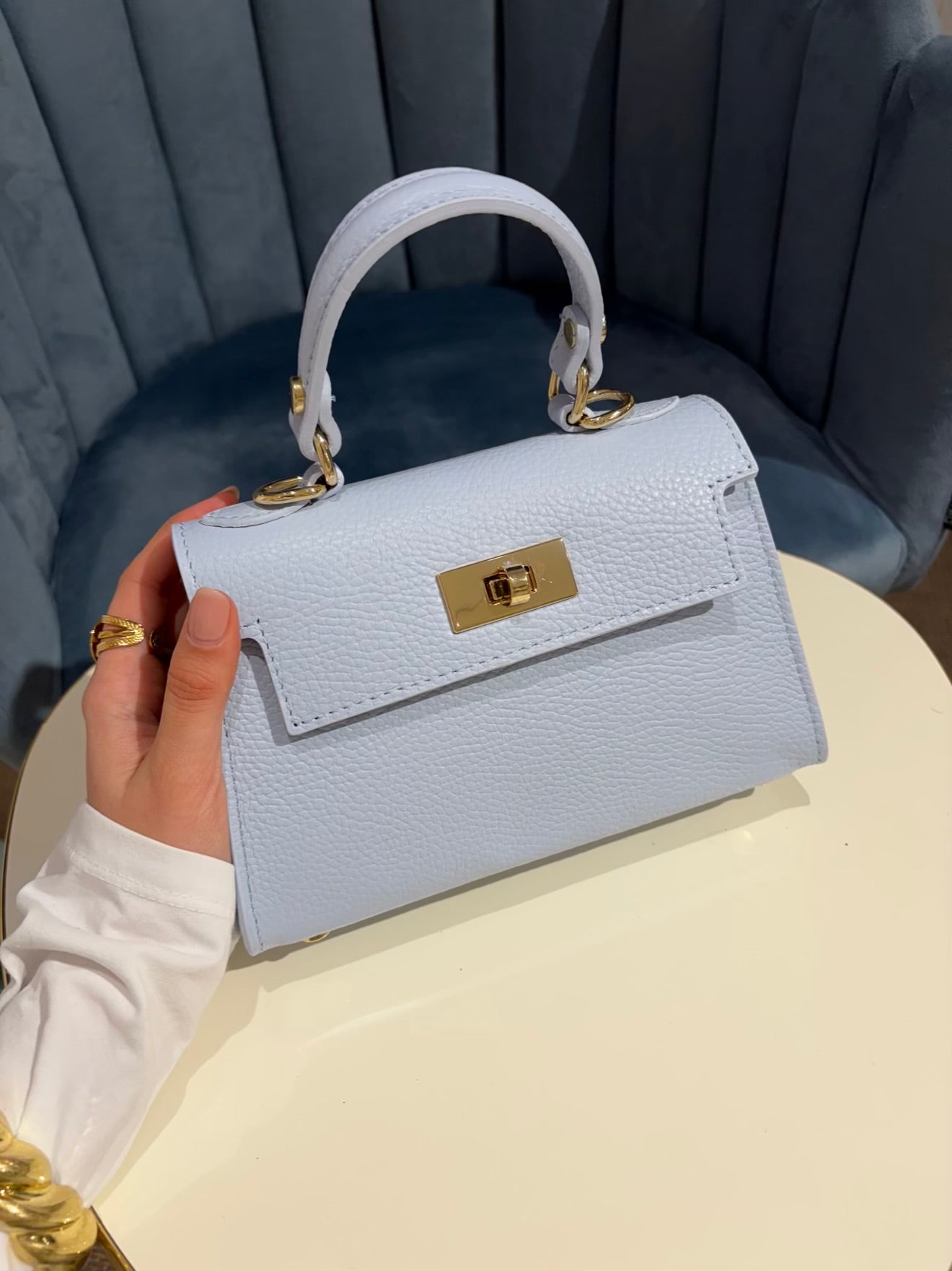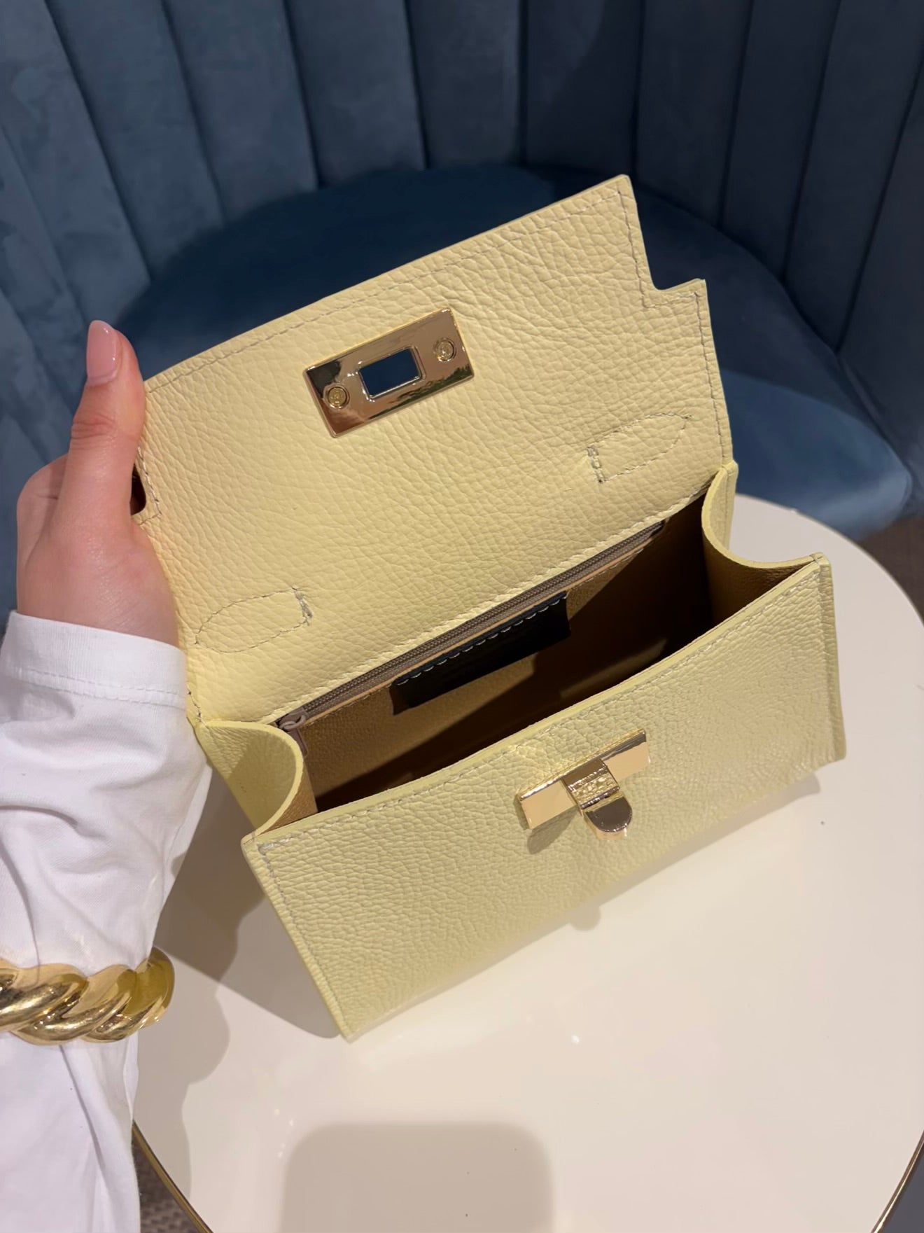 Taschina con zip interna. Dotata di tracollina in pelle con ganci.