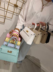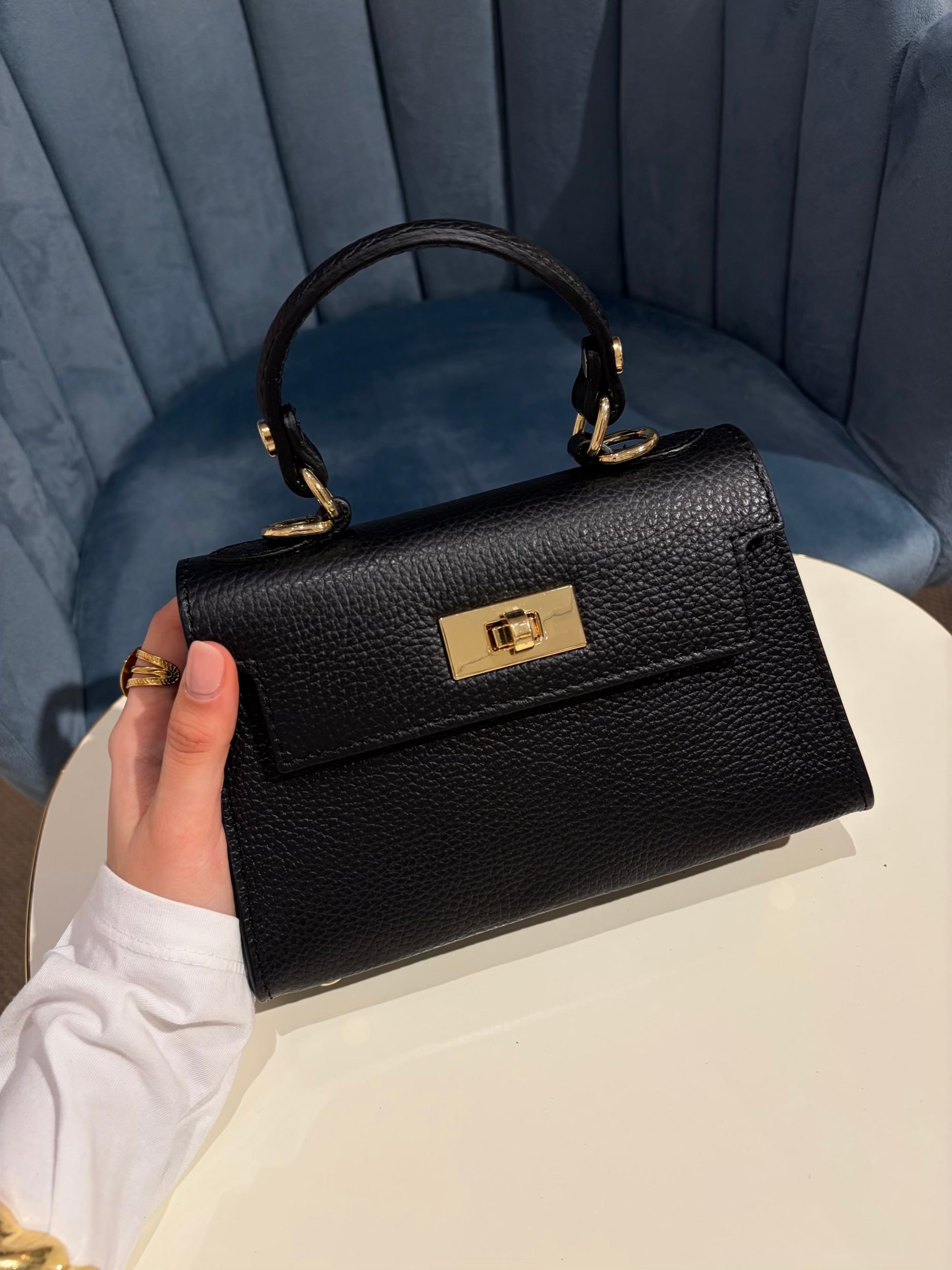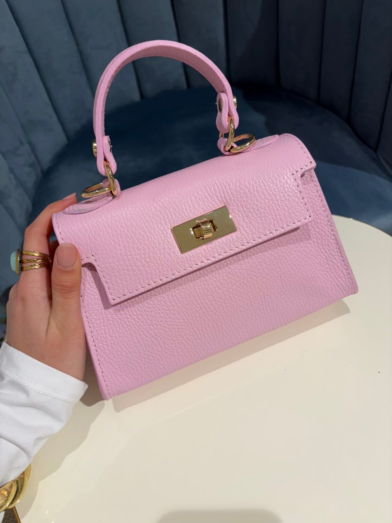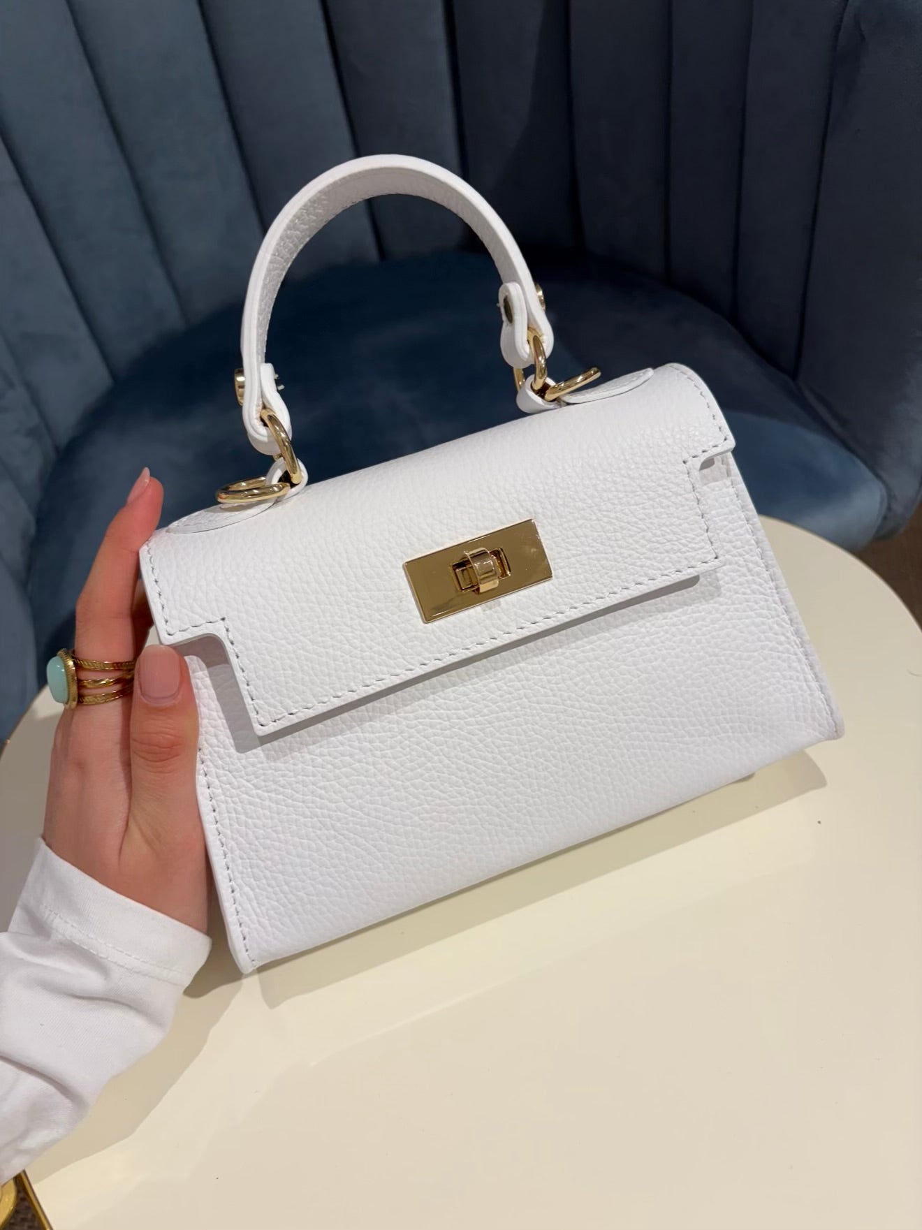 Taschina con zip interna. Dotata di tracollina in pelle con ganci.