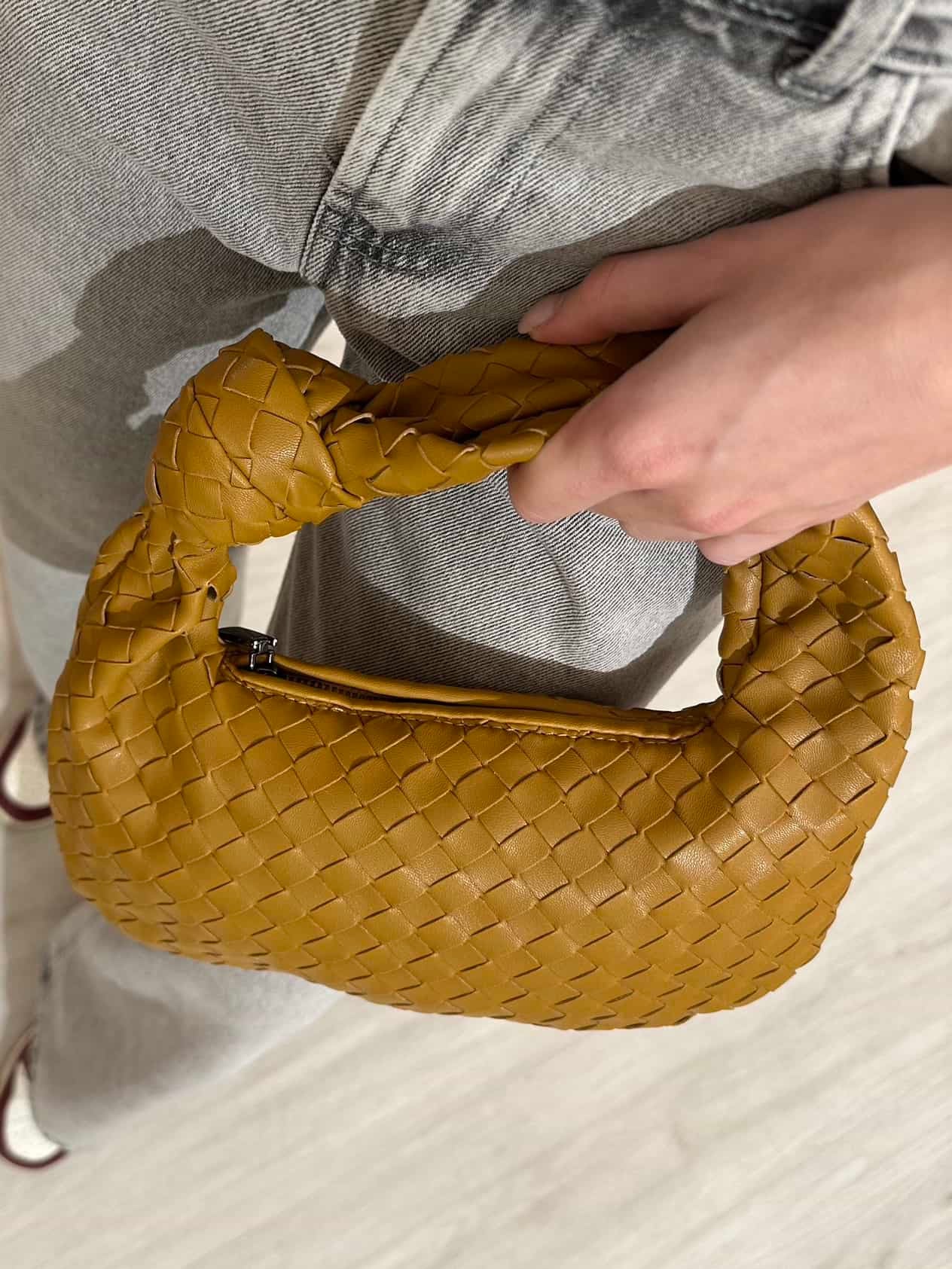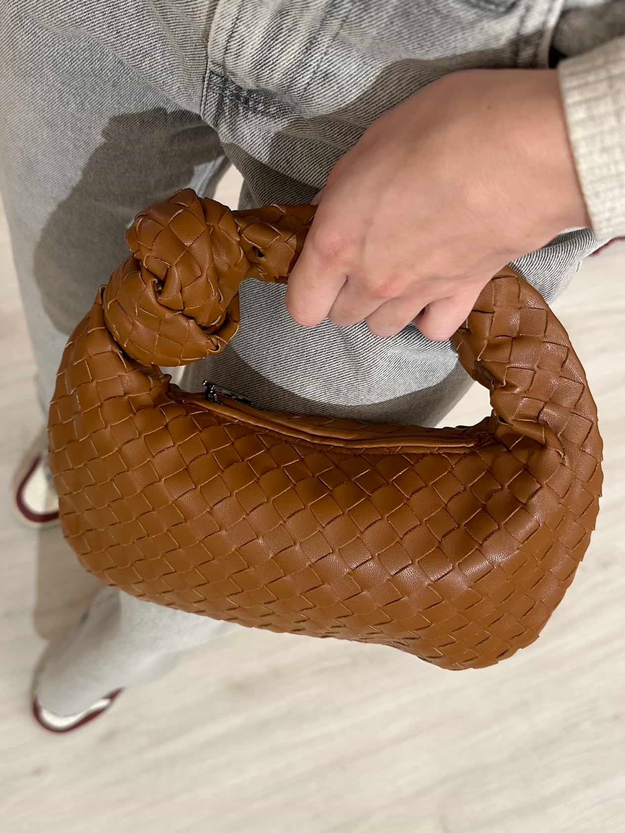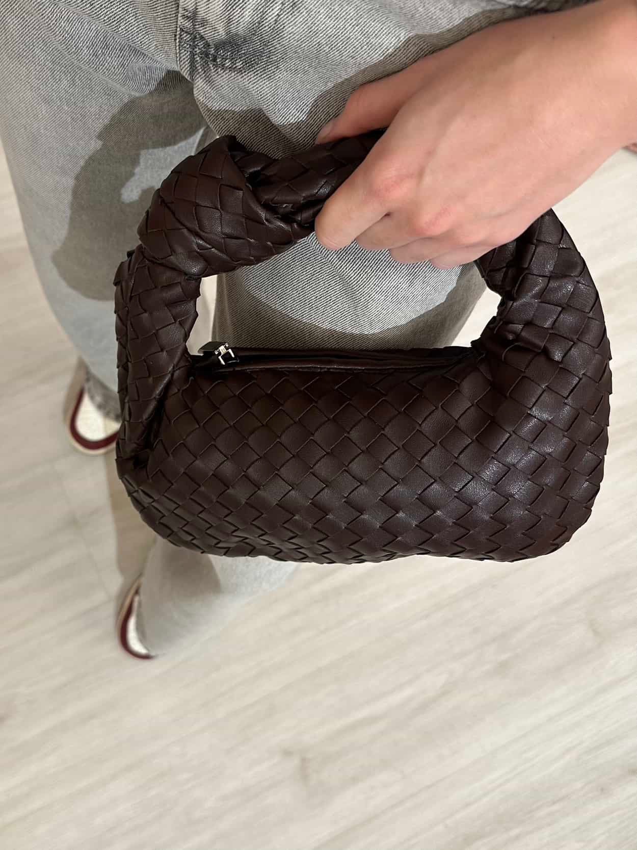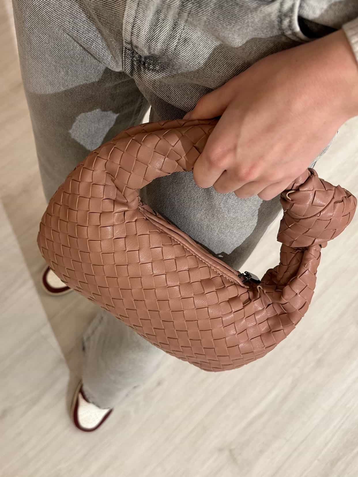 Borsa intrecciata con nodo sul manico. Chiusura con cerniera.