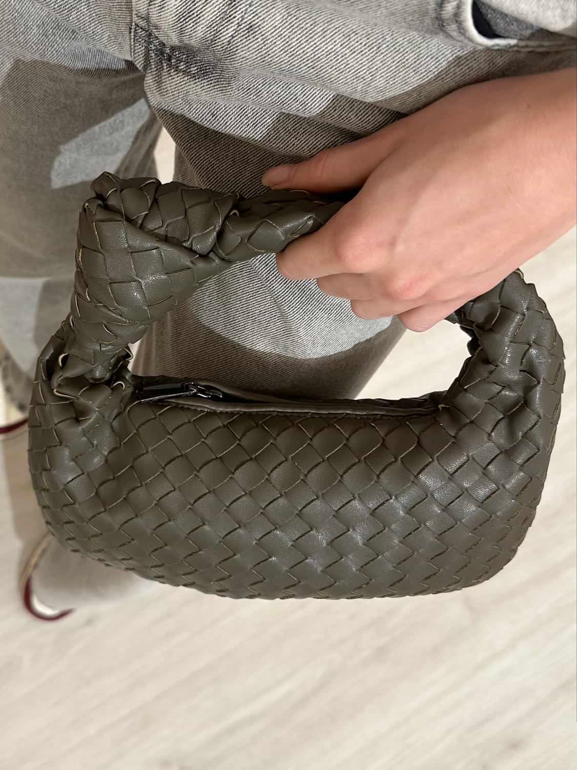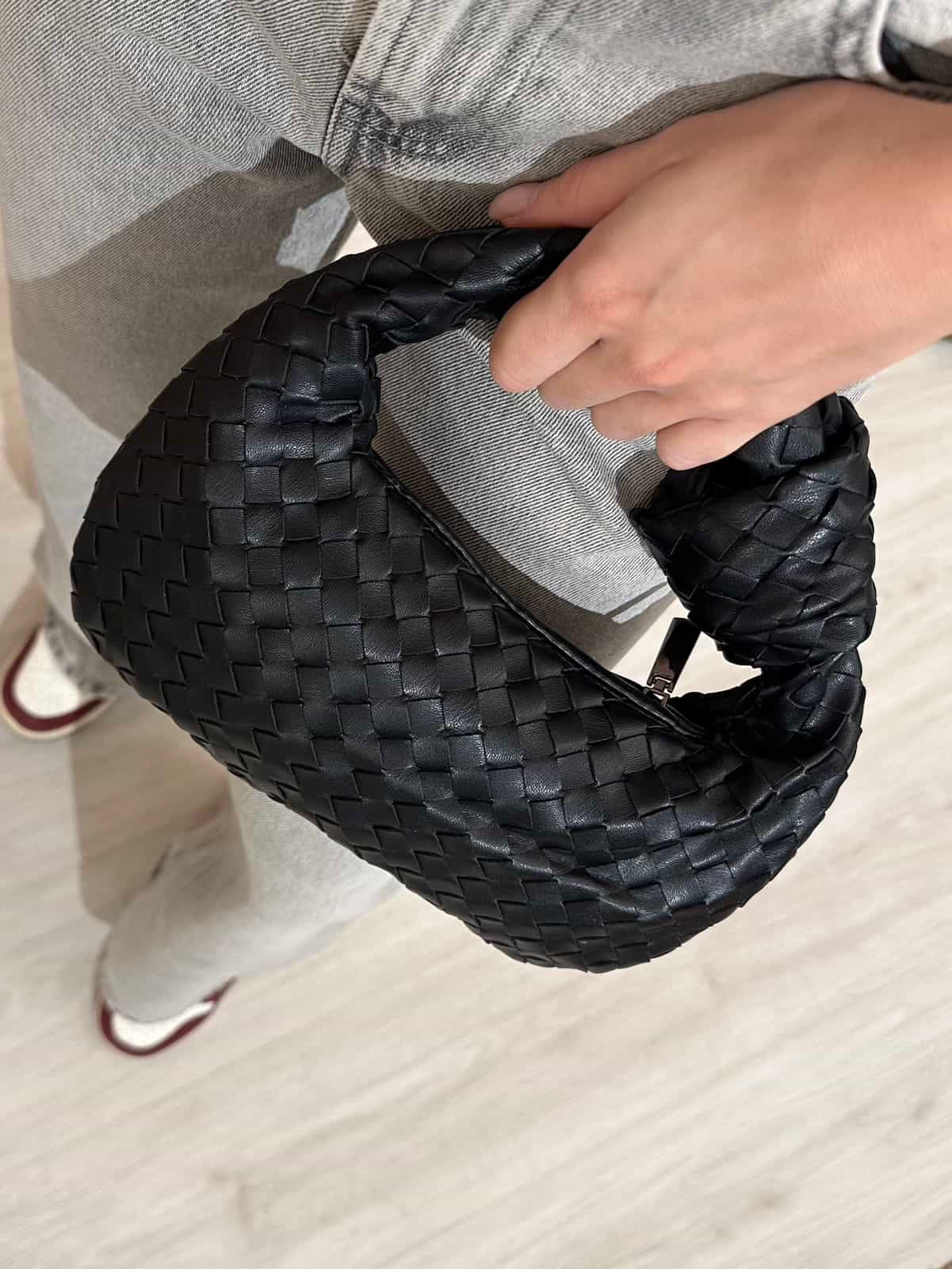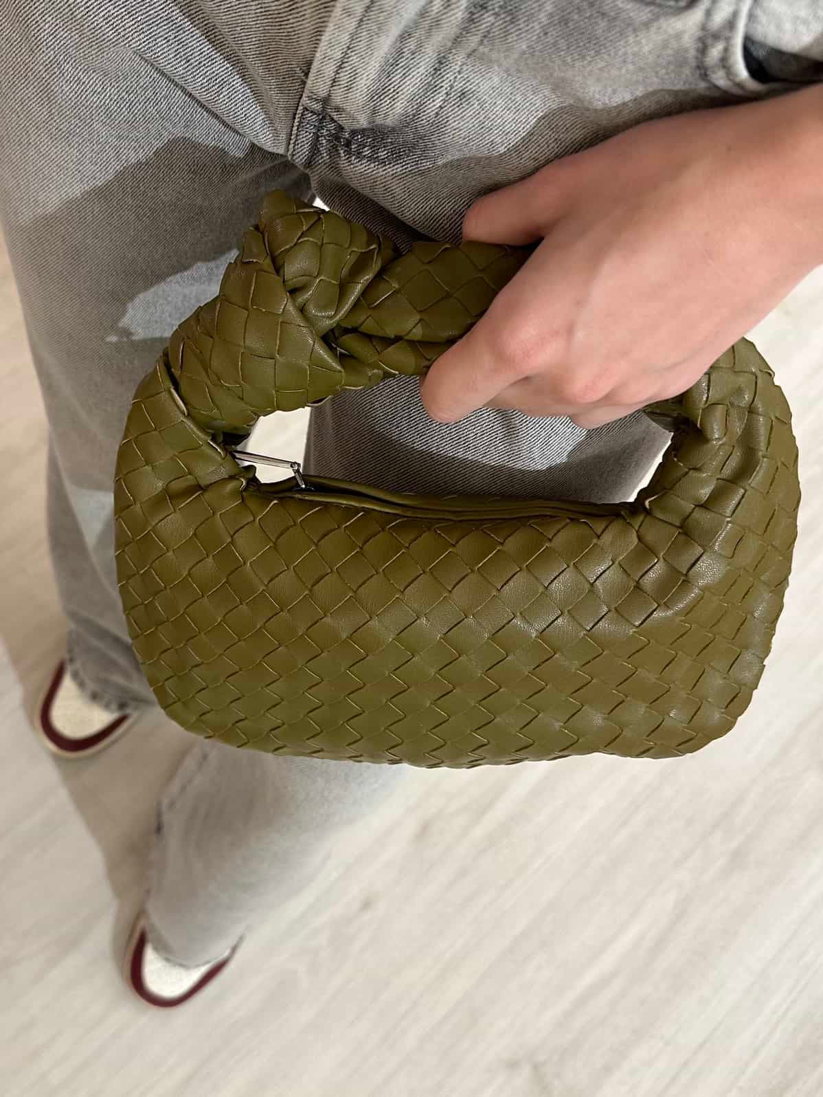 Borsa intrecciata con nodo sul manico. Chiusura con cerniera.