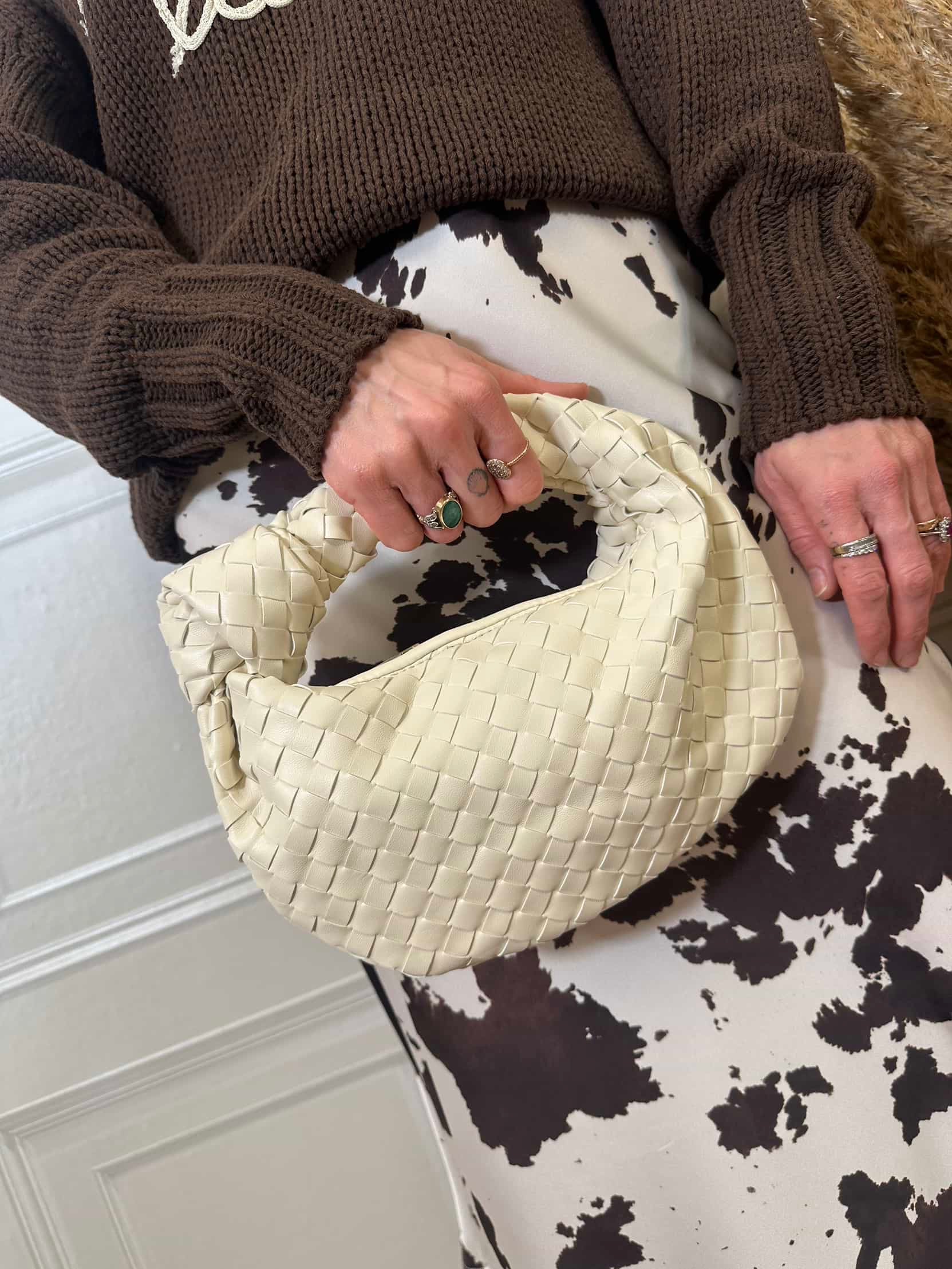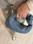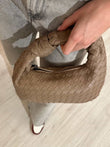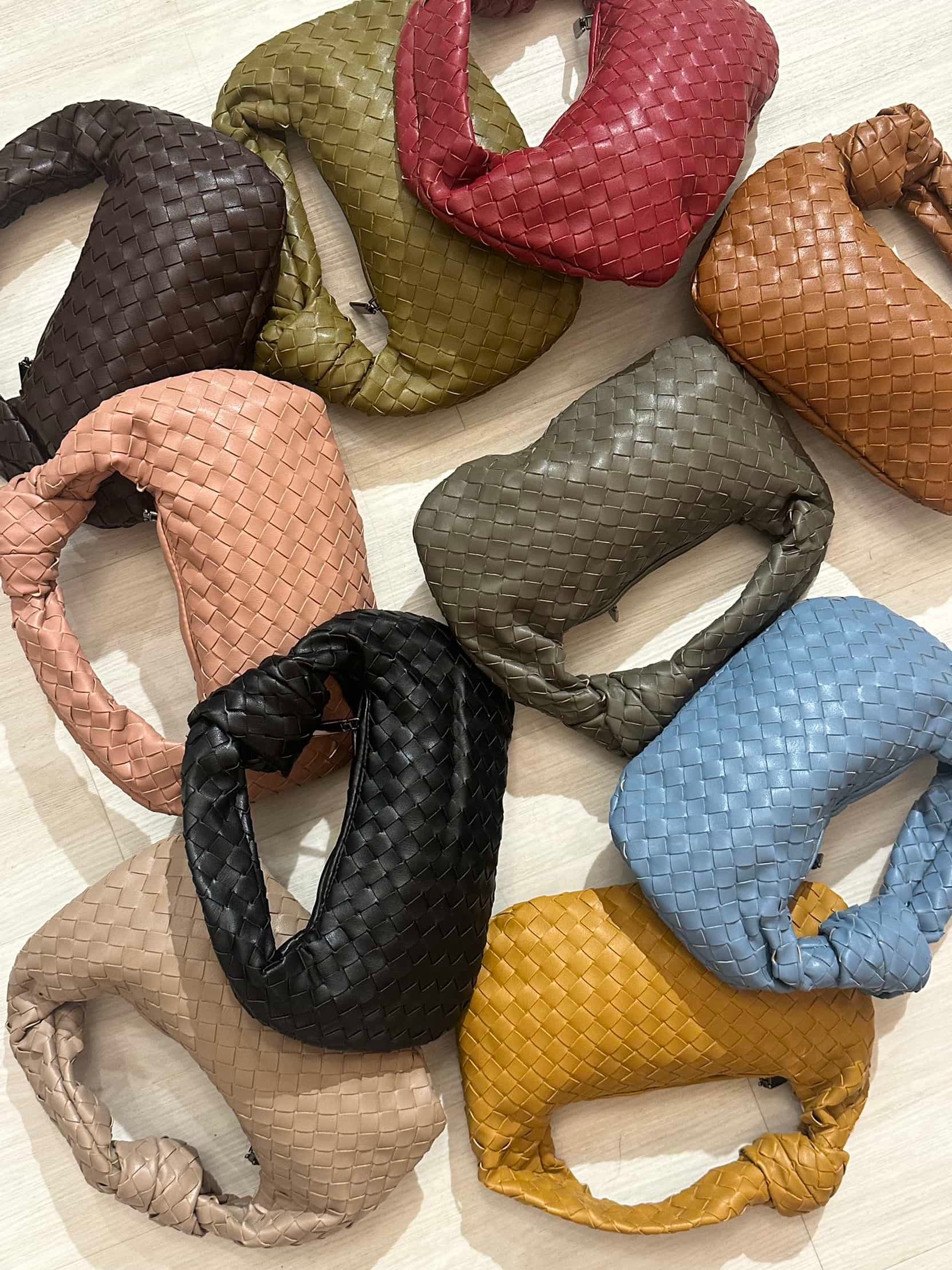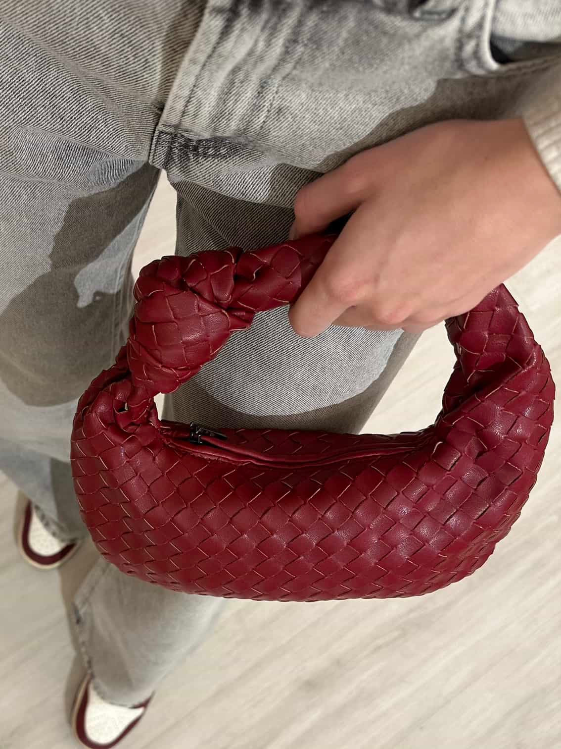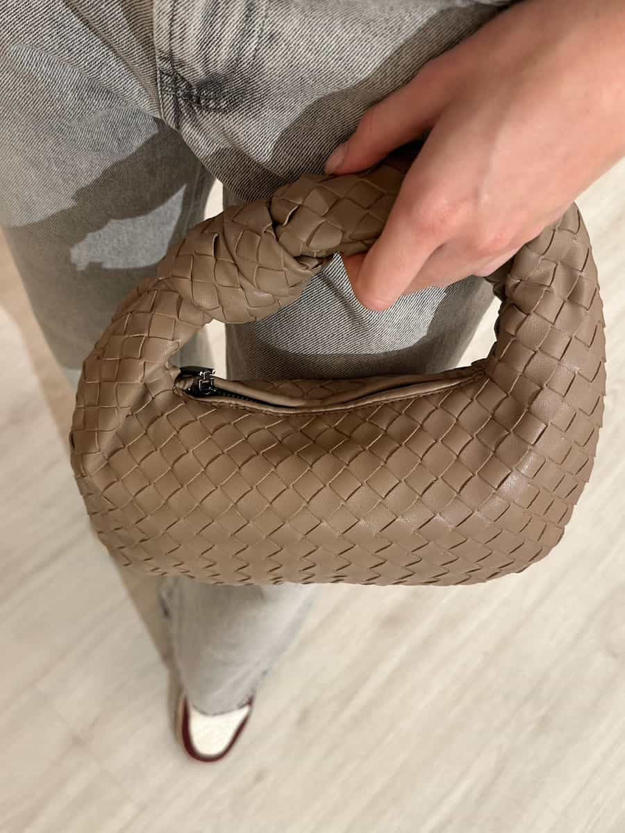 Borsa intrecciata con nodo sul manico. Chiusura con cerniera.