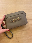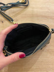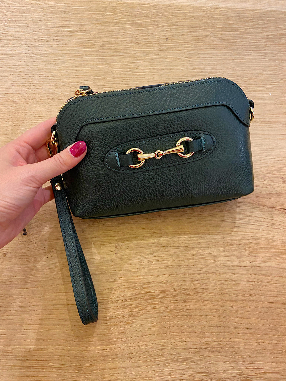 Borsa piccola con cerniera singola con morsetto applicato sul davanti.