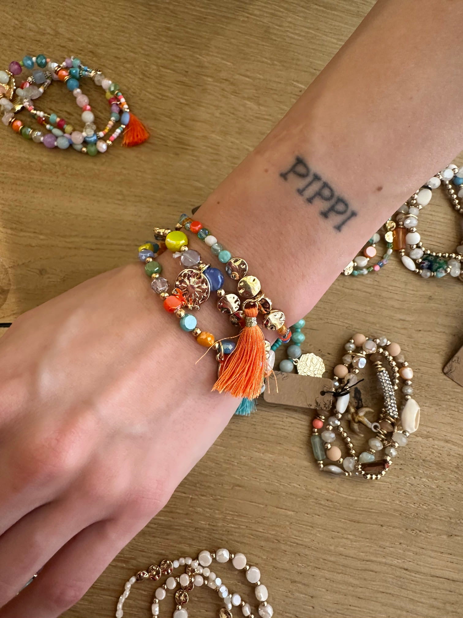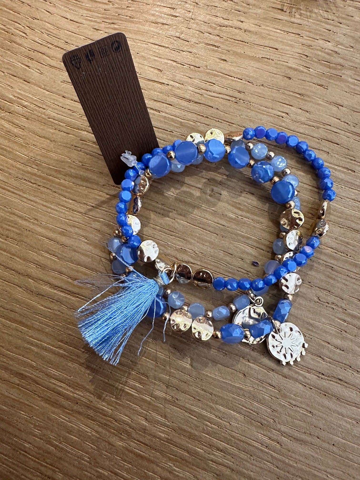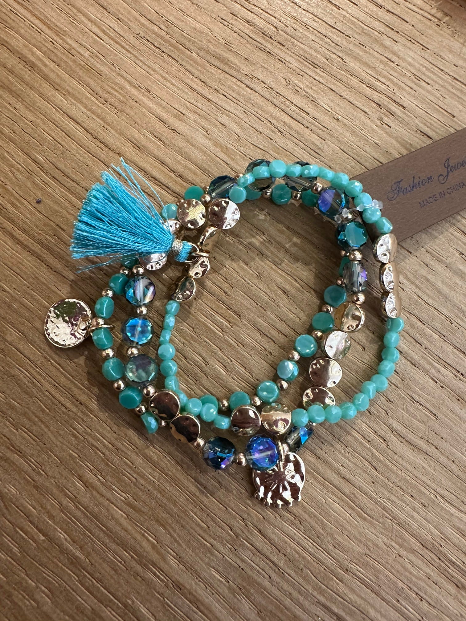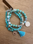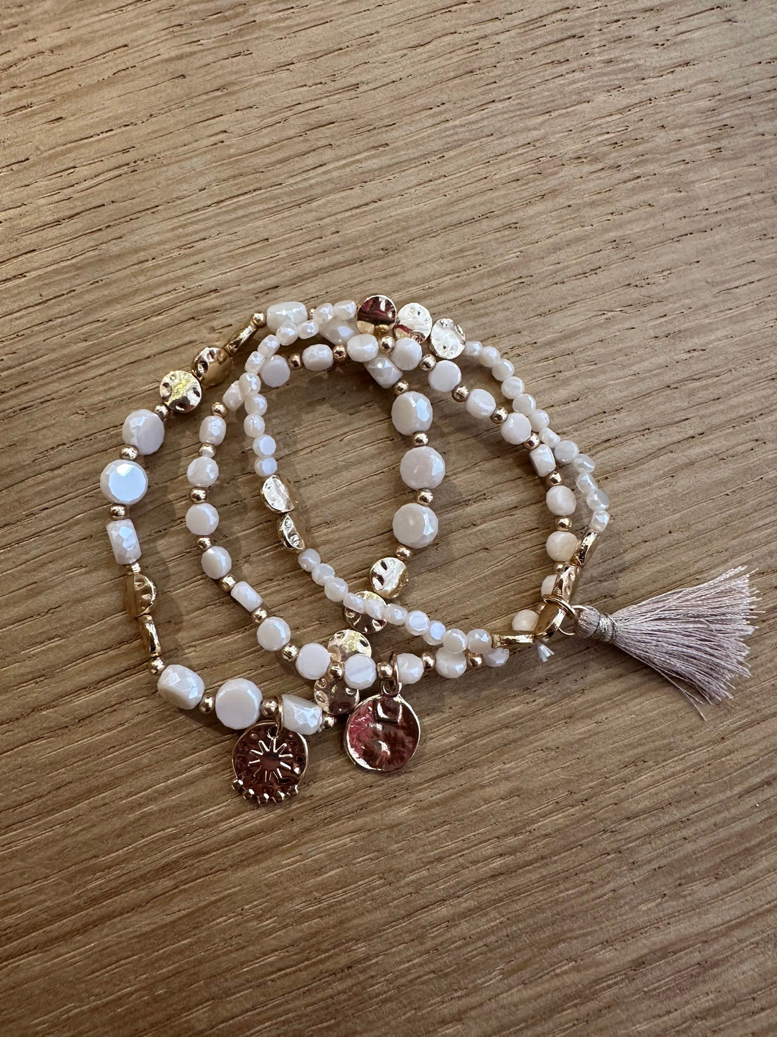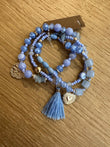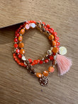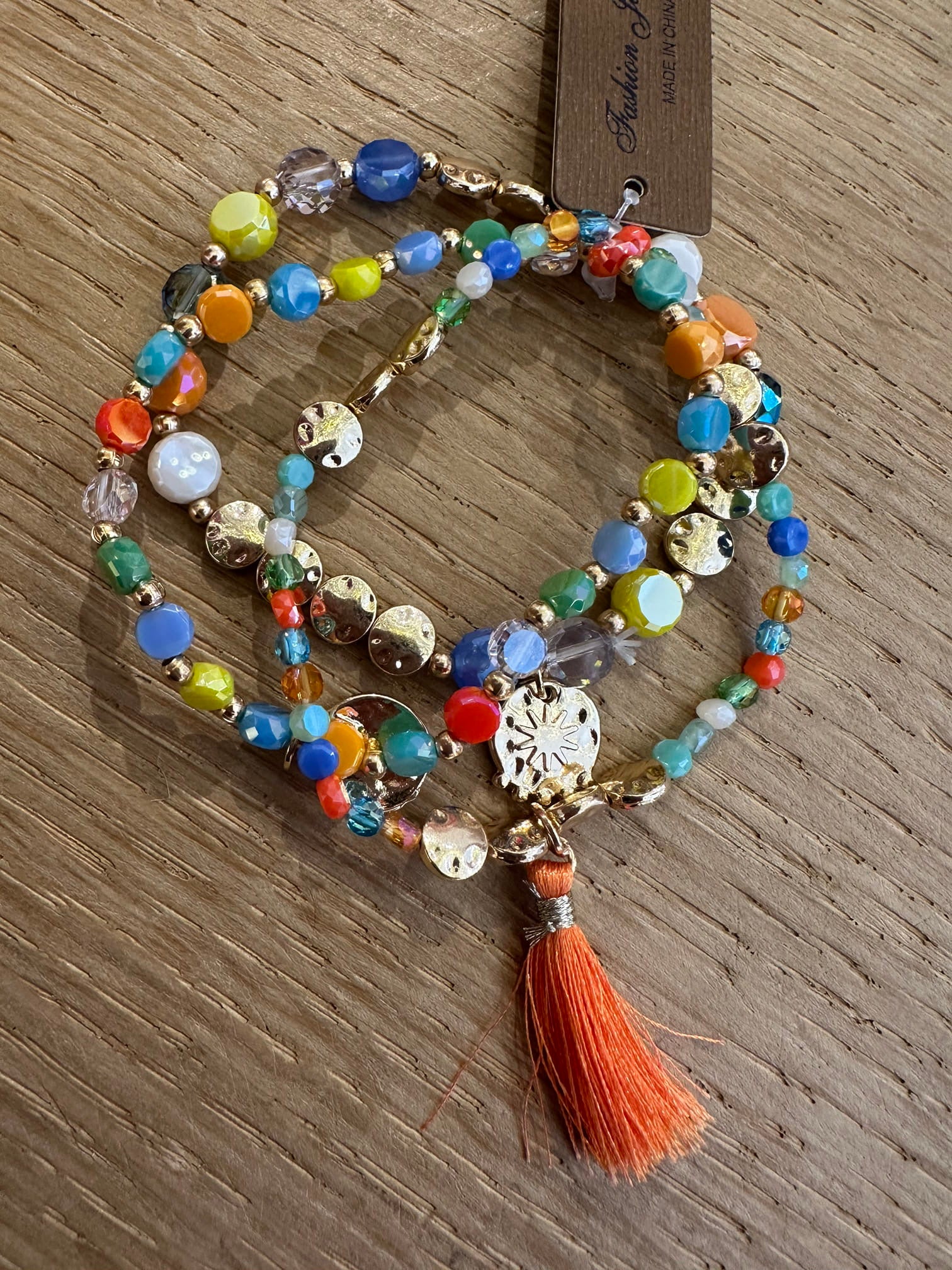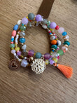 Bracciale composto da tre bracciali a fili elastici con palline colorate e charm oro nappine.