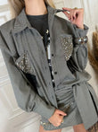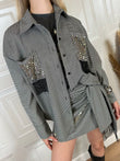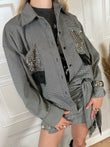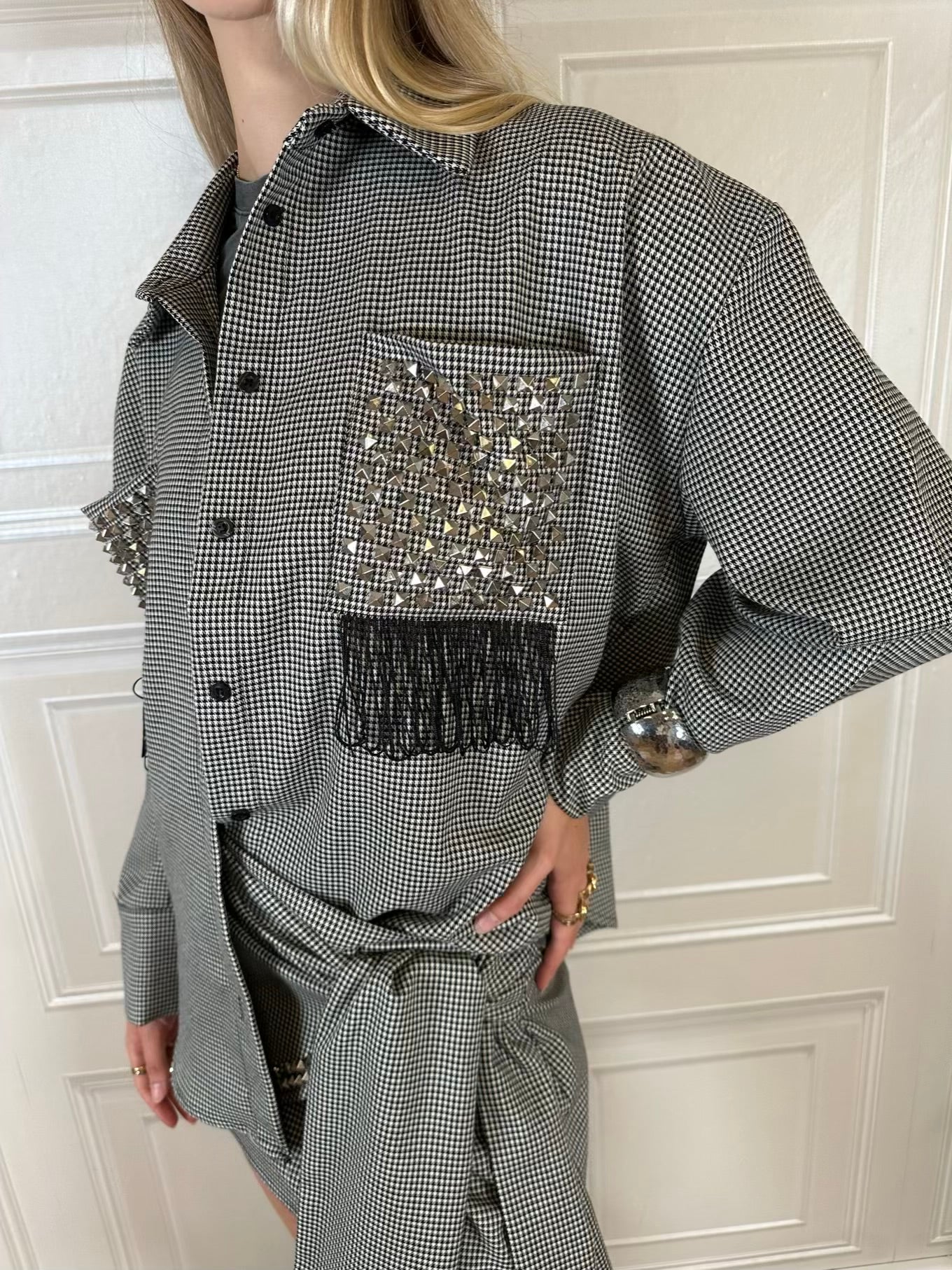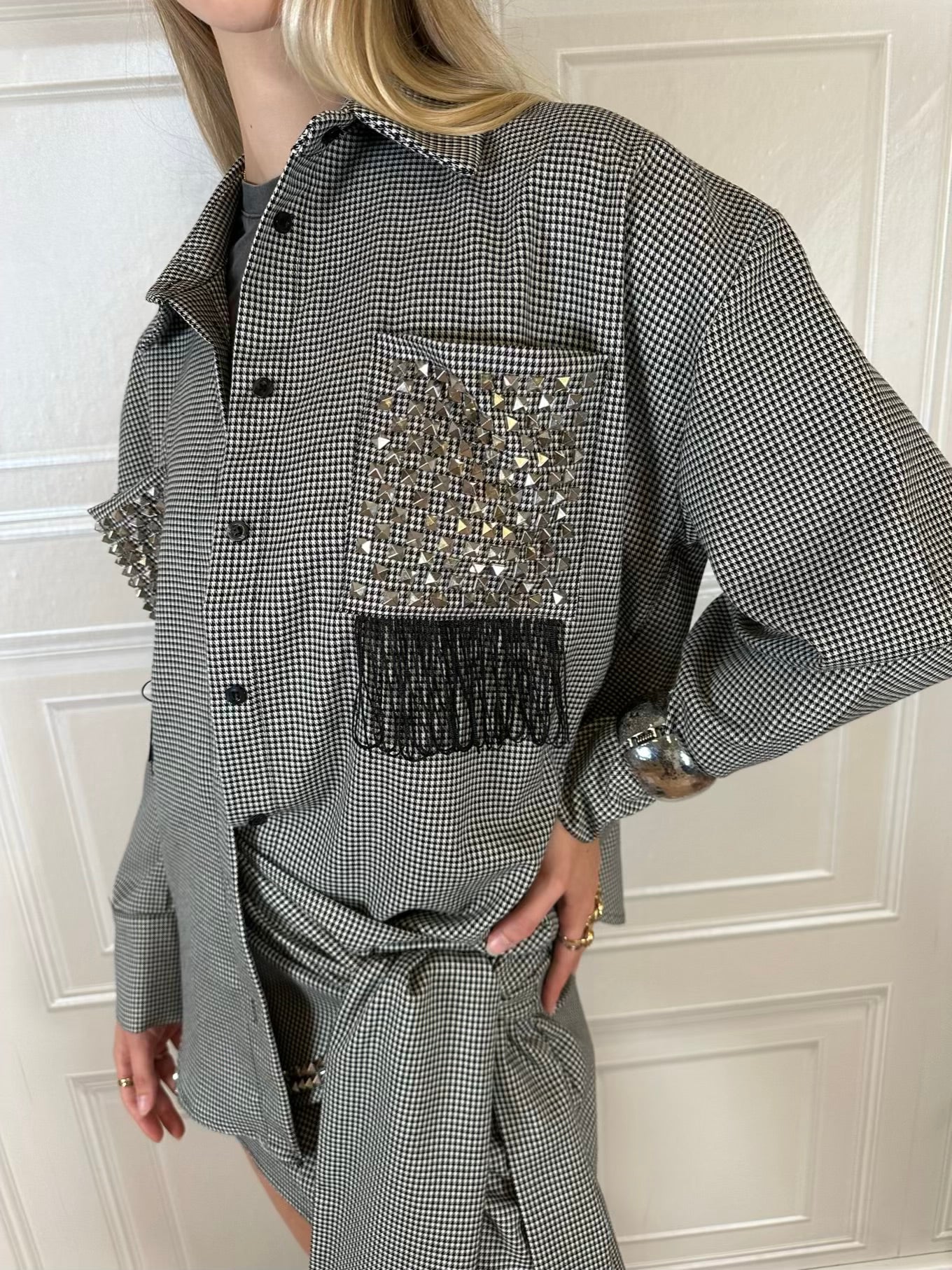 Camicia pied de poule sui toni del bianco e nero. Modello leggermente over con taschini frontali con applicazione di borchie e frange. Chiusura con bottoncini